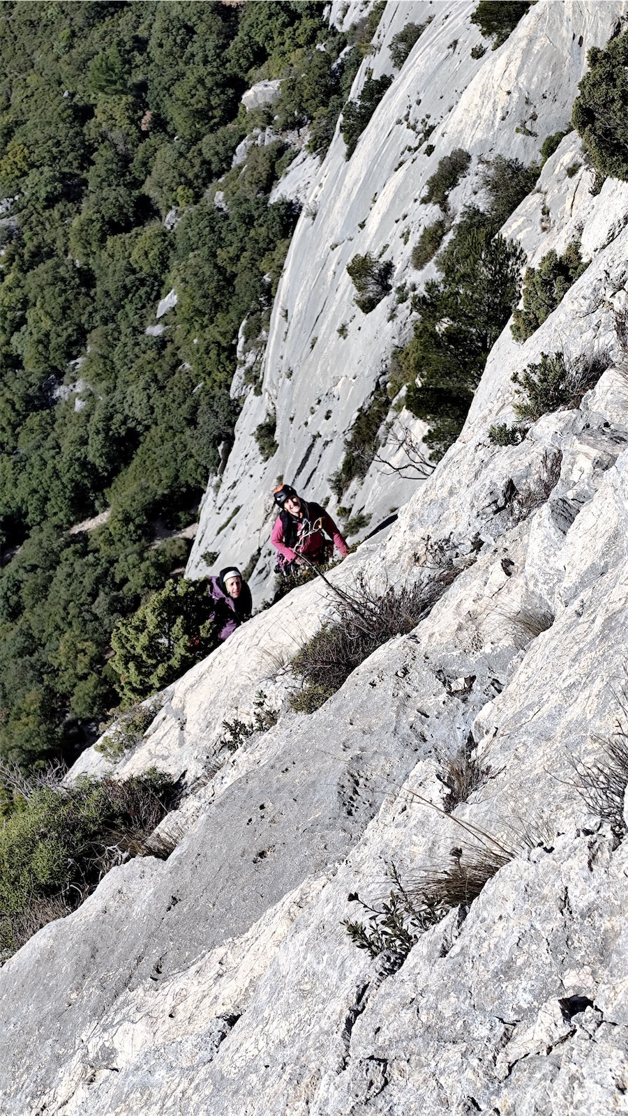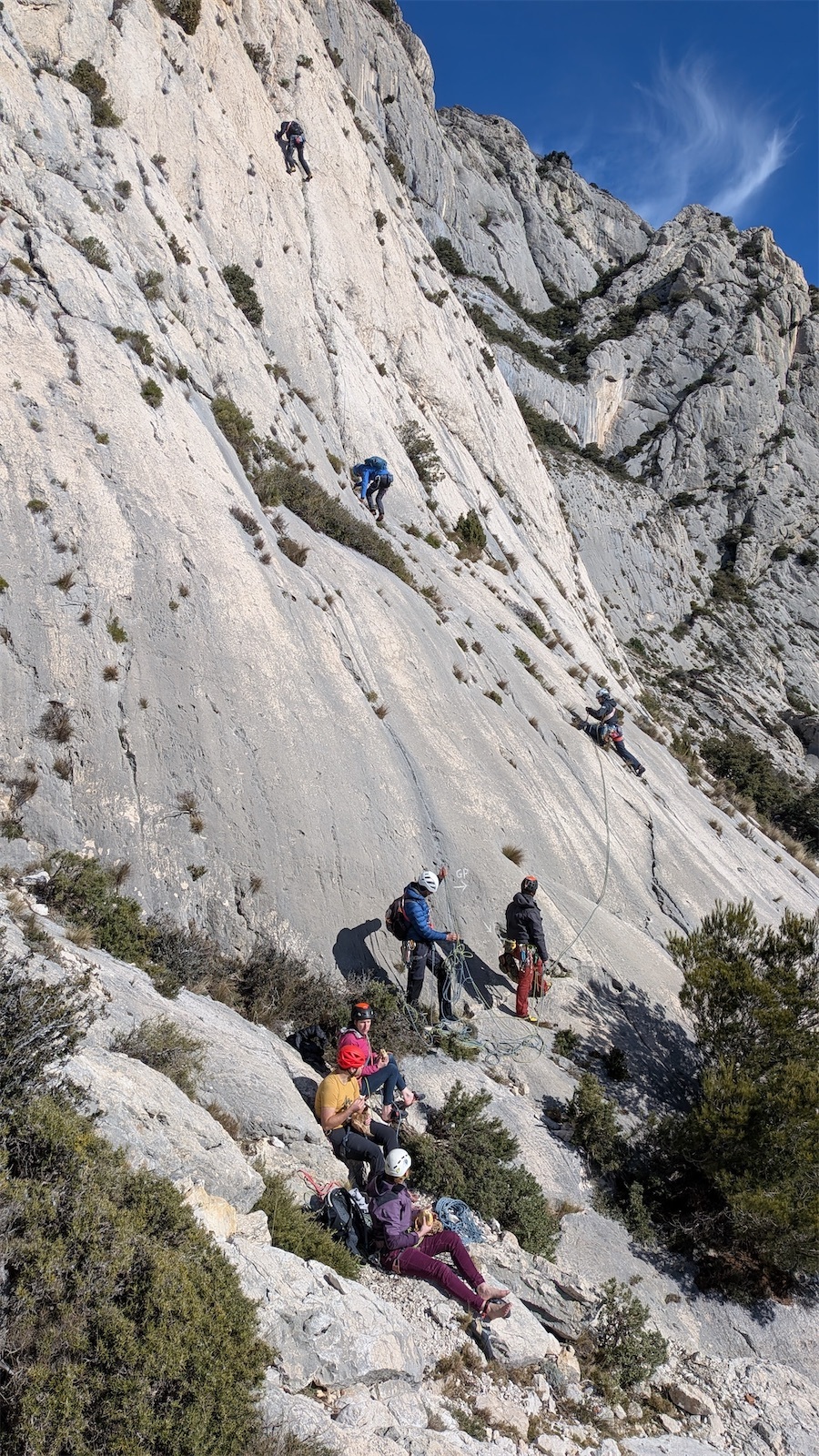 2 longueurs plus loin, on se retrouve avec Thibault sur une arête d’où j’ai la possibilité de redescendre à pied pour retrouver les autres cordées qui arrivent les unes après les autres au pied du 5b. Certains sont déjà bien fatigués, le mistral commence à bien forcir et ça parle de rebrousser chemin. Finalement, c’est Alexis qui relance la dynamique en repartant devant. Xav, en second, place des protections pour Sandrine qui suit en tête. Ça c’est l’esprit d’équipe !