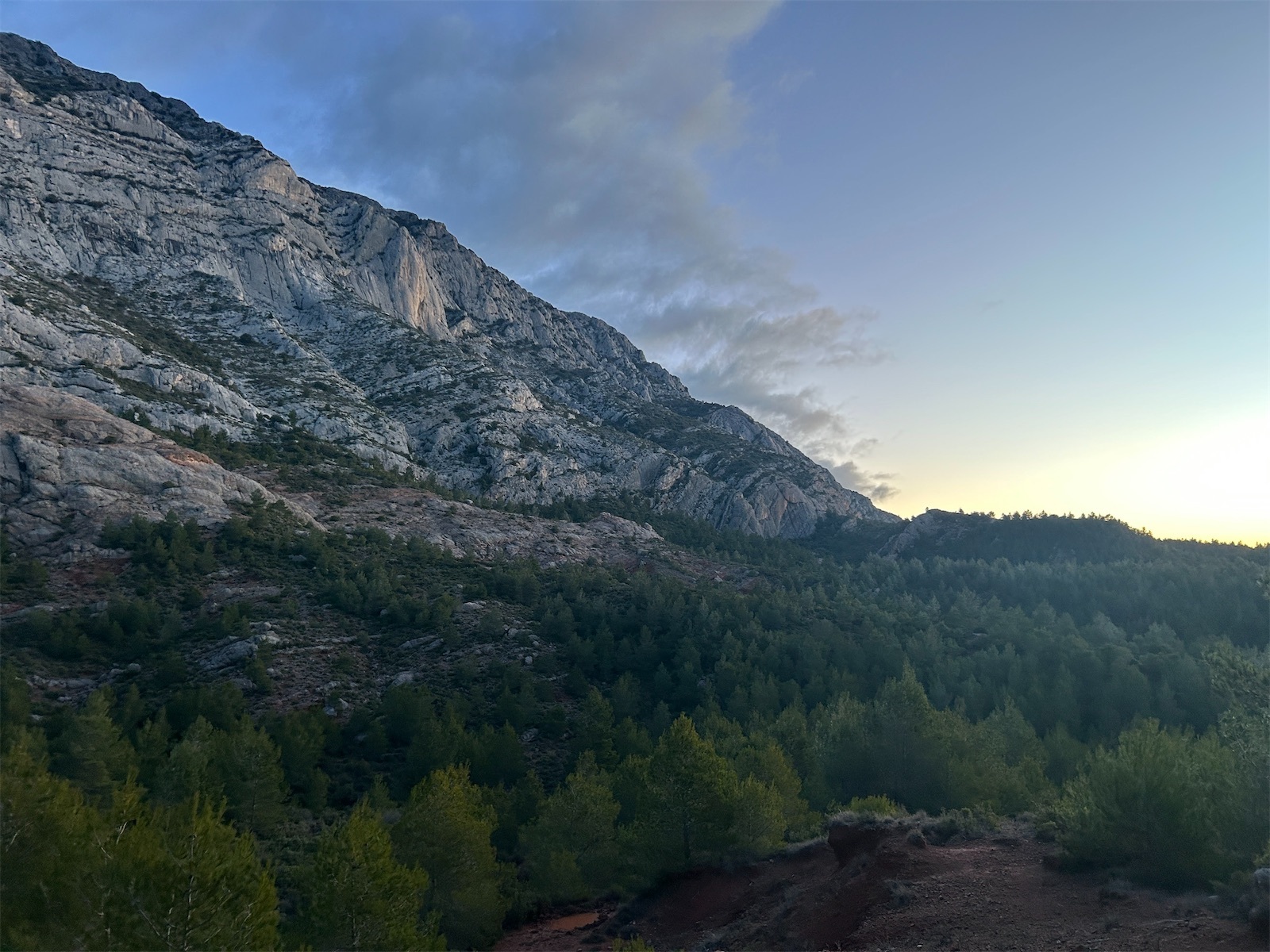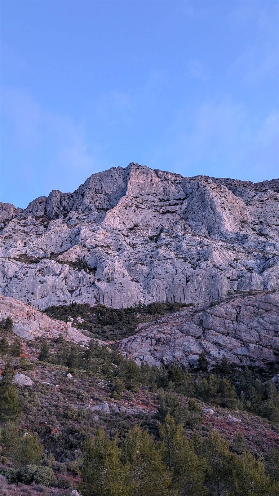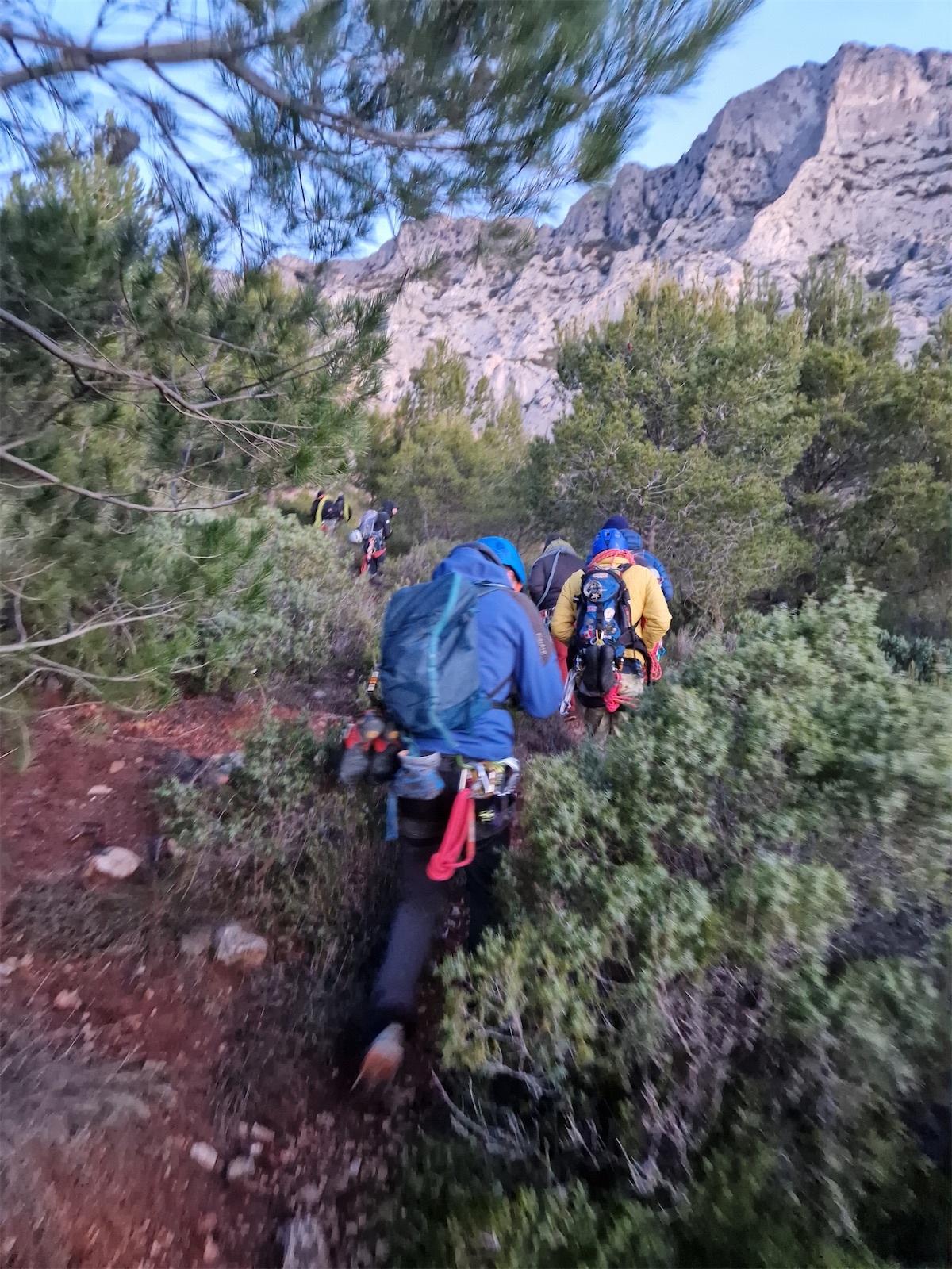 Le grand Parcours est une voie d’environ 14 longueurs qui grimpe l’ensemble de la montagne Sainte Victoire jusqu’à la crête sommitale au niveau de la paroi du signal. C’est un itinéraire d’ampleur en grande partie terrain d’aventure avec cotation max en 5c+/6a. Nous ne sommes pas certains d’avoir le temps d’arriver en haut, surtout avec 4 cordées qui se suivent ! Il va falloir partir tôt et être efficaces. Le parcours se divise en 3 tronçons avec des échappatoires plus ou moins faciles entre.