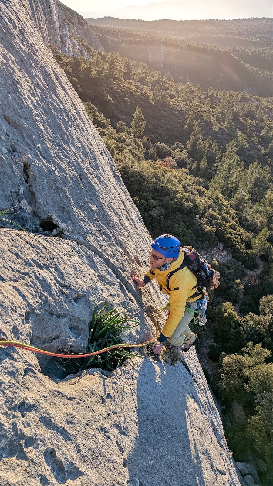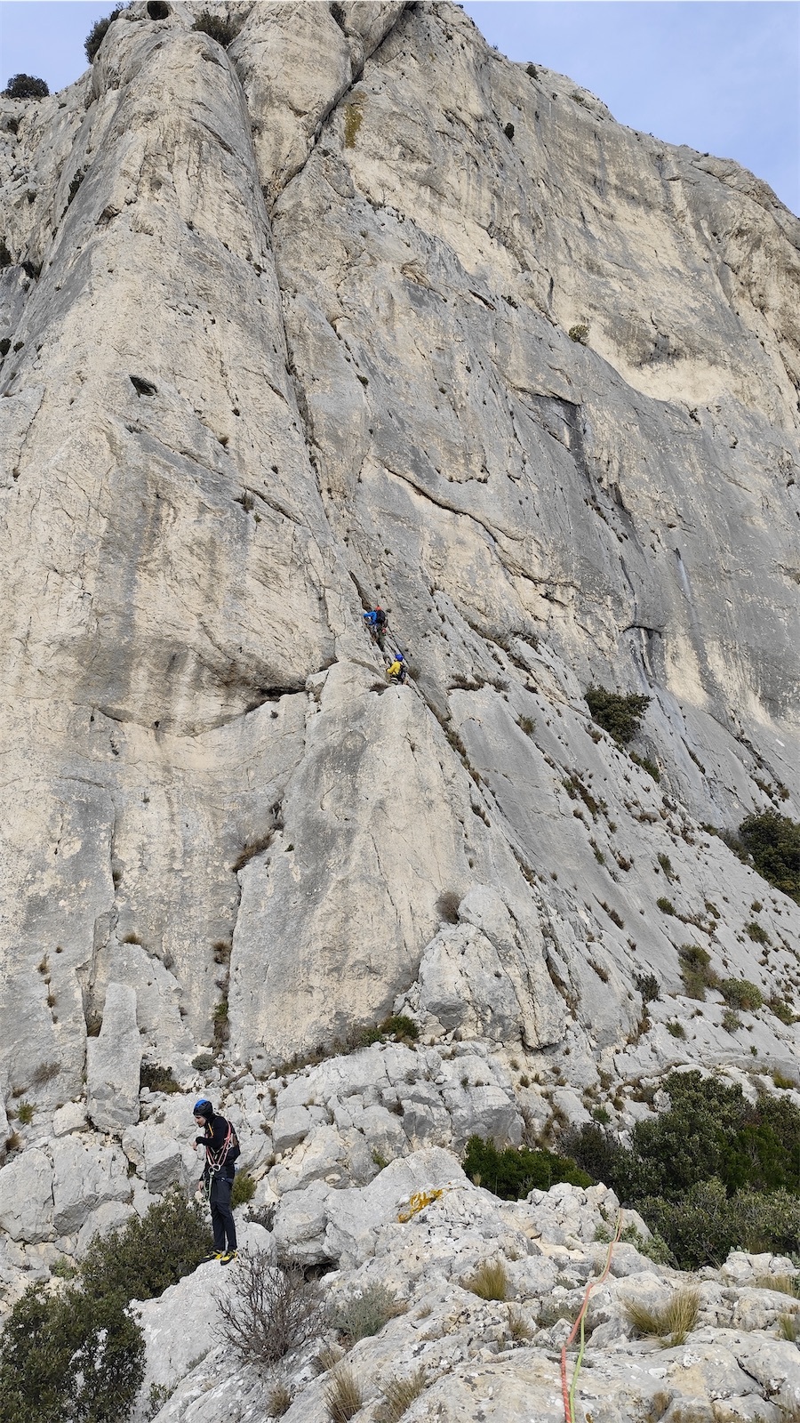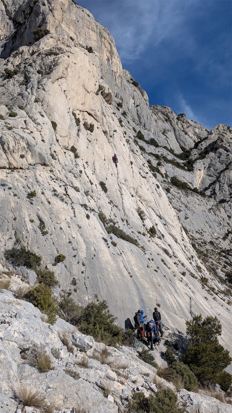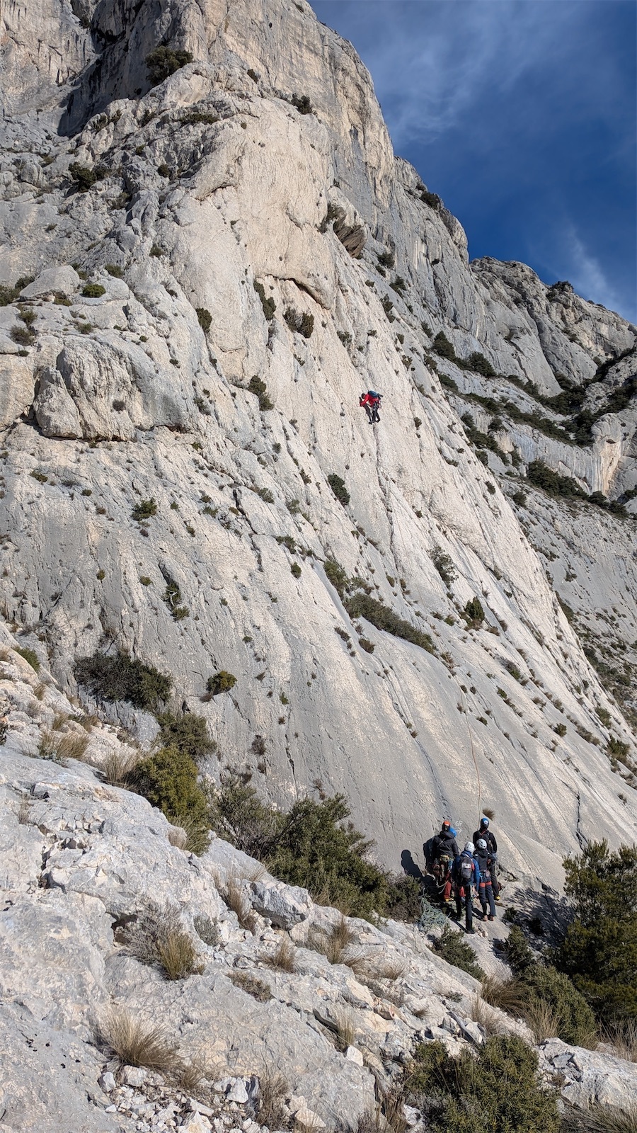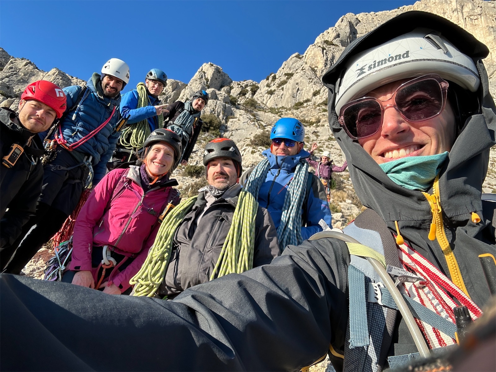 2 longueurs plus loin, on se retrouve avec Thibault sur une arête d’où j’ai la possibilité de redescendre à pied pour retrouver les autres cordées qui arrivent les unes après les autres au pied du 5b. Certains sont déjà bien fatigués, le mistral commence à bien forcir et ça parle de rebrousser chemin. Finalement, c’est Alexis qui relance la dynamique en repartant devant. Xav, en second, place des protections pour Sandrine qui suit en tête. Ça c’est l’esprit d’équipe !