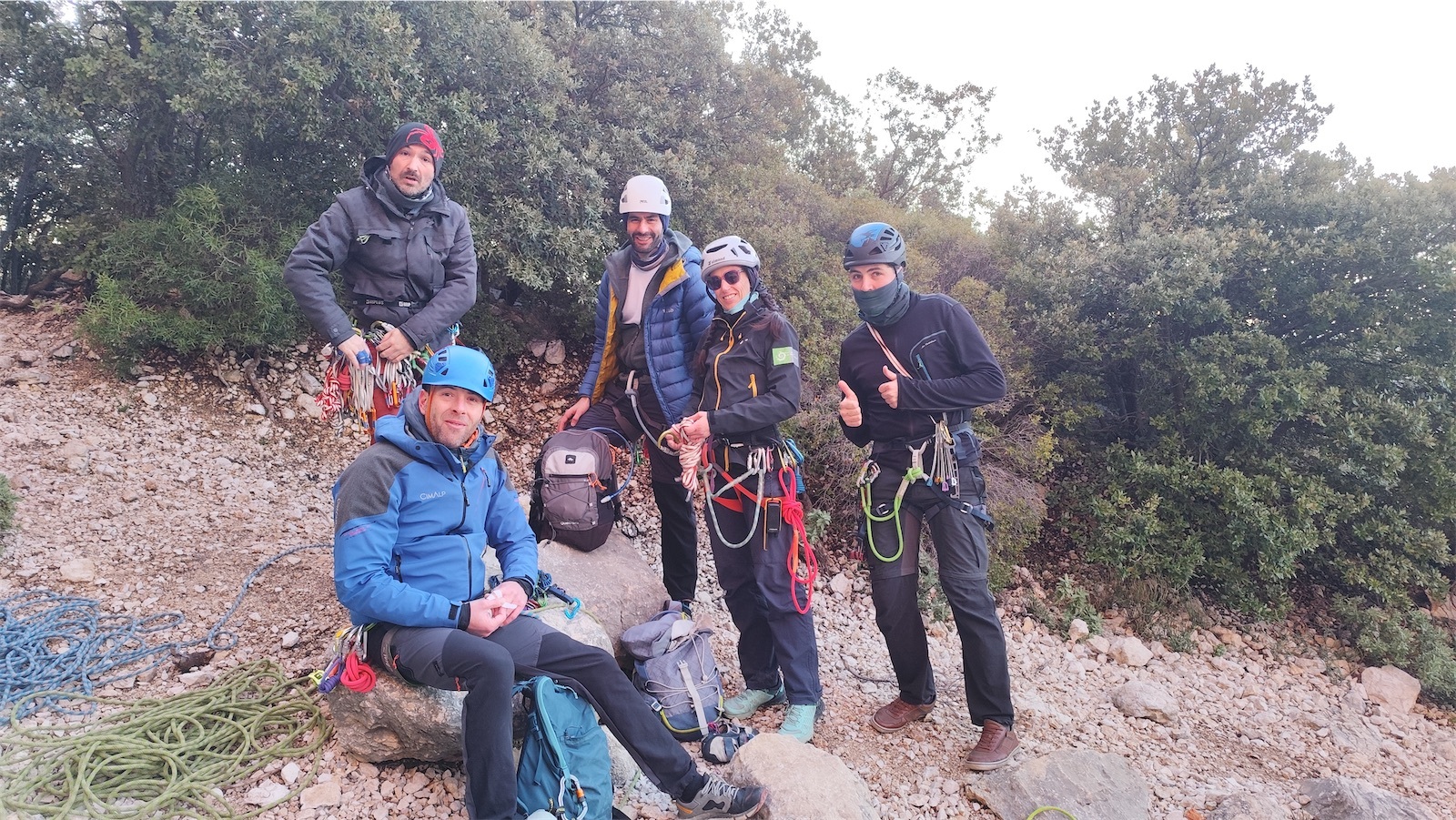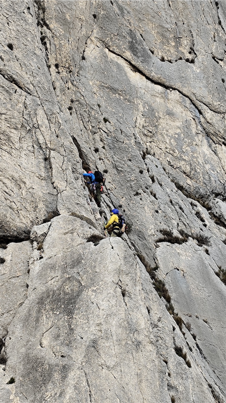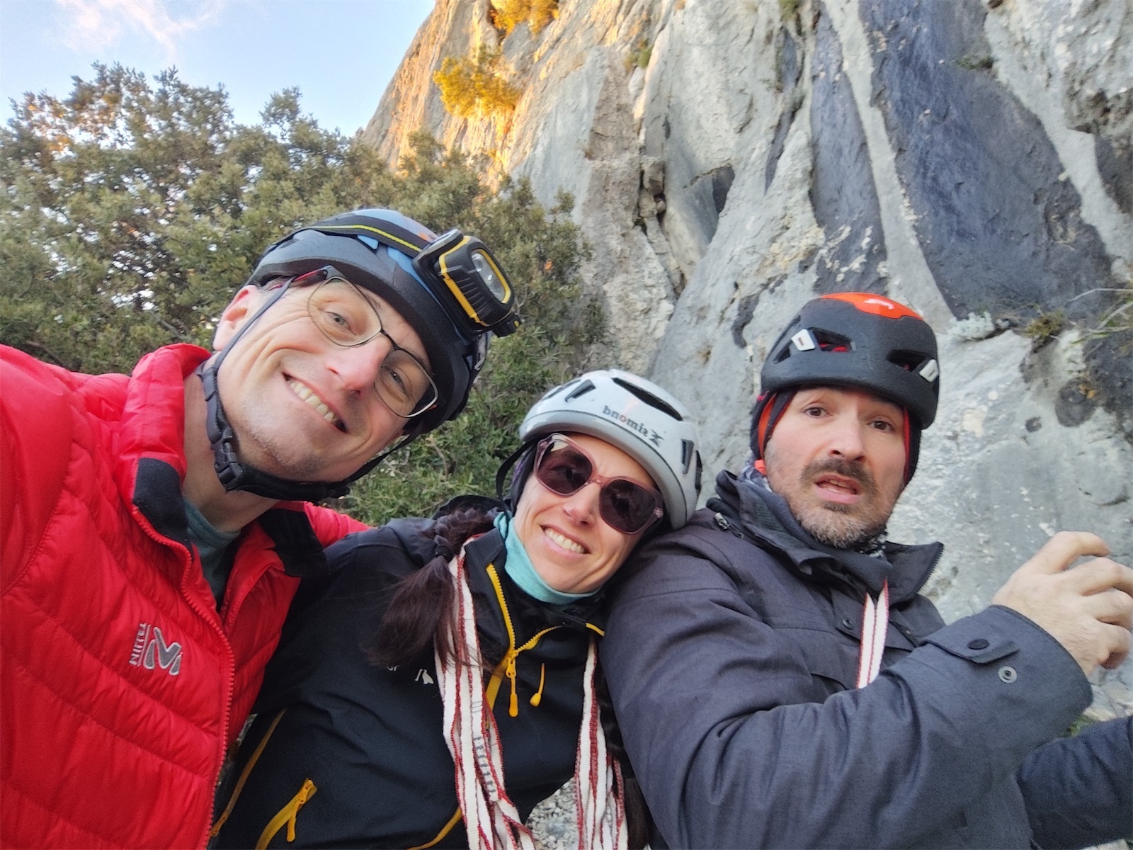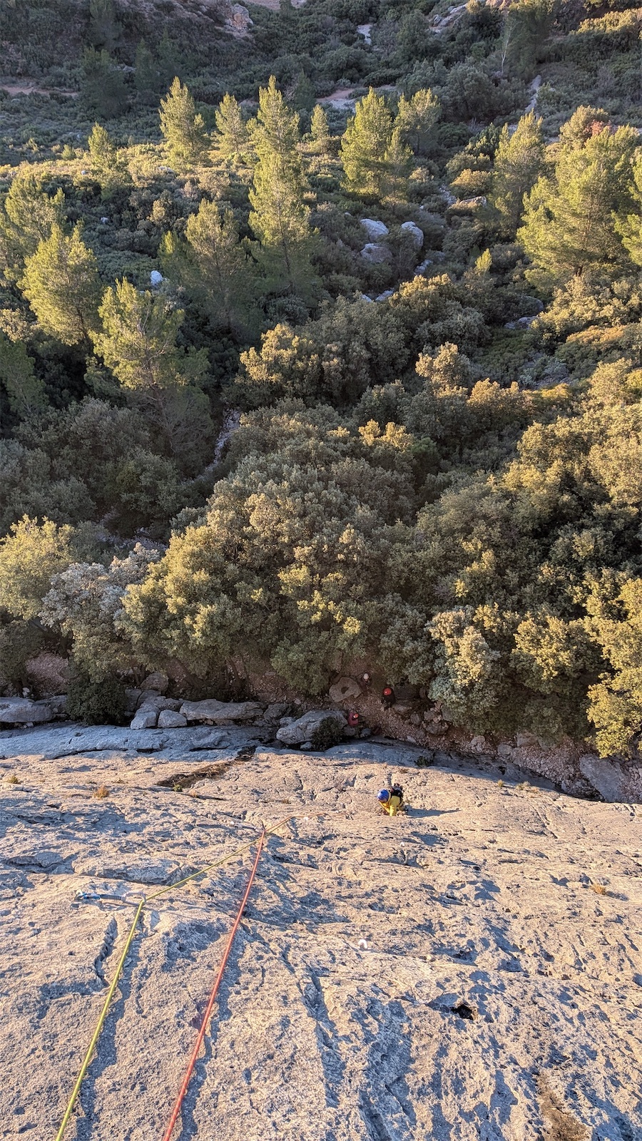2 longueurs plus loin, on se retrouve avec Thibault sur une arête d’où j’ai la possibilité de redescendre à pied pour retrouver les autres cordées qui arrivent les unes après les autres au pied du 5b. Certains sont déjà bien fatigués, le mistral commence à bien forcir et ça parle de rebrousser chemin. Finalement, c’est Alexis qui relance la dynamique en repartant devant. Xav, en second, place des protections pour Sandrine qui suit en tête. Ça c’est l’esprit d’équipe !