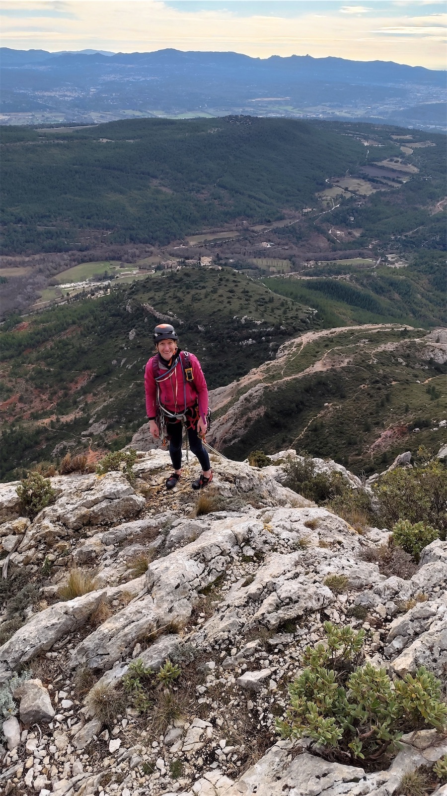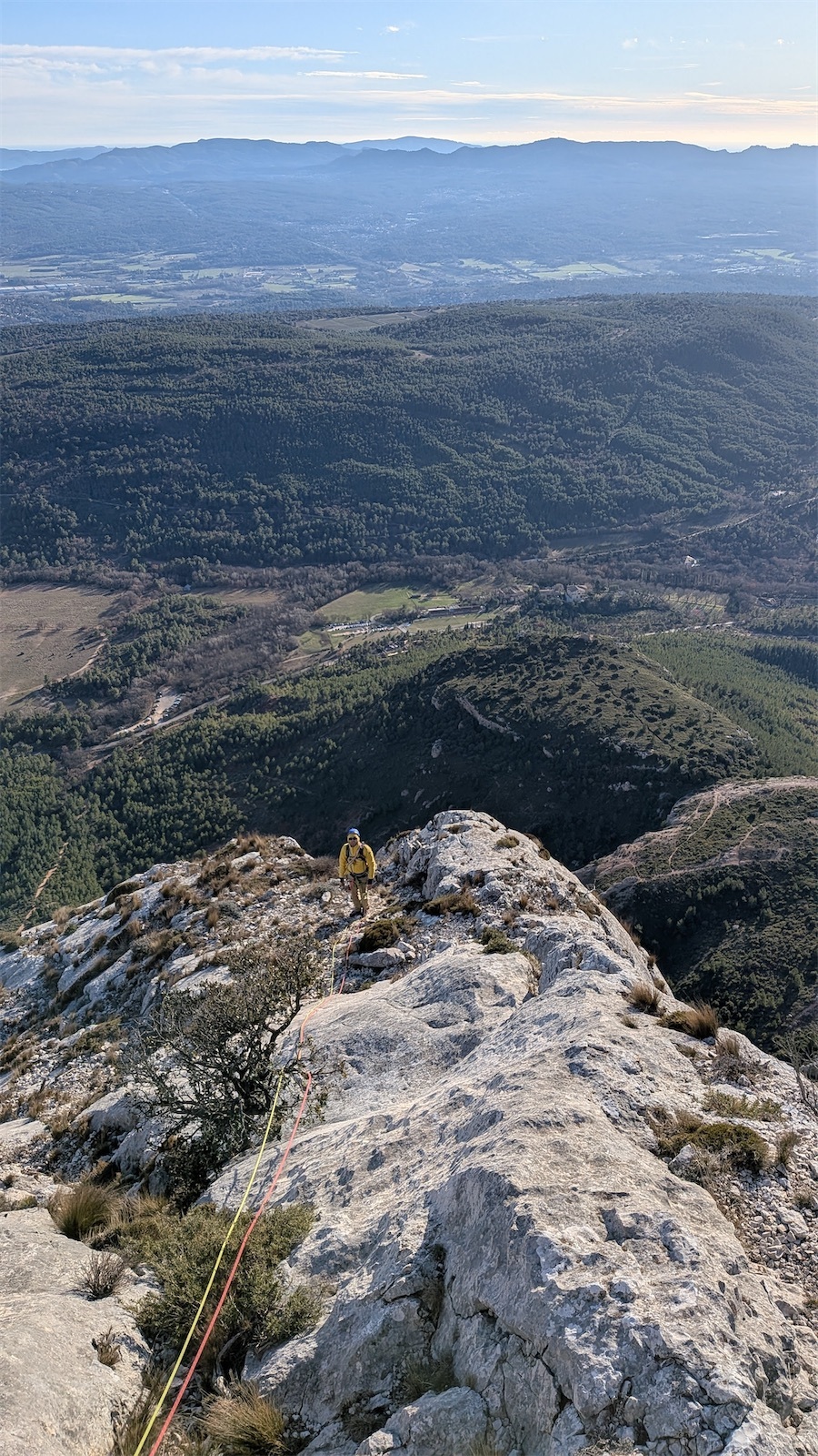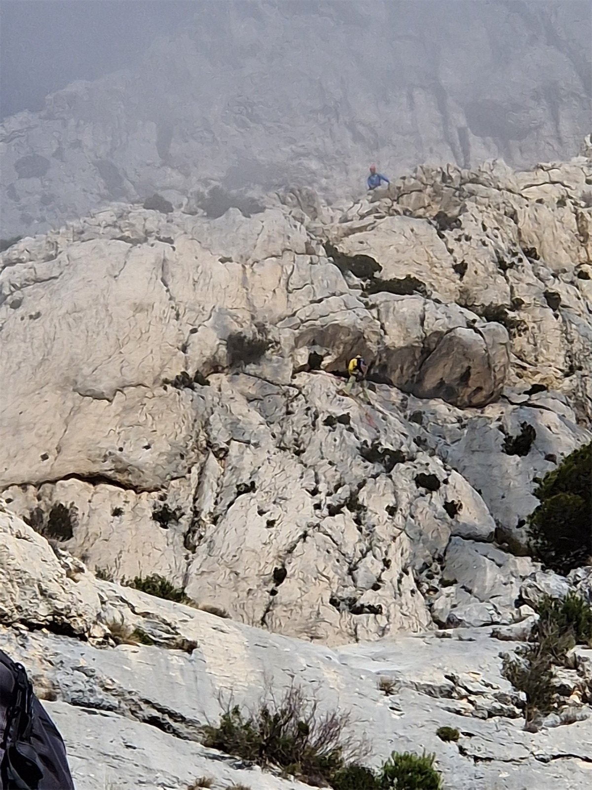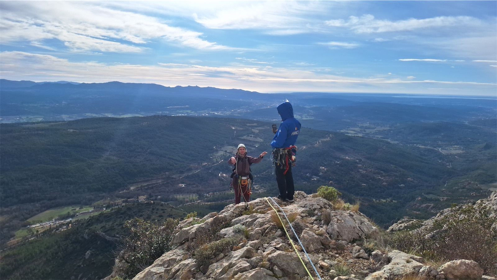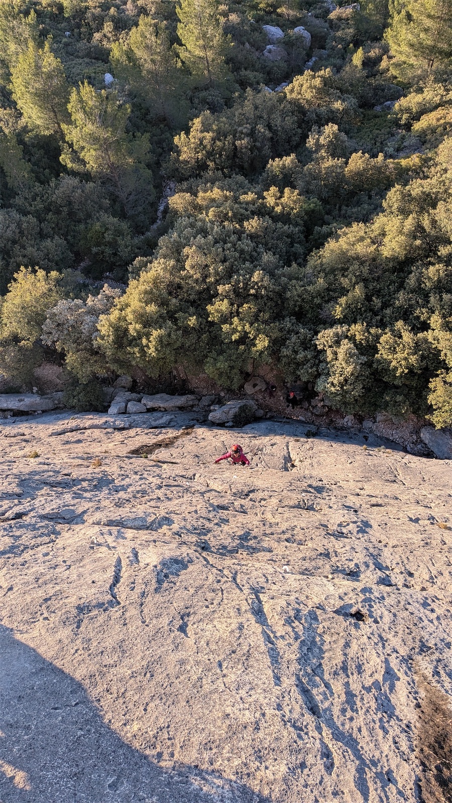 2 longueurs plus loin, on se retrouve avec Thibault sur une arête d’où j’ai la possibilité de redescendre à pied pour retrouver les autres cordées qui arrivent les unes après les autres au pied du 5b. Certains sont déjà bien fatigués, le mistral commence à bien forcir et ça parle de rebrousser chemin. Finalement, c’est Alexis qui relance la dynamique en repartant devant. Xav, en second, place des protections pour Sandrine qui suit en tête. Ça c’est l’esprit d’équipe !