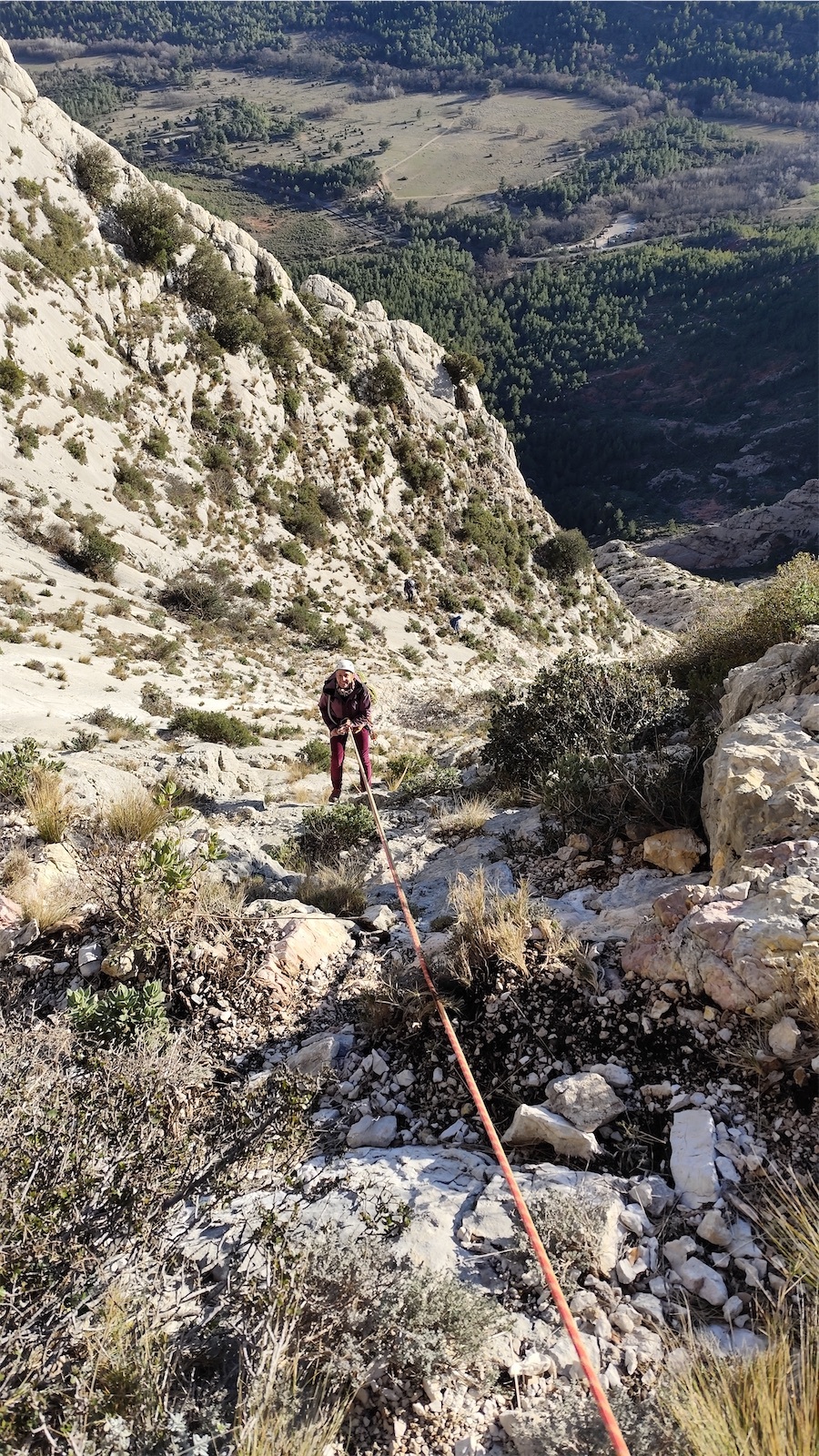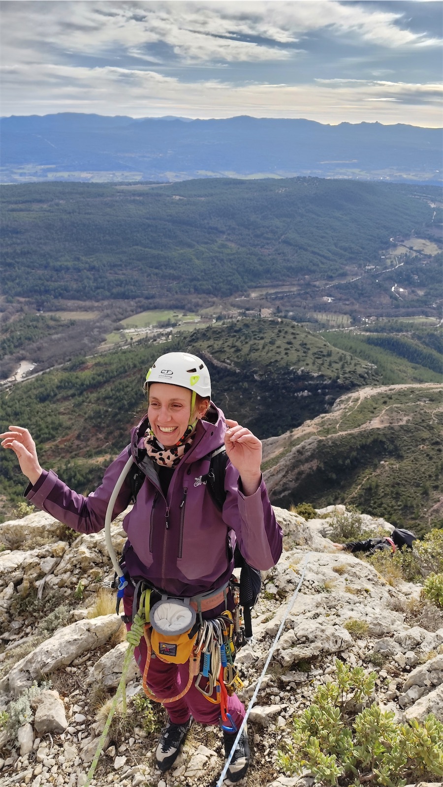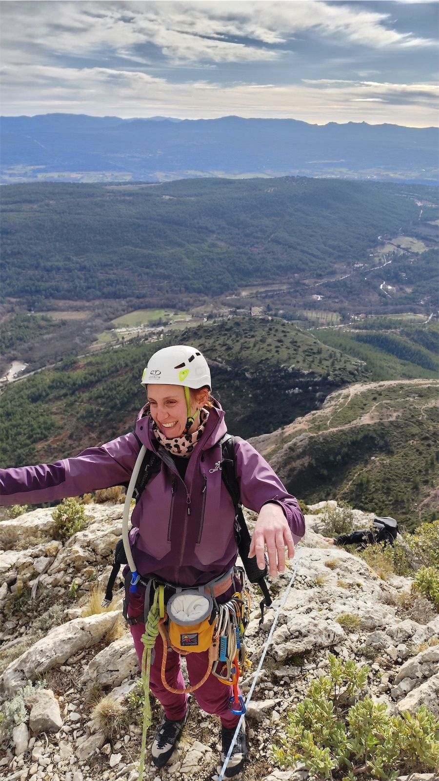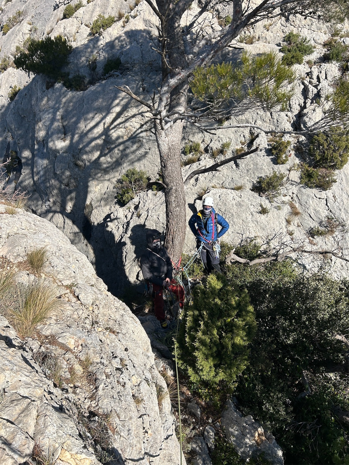 2 longueurs plus loin, on se retrouve avec Thibault sur une arête d’où j’ai la possibilité de redescendre à pied pour retrouver les autres cordées qui arrivent les unes après les autres au pied du 5b. Certains sont déjà bien fatigués, le mistral commence à bien forcir et ça parle de rebrousser chemin. Finalement, c’est Alexis qui relance la dynamique en repartant devant. Xav, en second, place des protections pour Sandrine qui suit en tête. Ça c’est l’esprit d’équipe !