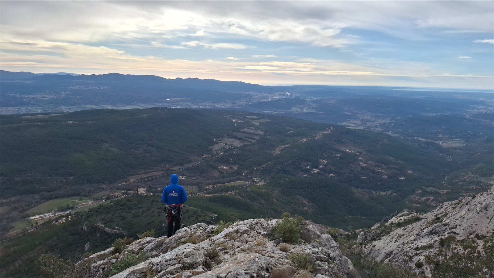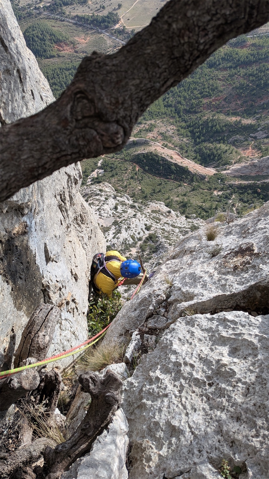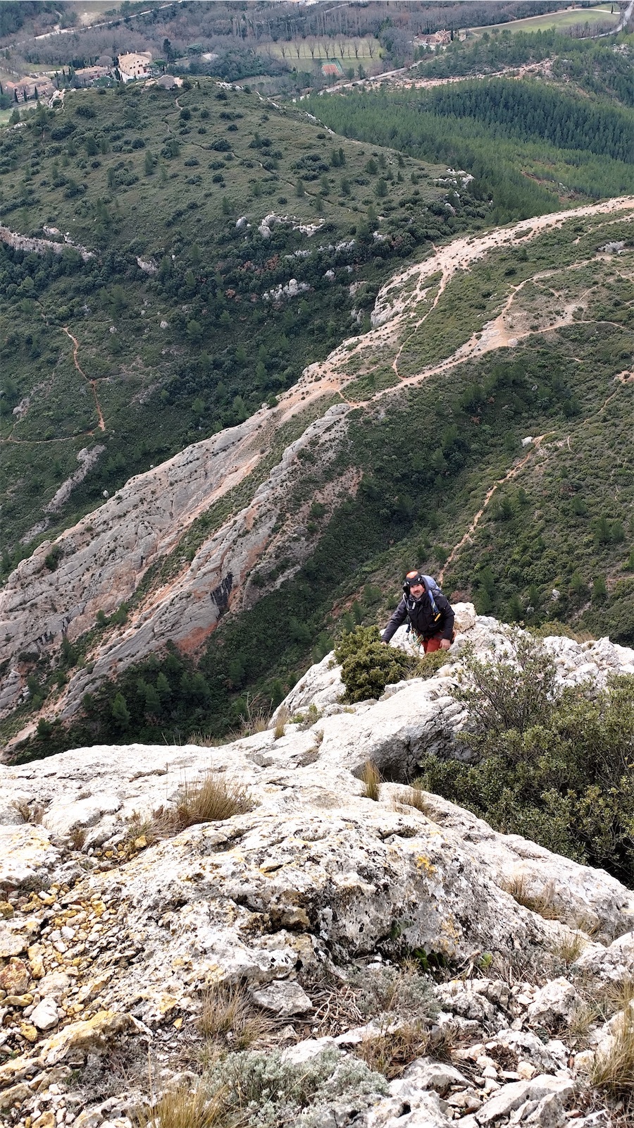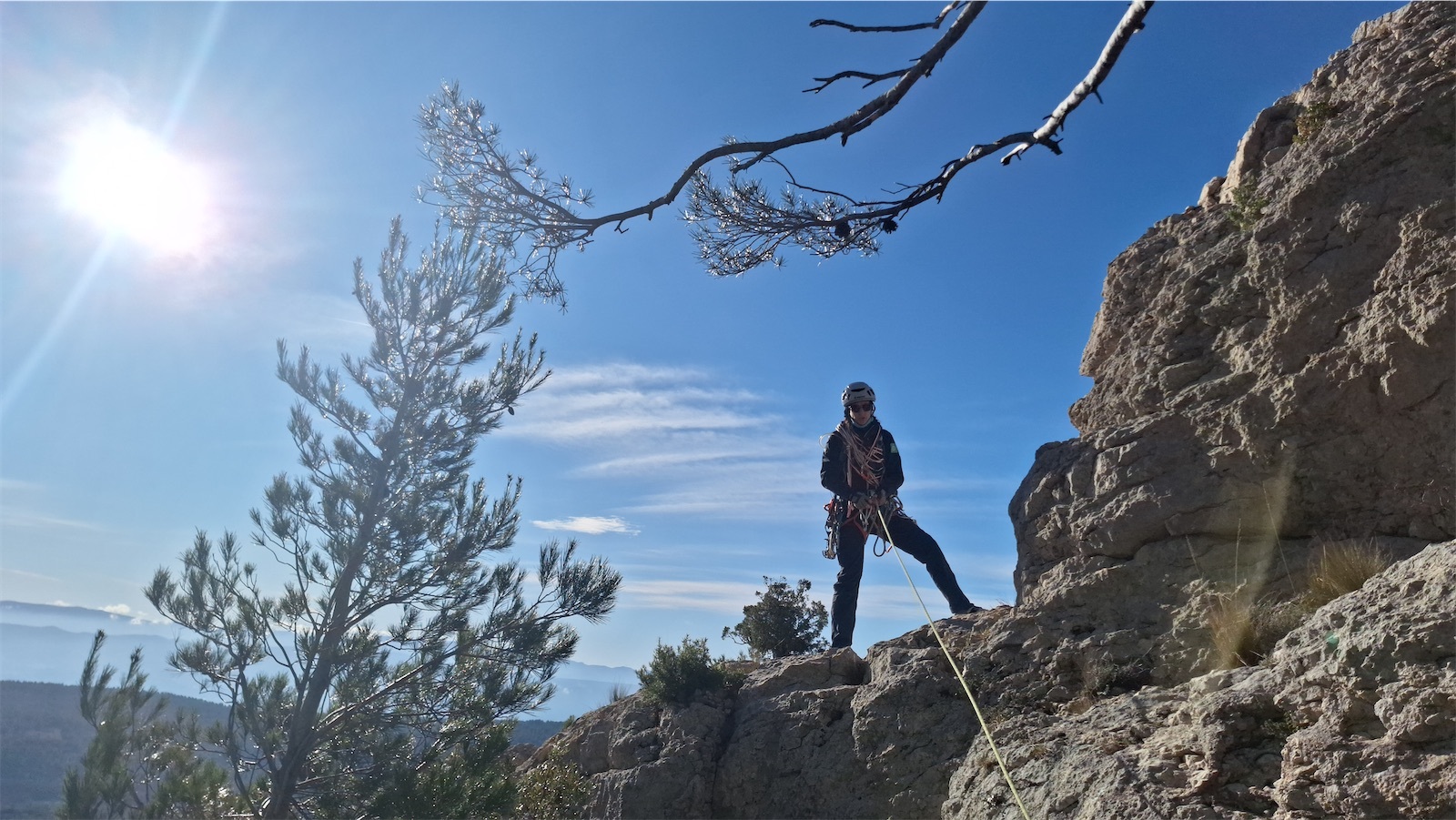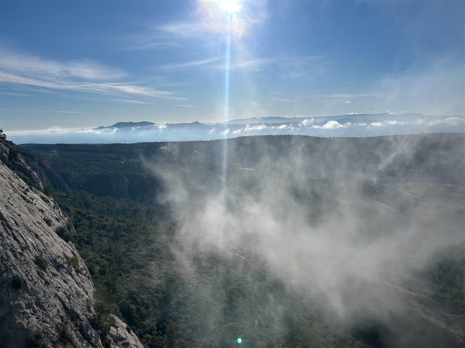 2 longueurs plus loin, on se retrouve avec Thibault sur une arête d’où j’ai la possibilité de redescendre à pied pour retrouver les autres cordées qui arrivent les unes après les autres au pied du 5b. Certains sont déjà bien fatigués, le mistral commence à bien forcir et ça parle de rebrousser chemin. Finalement, c’est Alexis qui relance la dynamique en repartant devant. Xav, en second, place des protections pour Sandrine qui suit en tête. Ça c’est l’esprit d’équipe !