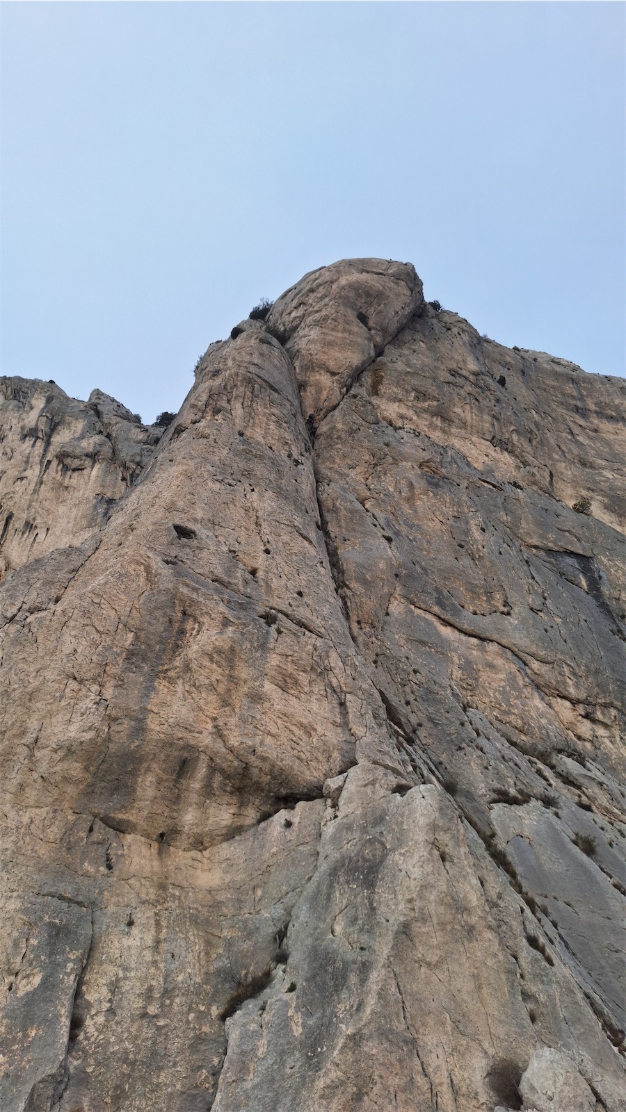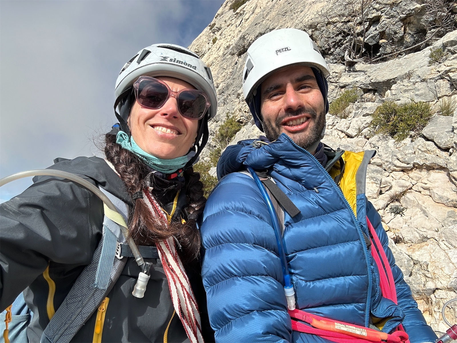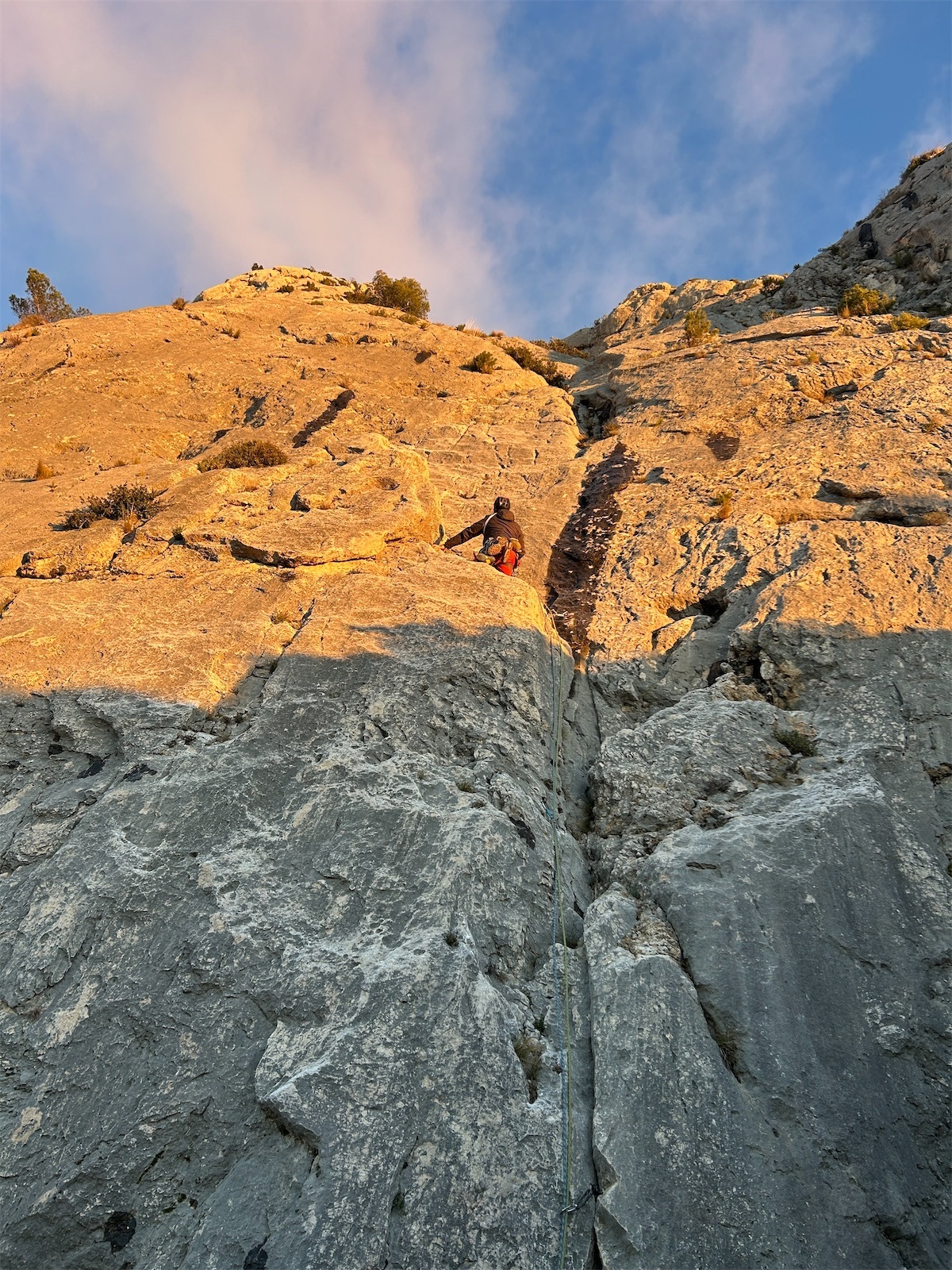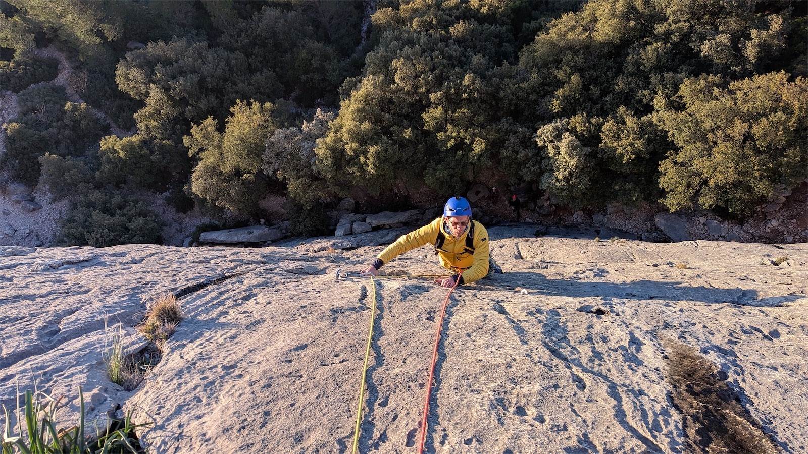 2 longueurs plus loin, on se retrouve avec Thibault sur une arête d’où j’ai la possibilité de redescendre à pied pour retrouver les autres cordées qui arrivent les unes après les autres au pied du 5b. Certains sont déjà bien fatigués, le mistral commence à bien forcir et ça parle de rebrousser chemin. Finalement, c’est Alexis qui relance la dynamique en repartant devant. Xav, en second, place des protections pour Sandrine qui suit en tête. Ça c’est l’esprit d’équipe !