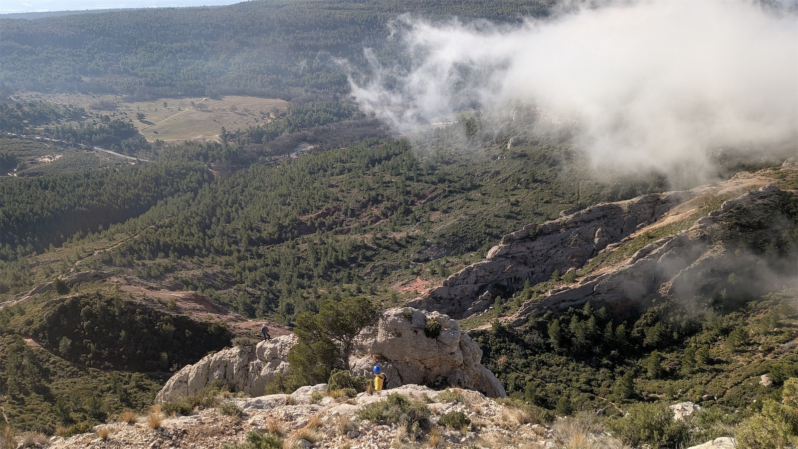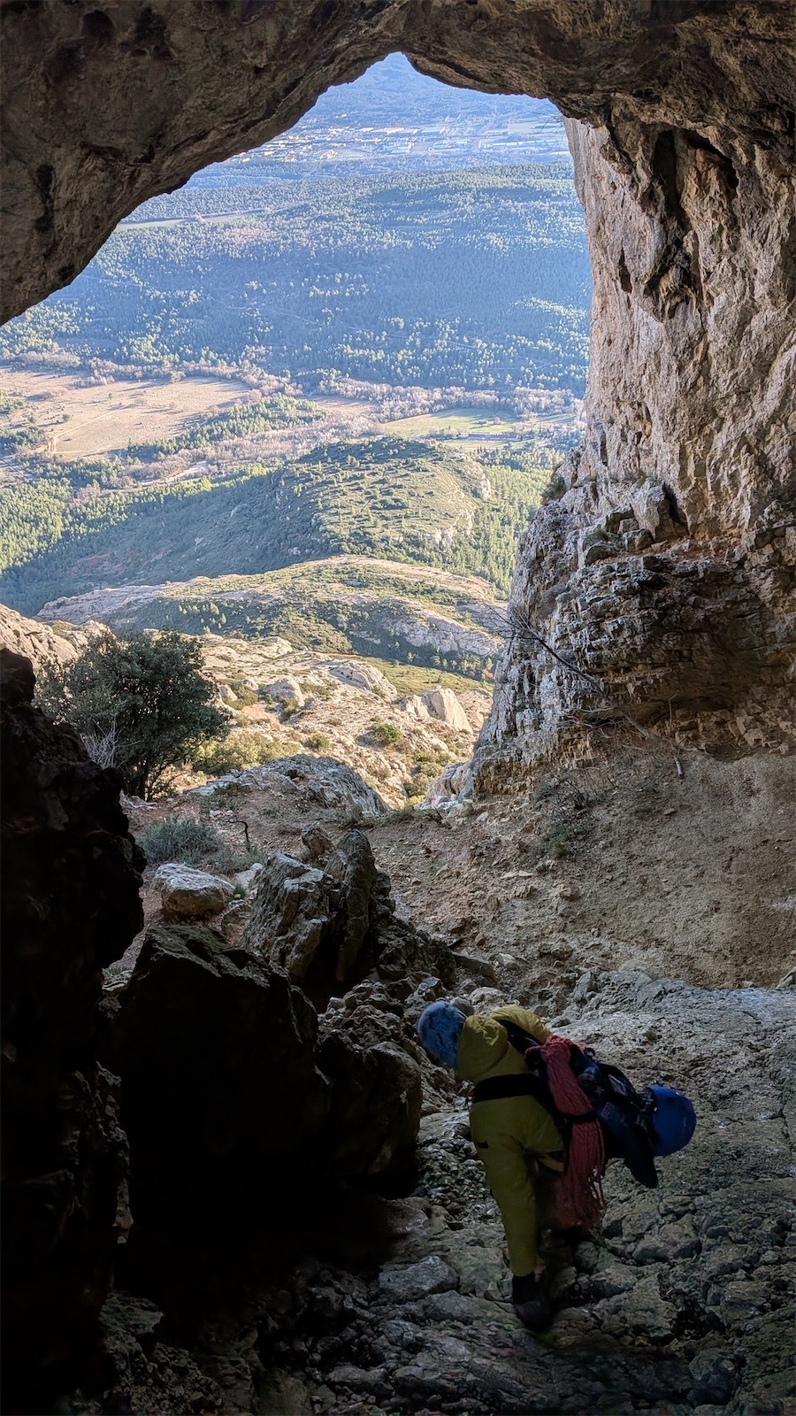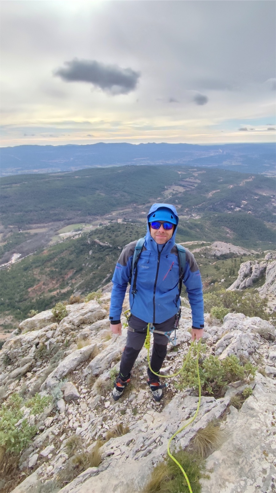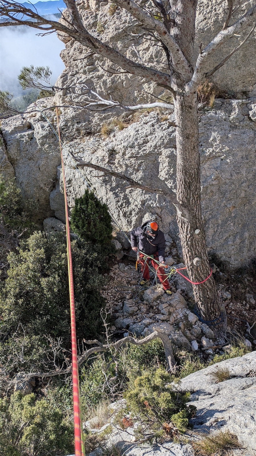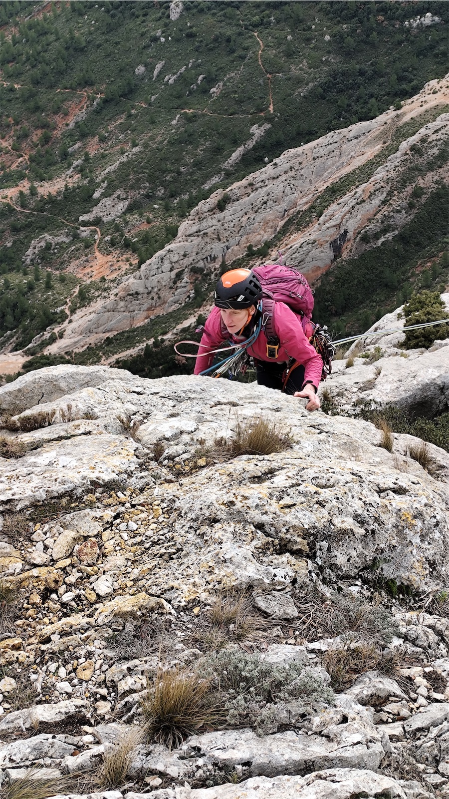2 longueurs plus loin, on se retrouve avec Thibault sur une arête d’où j’ai la possibilité de redescendre à pied pour retrouver les autres cordées qui arrivent les unes après les autres au pied du 5b. Certains sont déjà bien fatigués, le mistral commence à bien forcir et ça parle de rebrousser chemin. Finalement, c’est Alexis qui relance la dynamique en repartant devant. Xav, en second, place des protections pour Sandrine qui suit en tête. Ça c’est l’esprit d’équipe !