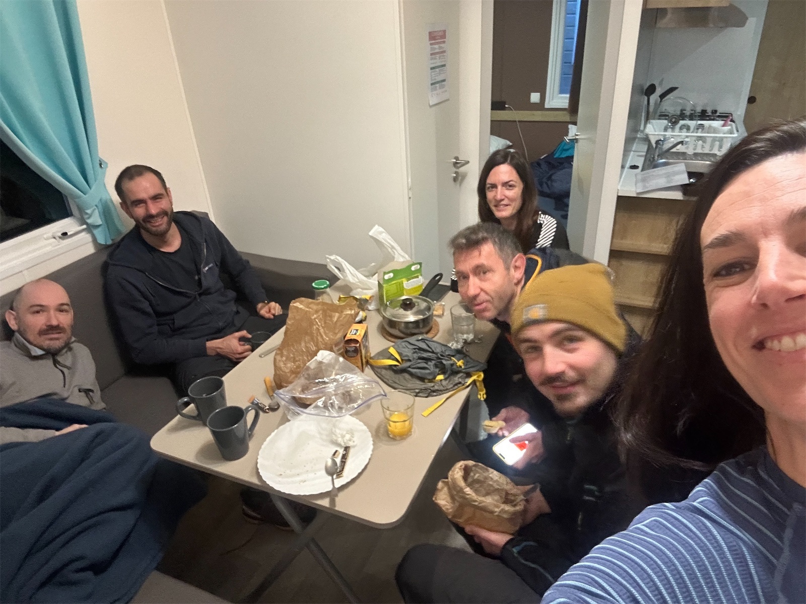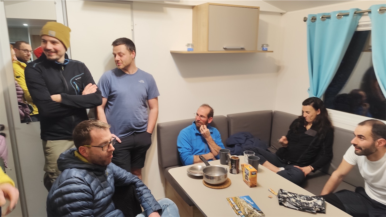 Pour la première partie, on décide de se séparer en deux groupes : 2 cordées iront dans le Grand Parcours tandis que 2 cordées grimperont par une autre voie (les masques de pierre) pour se retrouver au sommet de l’aiguille Bertine avec un décalage qui devrait améliorer la fluidité globale. Nous voilà fin prêts, retour aux bungalows pour préparer les sacs et pour nous coucher tôt : départ à 6h30 !