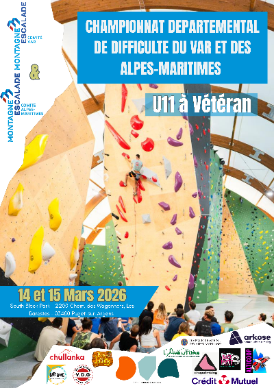 Le championnat départemental de difficulté des Alpes Maritimes se déroulera dans le Var (oui !) à Puget-sur-Argens dans la salle South Block Park le weekend du 14 et 15 mars.