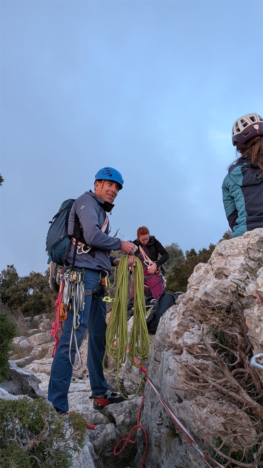 Et c’est là que j’entends Jean au talkie qui nous annonce qu’il s’est fait mal au genou et qu’il n’arrive plus à pousser sur la jambe ! Pas de panique, Alexis est là pour le remonter jusqu’au relais. J’abandonne Matthieu pour aller les retrouver moyennant un petit rappel. J’embarque Jean avec moi que je traîne jusqu’au sommet.