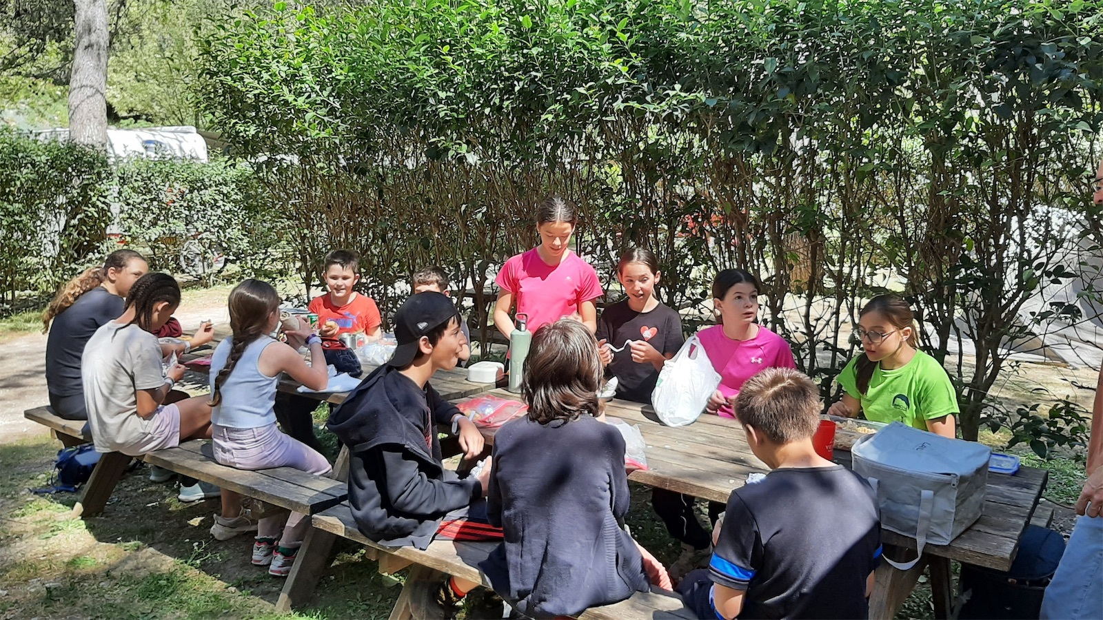 Après un trajet sans encombre et nos emplacements attribués, le petit groupe s’affaire au montage du camp : tentes, barnum, cuisine, tout doit rentrer dans l’espace qui nous est aloué. Pas de problème cette année, on a beaucoup de place, et de grandes tables de pique-nique ! A 13h, tout est fin prêt pour le premier repas que les jeunes avalent rapidement. Maintenant, il s’agit d’aller grimper.