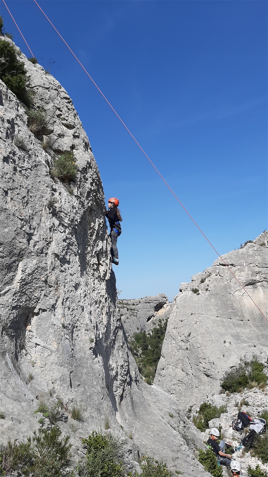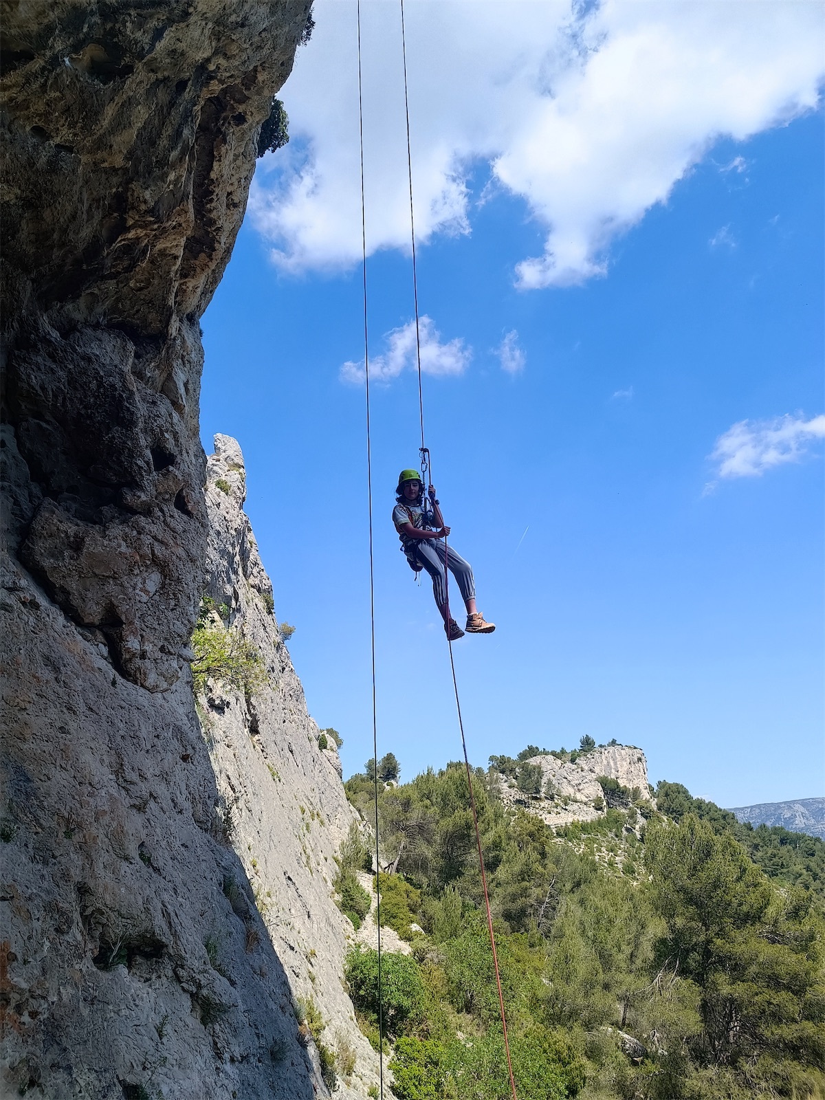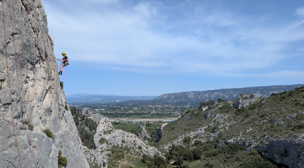 Jules, Anton et Elise ne sont pas en reste et ancrent leurs connaissance de la semaine en grimpant et assurant en tête. Après le repas, on profite des dernières heures pour installer un grand rappel pendulaire au sommet d’une grotte où les jeunes passeront les uns après les autres, avec plus ou moins d’aisance : final en beauté !