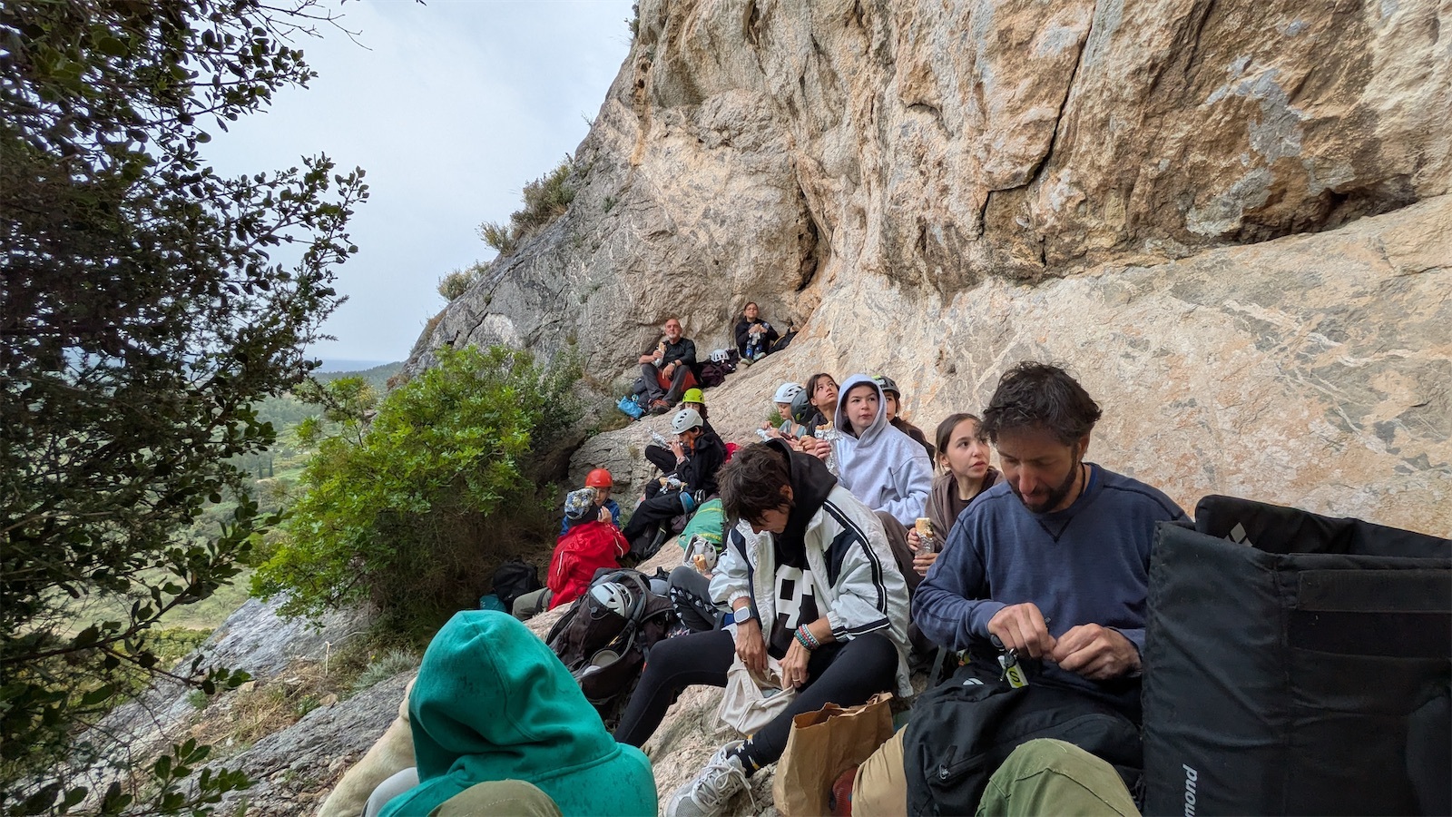 Le mercredi, la météo est maussade. De la pluie est prévue en fin de matinée ou dans l’après-midi suivant les modèles. On essaie de se préparer rapidement mais c’est sans compter la tente de Mélia, Romane, Elise et Rose qui aime bien se faire attendre… Pas de soleil aujourd’hui, on décide d’aller sur le joli secteur d’Aureille, une face sud à 20 minutes en voiture. Nous sommes au pied de la falaise à 10h.