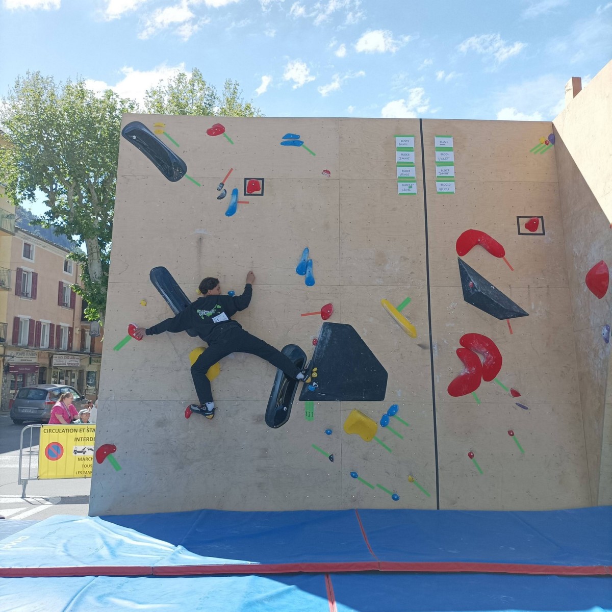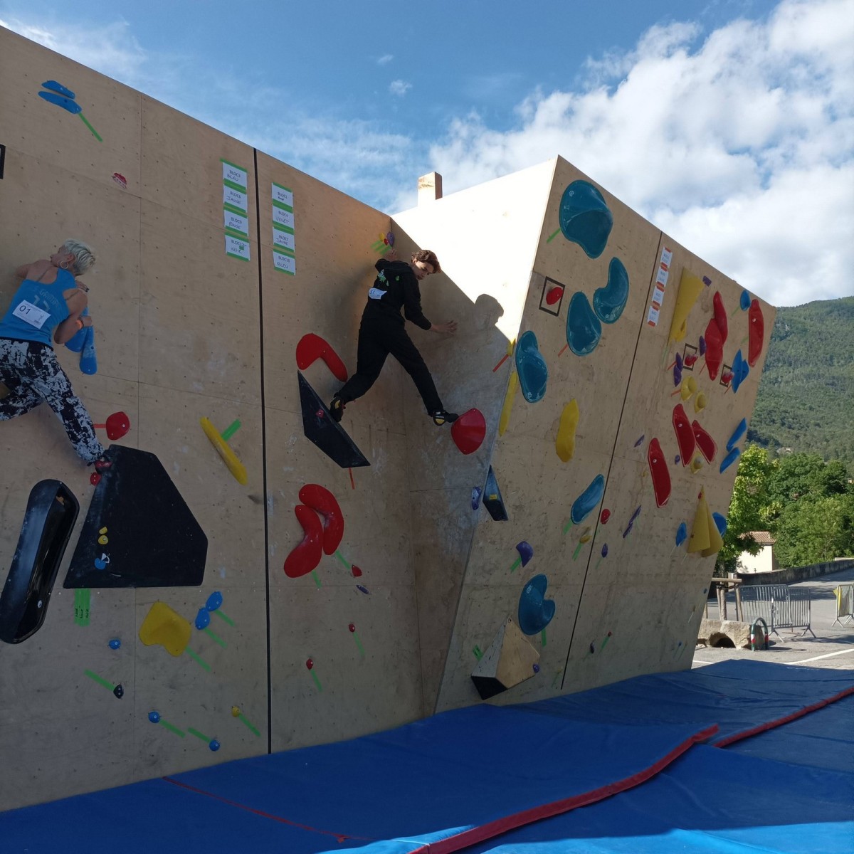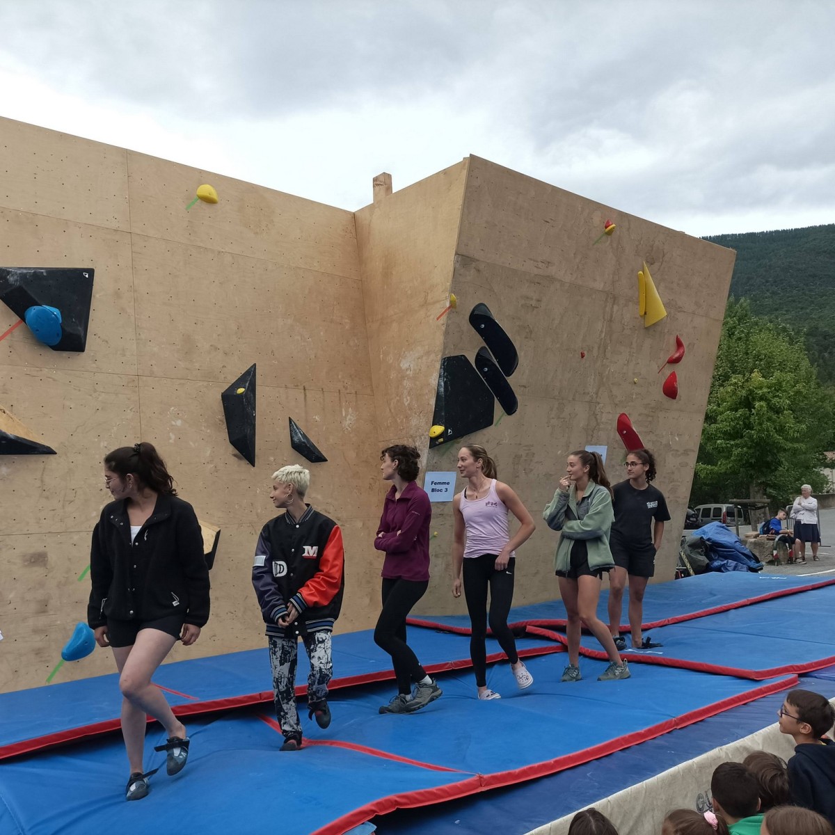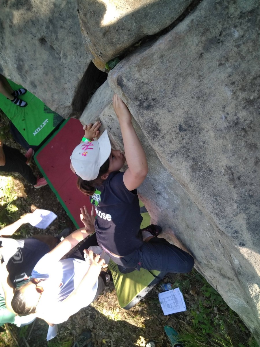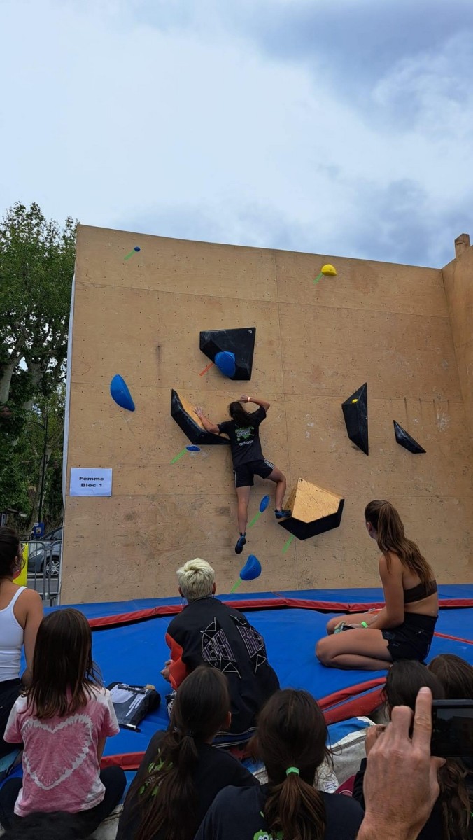Le lendemain, après le petit café au bar du commerce, c’est de nouveau sur le fronton de blocs que se déroule une compétition au format contest : 12 blocs pour les catégories U16 et U18. Léane, Lia, Emma et Antoine participent. Et les blocs sont durs ! Les 5 premiers passent sans trop de problème pour nos compétitrices et compétiteurs mais dès le n°6, c’est la douche. Personne ne parviendra à sortir le mouvement final de cette redoutable dalle. Idem pour le bloc 7 et un passage en dièdre qui restera mystérieux malgré quelques beaux essais. Le bloc 8 sera sorti par un seul compétiteur, mais il est trop physique pour les filles et Antoine ne parvient pas à passer le départ avec un talon pas évident. Le bloc 9 est une dalle et à ce jeu, Lia est douée. Malgré quelques hésitations, elle parvient à toper le bloc. Léane n’en fait qu’une bouchée et Emma qui a galéré dans le départ, parvient enfin à la prise de fin pour se voir refuser la validation à cause d’un pied qui traine sur une prise d’une autre couleur ! Ouch ! Antoine fait un bel essai dans un style de grimpe assez décousu mais ne parvient pas à toper.