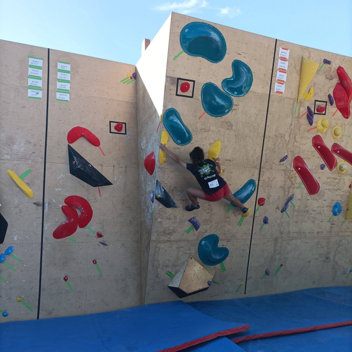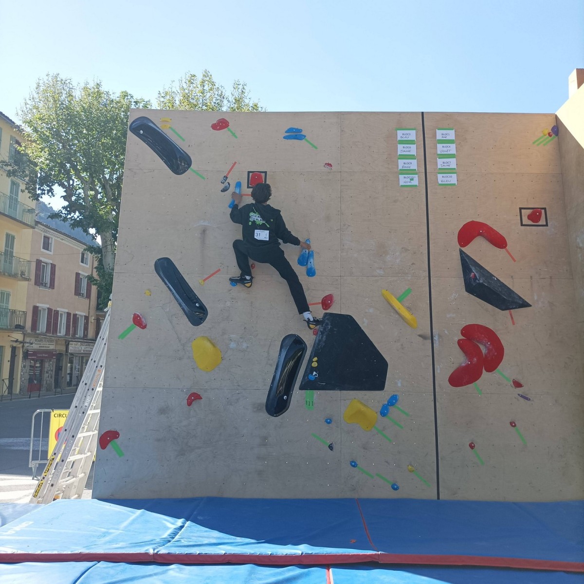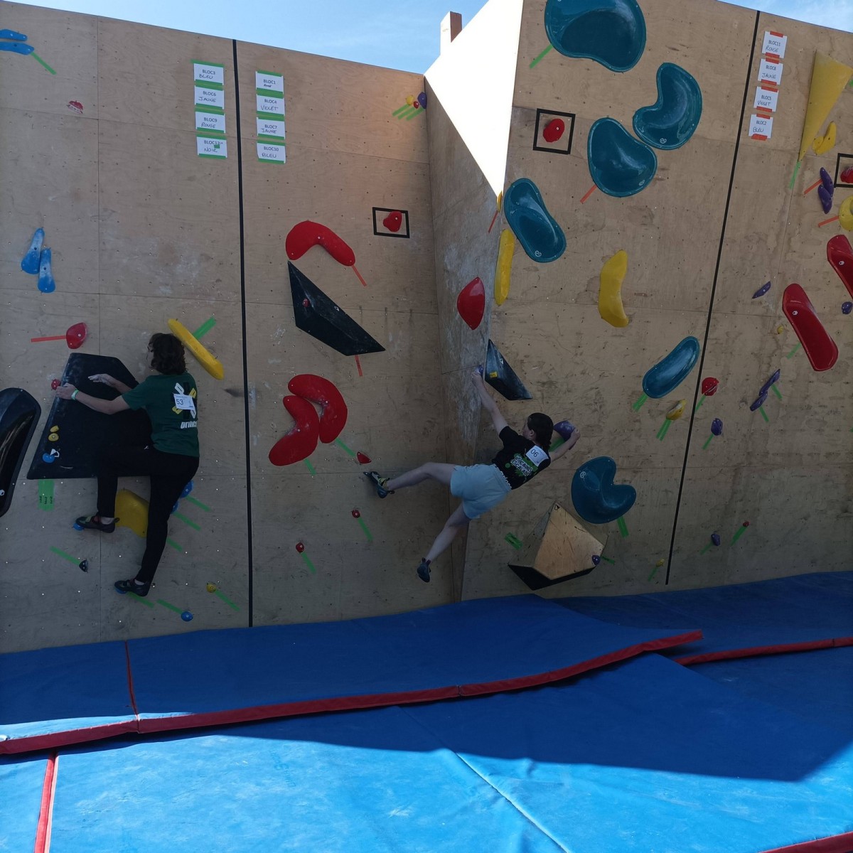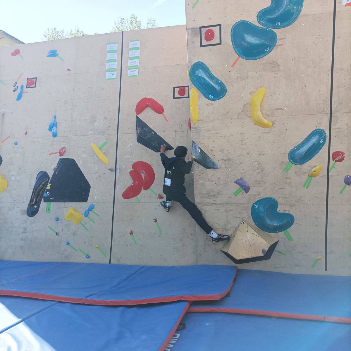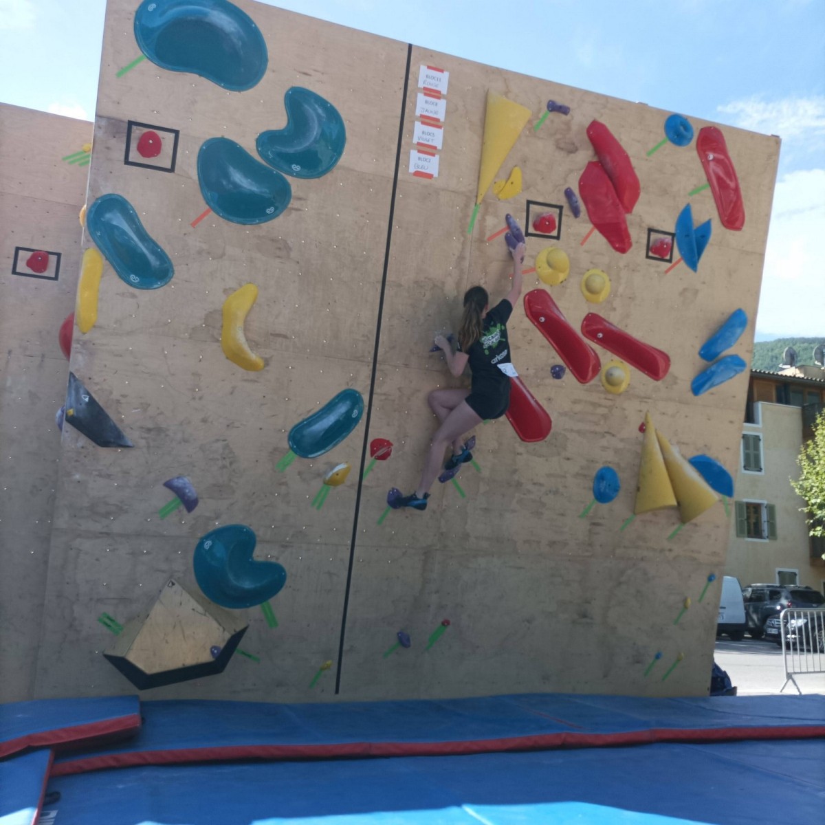 Le lendemain, après le petit café au bar du commerce, c’est de nouveau sur le fronton de blocs que se déroule une compétition au format contest : 12 blocs pour les catégories U16 et U18. Léane, Lia, Emma et Antoine participent. Et les blocs sont durs ! Les 5 premiers passent sans trop de problème pour nos compétitrices et compétiteurs mais dès le n°6, c’est la douche. Personne ne parviendra à sortir le mouvement final de cette redoutable dalle. Idem pour le bloc 7 et un passage en dièdre qui restera mystérieux malgré quelques beaux essais. Le bloc 8 sera sorti par un seul compétiteur, mais il est trop physique pour les filles et Antoine ne parvient pas à passer le départ avec un talon pas évident. Le bloc 9 est une dalle et à ce jeu, Lia est douée. Malgré quelques hésitations, elle parvient à toper le bloc. Léane n’en fait qu’une bouchée et Emma qui a galéré dans le départ, parvient enfin à la prise de fin pour se voir refuser la validation à cause d’un pied qui traine sur une prise d’une autre couleur ! Ouch ! Antoine fait un bel essai dans un style de grimpe assez décousu mais ne parvient pas à toper.