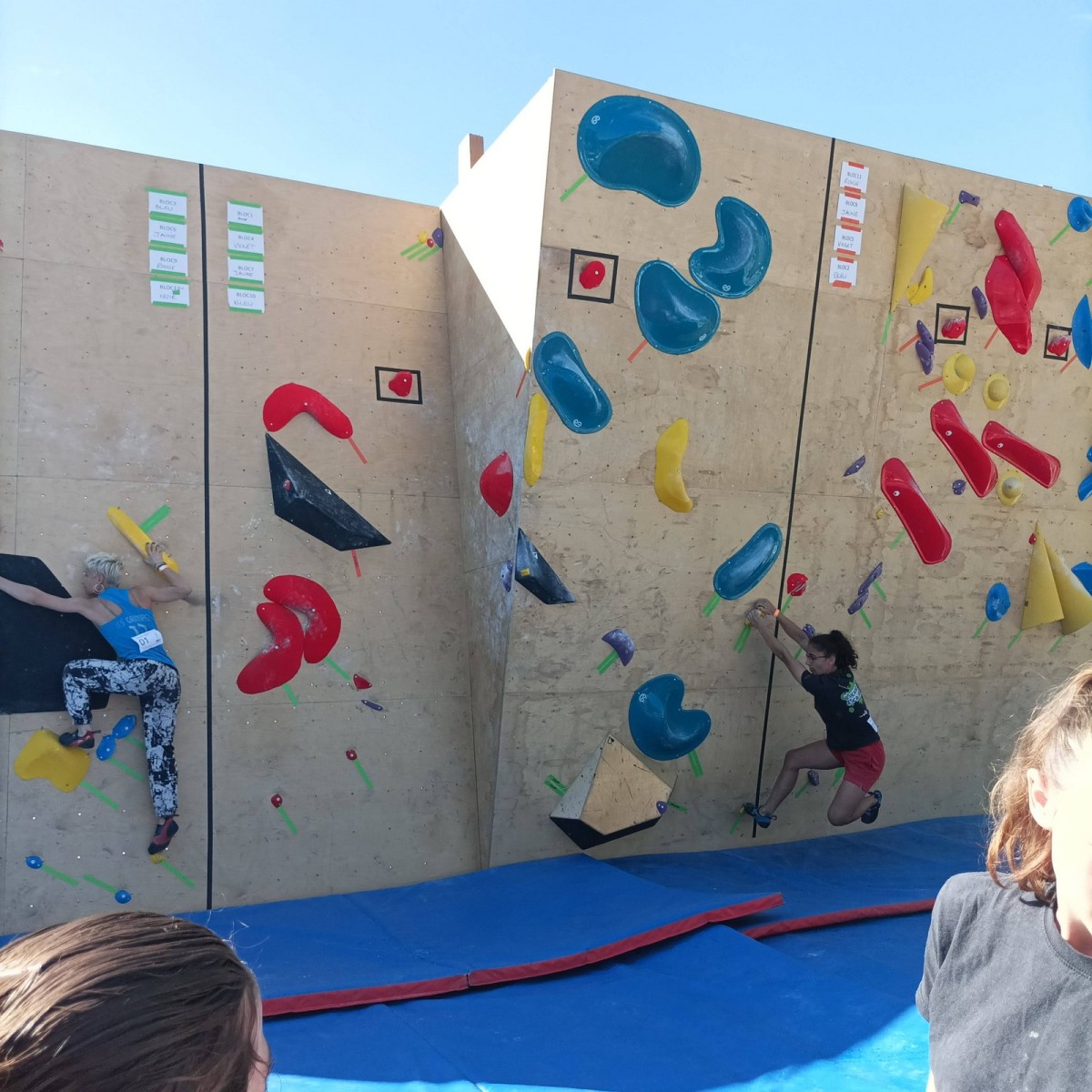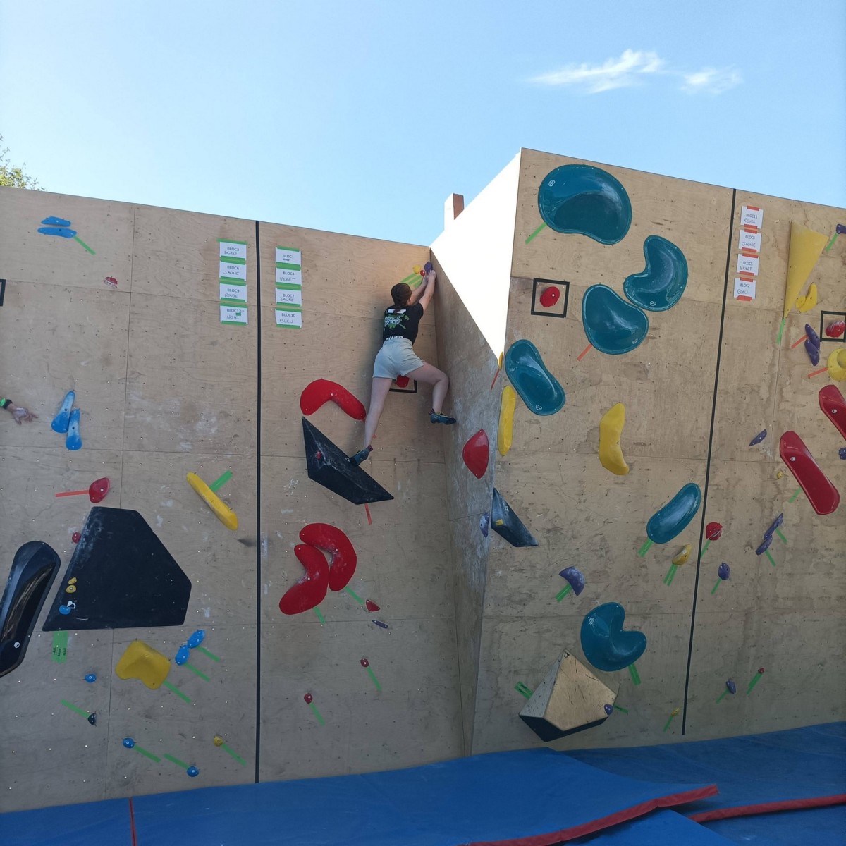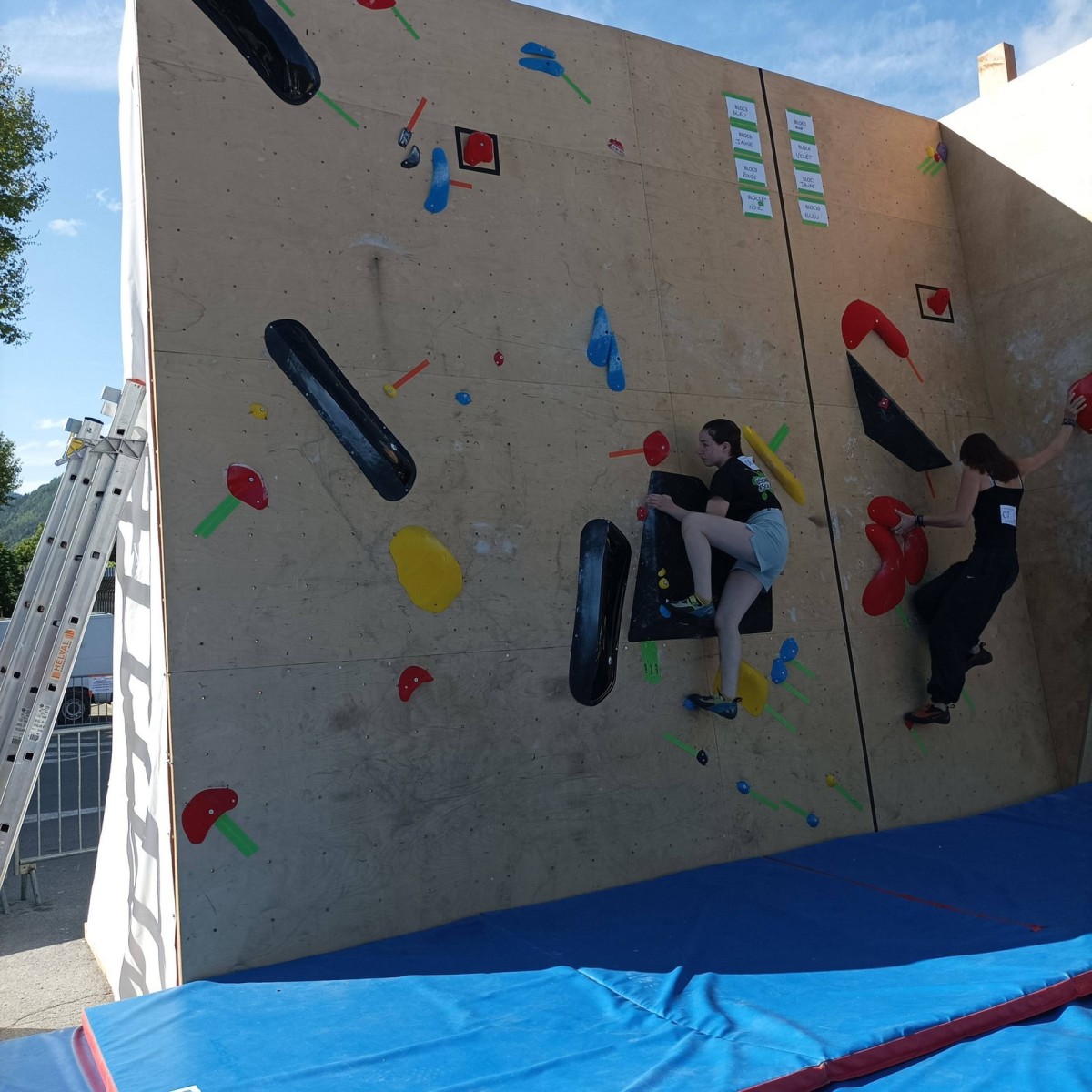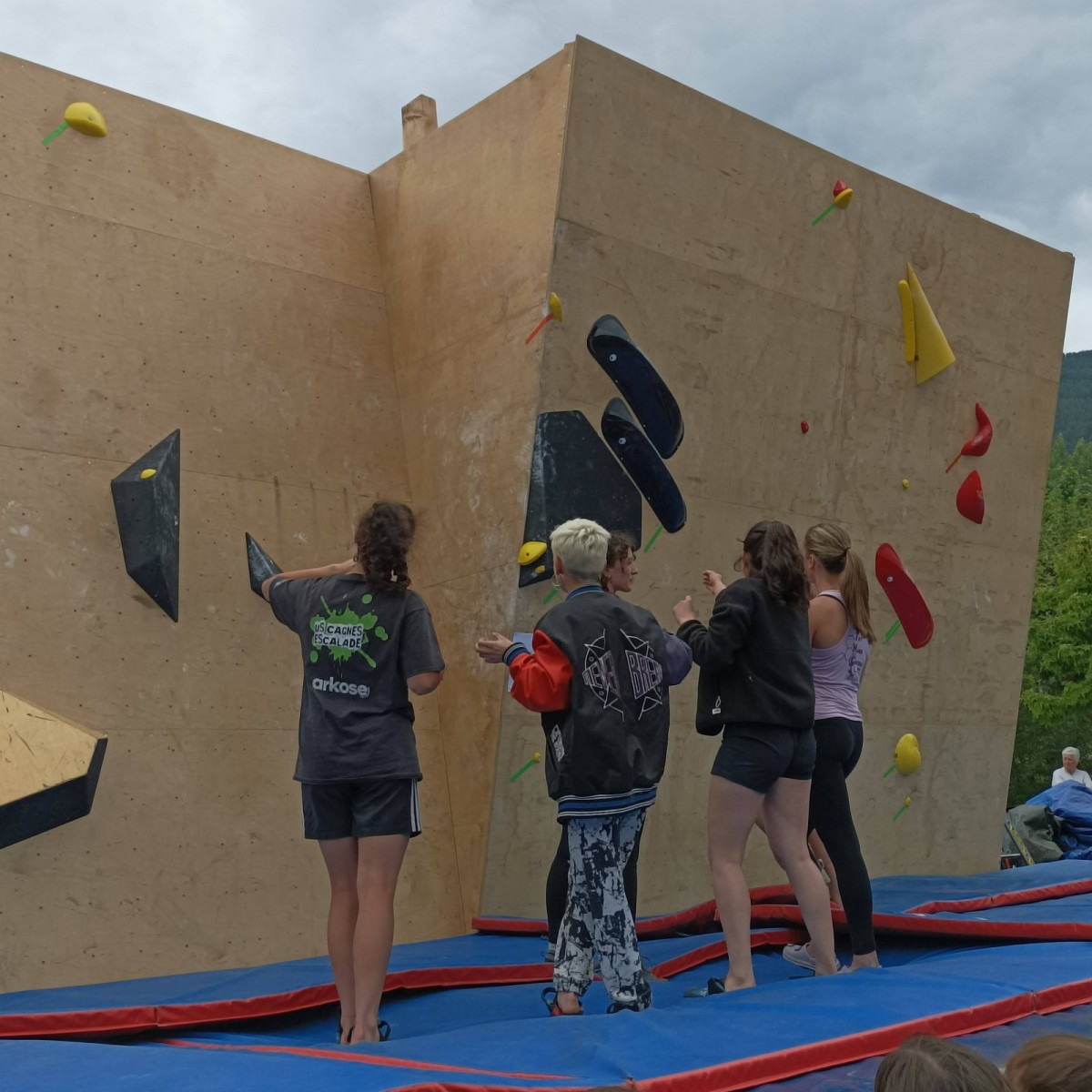 Le lendemain, après le petit café au bar du commerce, c’est de nouveau sur le fronton de blocs que se déroule une compétition au format contest : 12 blocs pour les catégories U16 et U18. Léane, Lia, Emma et Antoine participent. Et les blocs sont durs ! Les 5 premiers passent sans trop de problème pour nos compétitrices et compétiteurs mais dès le n°6, c’est la douche. Personne ne parviendra à sortir le mouvement final de cette redoutable dalle. Idem pour le bloc 7 et un passage en dièdre qui restera mystérieux malgré quelques beaux essais. Le bloc 8 sera sorti par un seul compétiteur, mais il est trop physique pour les filles et Antoine ne parvient pas à passer le départ avec un talon pas évident. Le bloc 9 est une dalle et à ce jeu, Lia est douée. Malgré quelques hésitations, elle parvient à toper le bloc. Léane n’en fait qu’une bouchée et Emma qui a galéré dans le départ, parvient enfin à la prise de fin pour se voir refuser la validation à cause d’un pied qui traine sur une prise d’une autre couleur ! Ouch ! Antoine fait un bel essai dans un style de grimpe assez décousu mais ne parvient pas à toper.