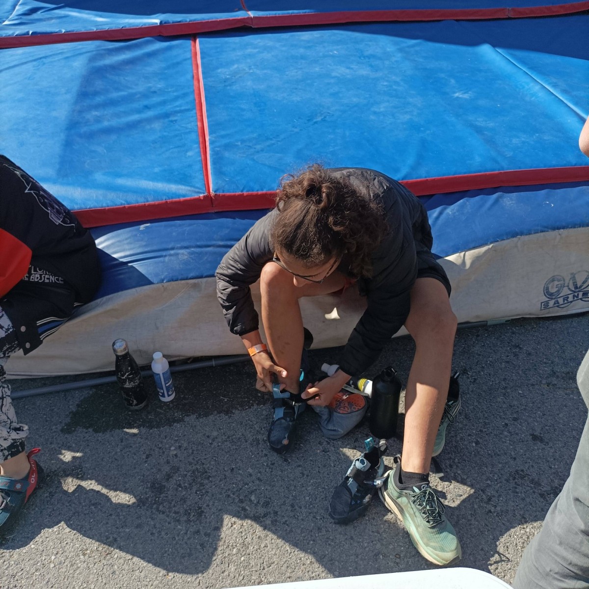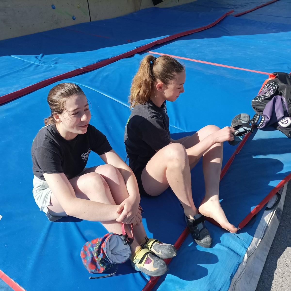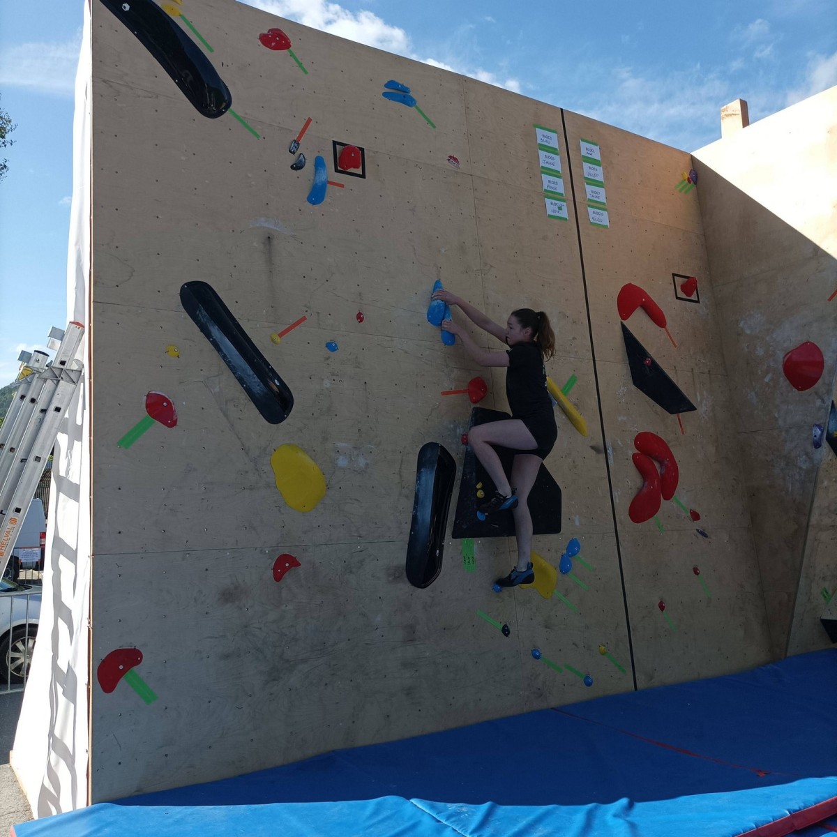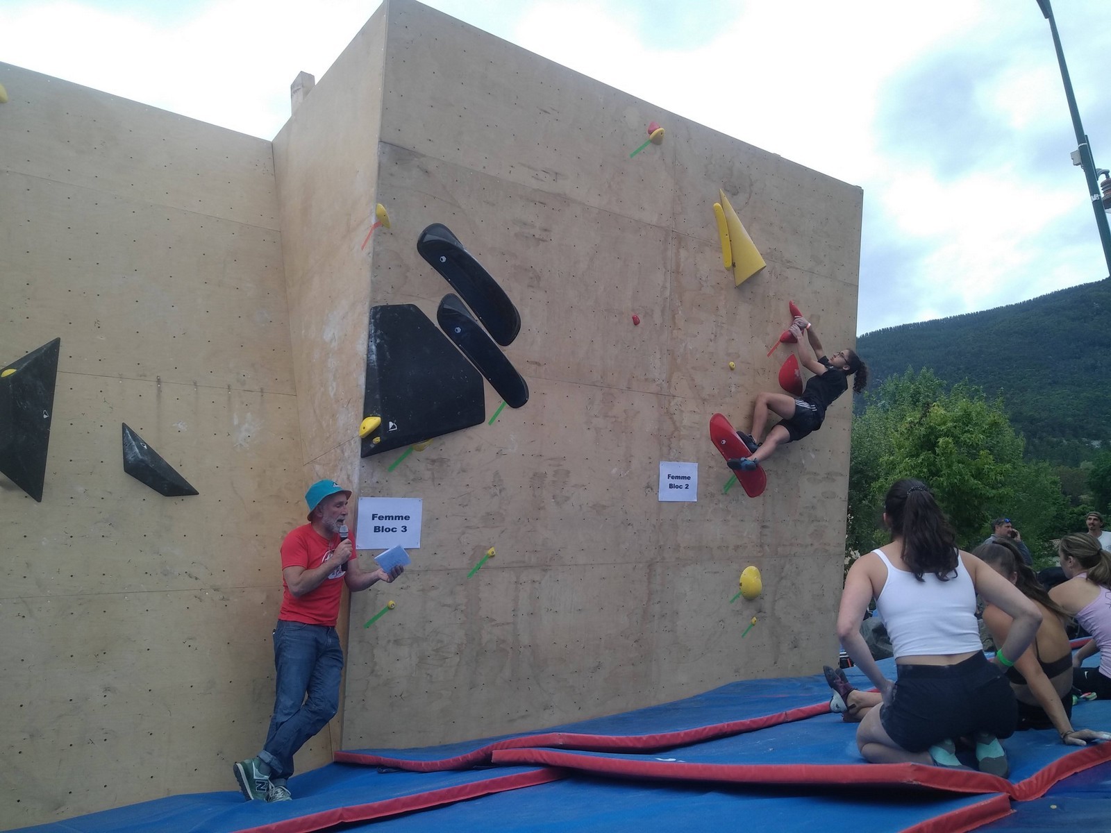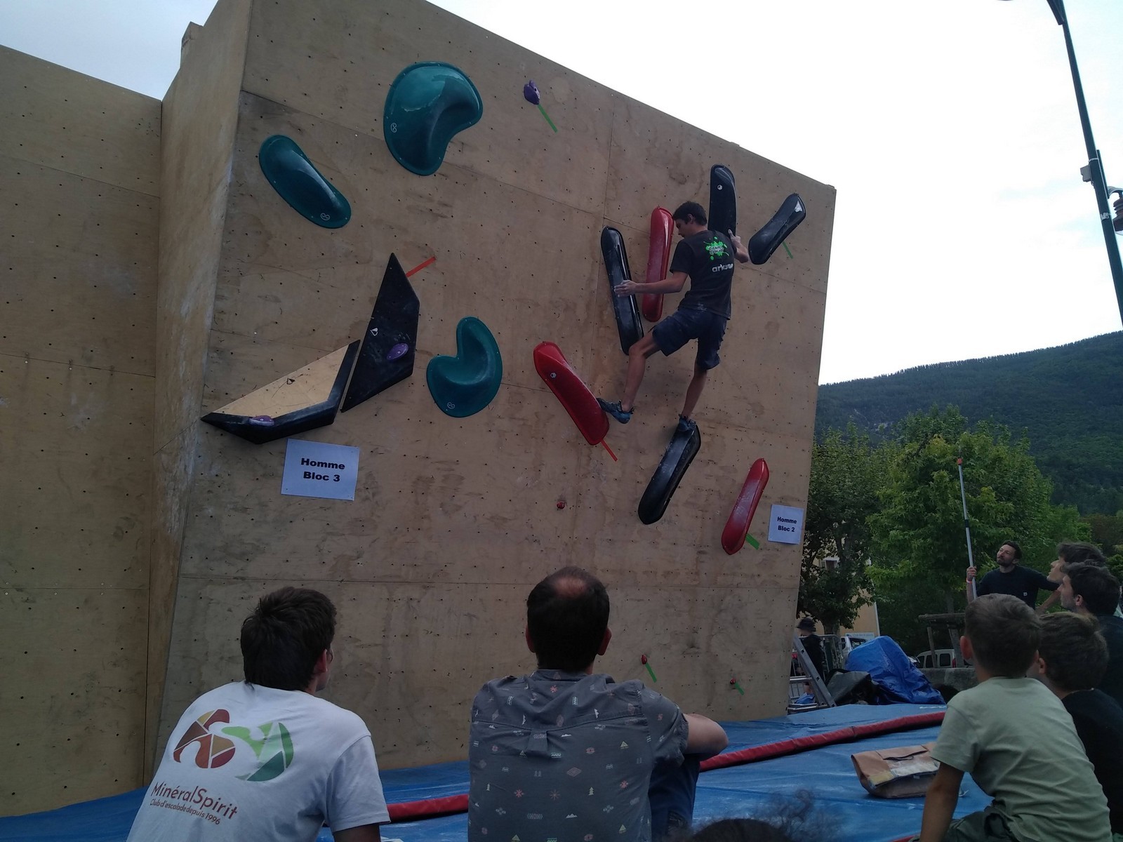 Le lendemain, après le petit café au bar du commerce, c’est de nouveau sur le fronton de blocs que se déroule une compétition au format contest : 12 blocs pour les catégories U16 et U18. Léane, Lia, Emma et Antoine participent. Et les blocs sont durs ! Les 5 premiers passent sans trop de problème pour nos compétitrices et compétiteurs mais dès le n°6, c’est la douche. Personne ne parviendra à sortir le mouvement final de cette redoutable dalle. Idem pour le bloc 7 et un passage en dièdre qui restera mystérieux malgré quelques beaux essais. Le bloc 8 sera sorti par un seul compétiteur, mais il est trop physique pour les filles et Antoine ne parvient pas à passer le départ avec un talon pas évident. Le bloc 9 est une dalle et à ce jeu, Lia est douée. Malgré quelques hésitations, elle parvient à toper le bloc. Léane n’en fait qu’une bouchée et Emma qui a galéré dans le départ, parvient enfin à la prise de fin pour se voir refuser la validation à cause d’un pied qui traine sur une prise d’une autre couleur ! Ouch ! Antoine fait un bel essai dans un style de grimpe assez décousu mais ne parvient pas à toper.