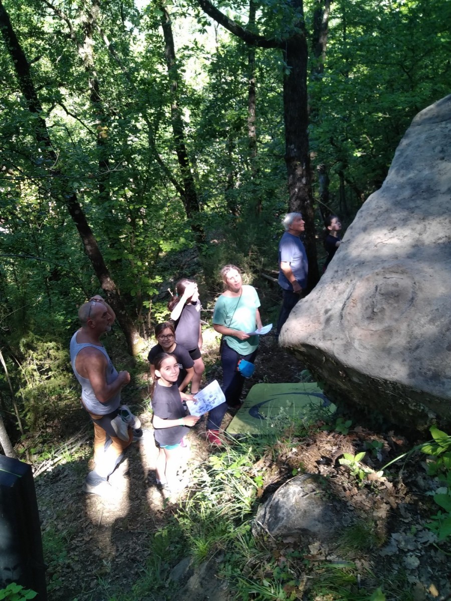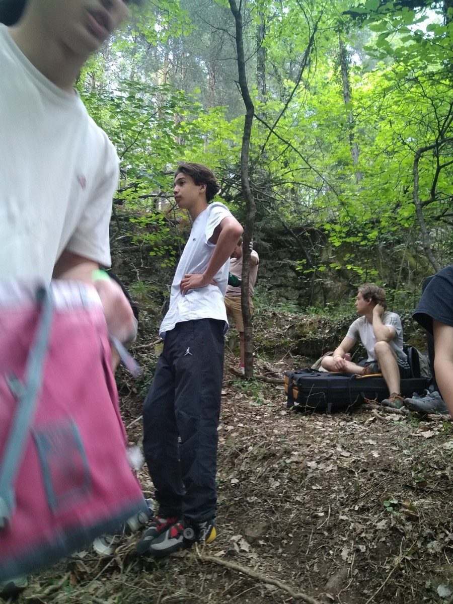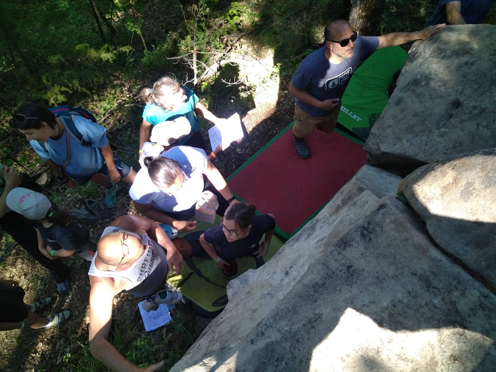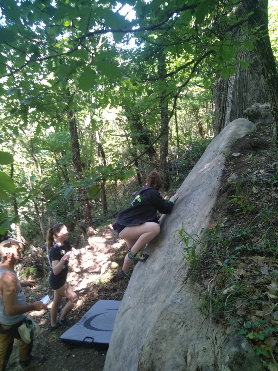 Nous nous retrouvons tous plus ou moins à l’heure donnée sur la place du village pour finaliser les inscriptions, distribuer les pads et partir à travers le village en direction des blocs. Avec les parents, nous sommes une bonne palanquée et arrivés au secteur, notre première mission est de trouver un espace suffisamment grand pour en faire un camp de base. Comme cette année il y a une buvette, on s’installe pas trop loin de celle-ci, à peu près au centre du secteur.
