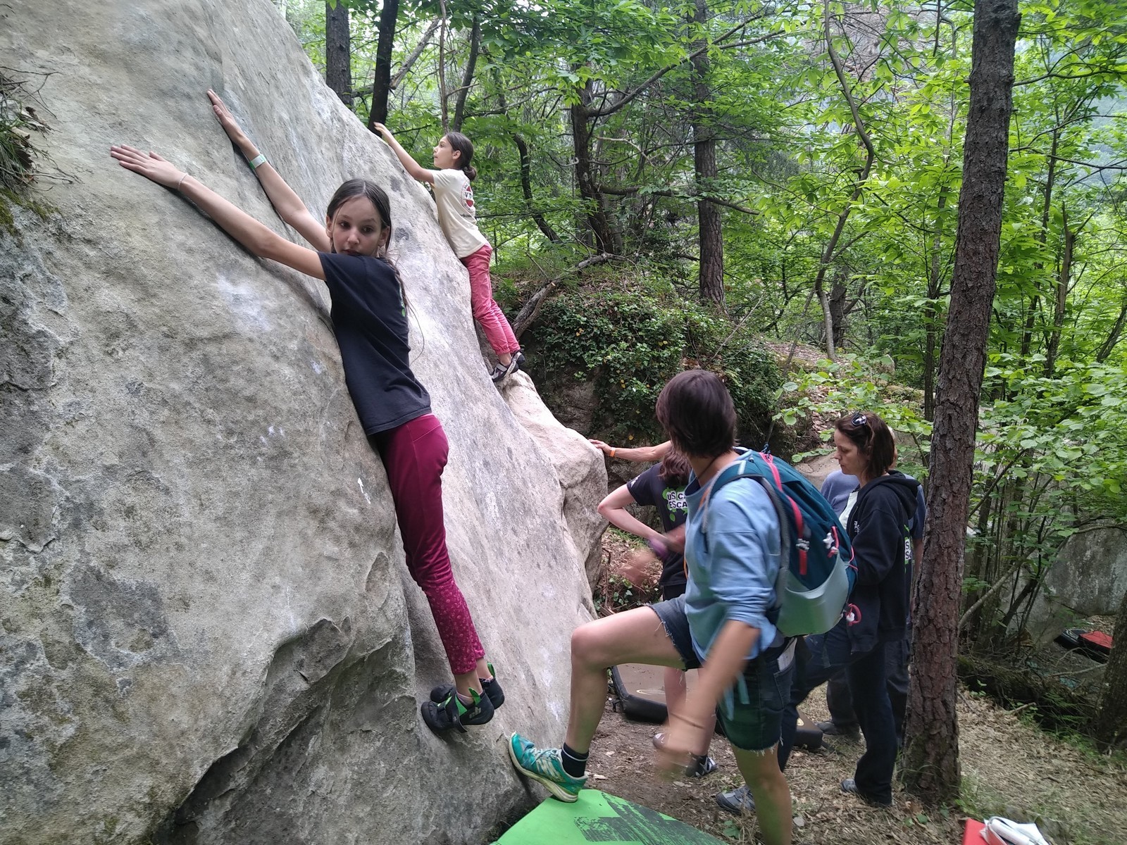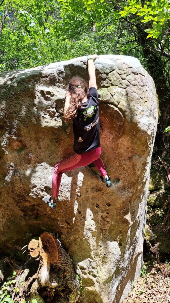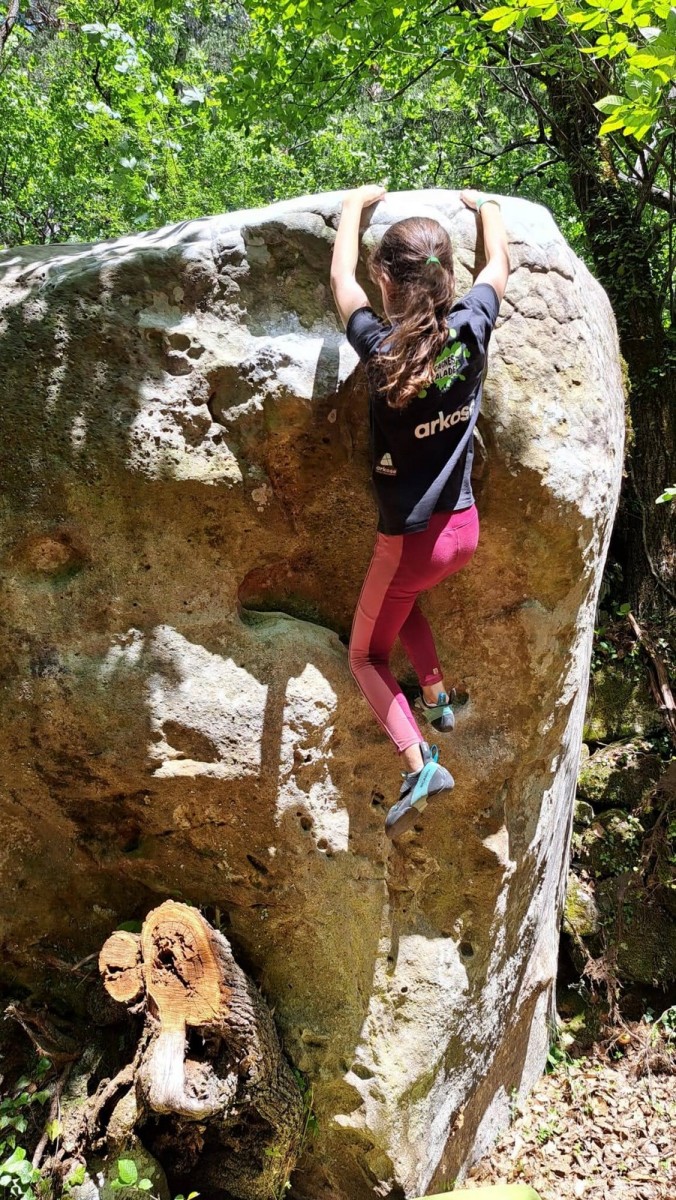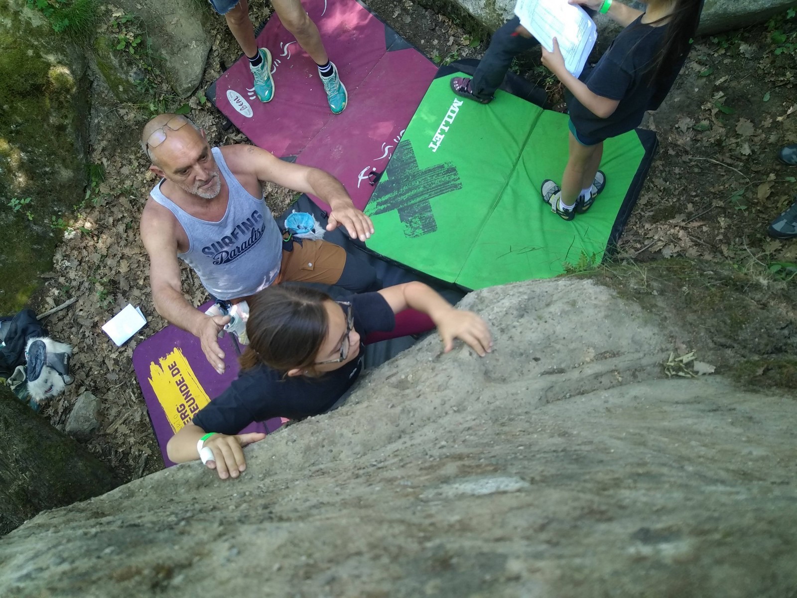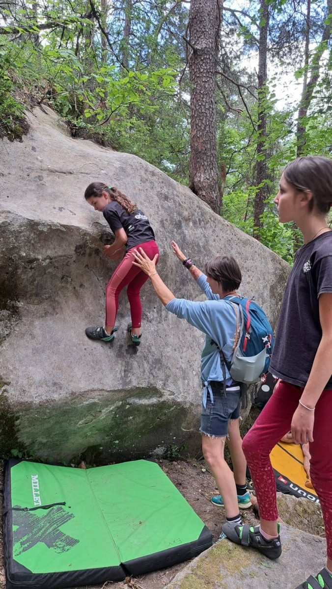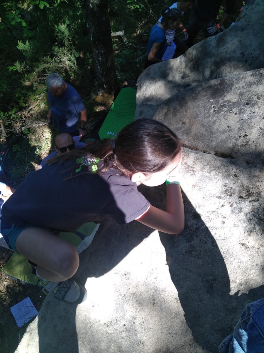 Nous nous retrouvons tous plus ou moins à l’heure donnée sur la place du village pour finaliser les inscriptions, distribuer les pads et partir à travers le village en direction des blocs. Avec les parents, nous sommes une bonne palanquée et arrivés au secteur, notre première mission est de trouver un espace suffisamment grand pour en faire un camp de base. Comme cette année il y a une buvette, on s’installe pas trop loin de celle-ci, à peu près au centre du secteur.