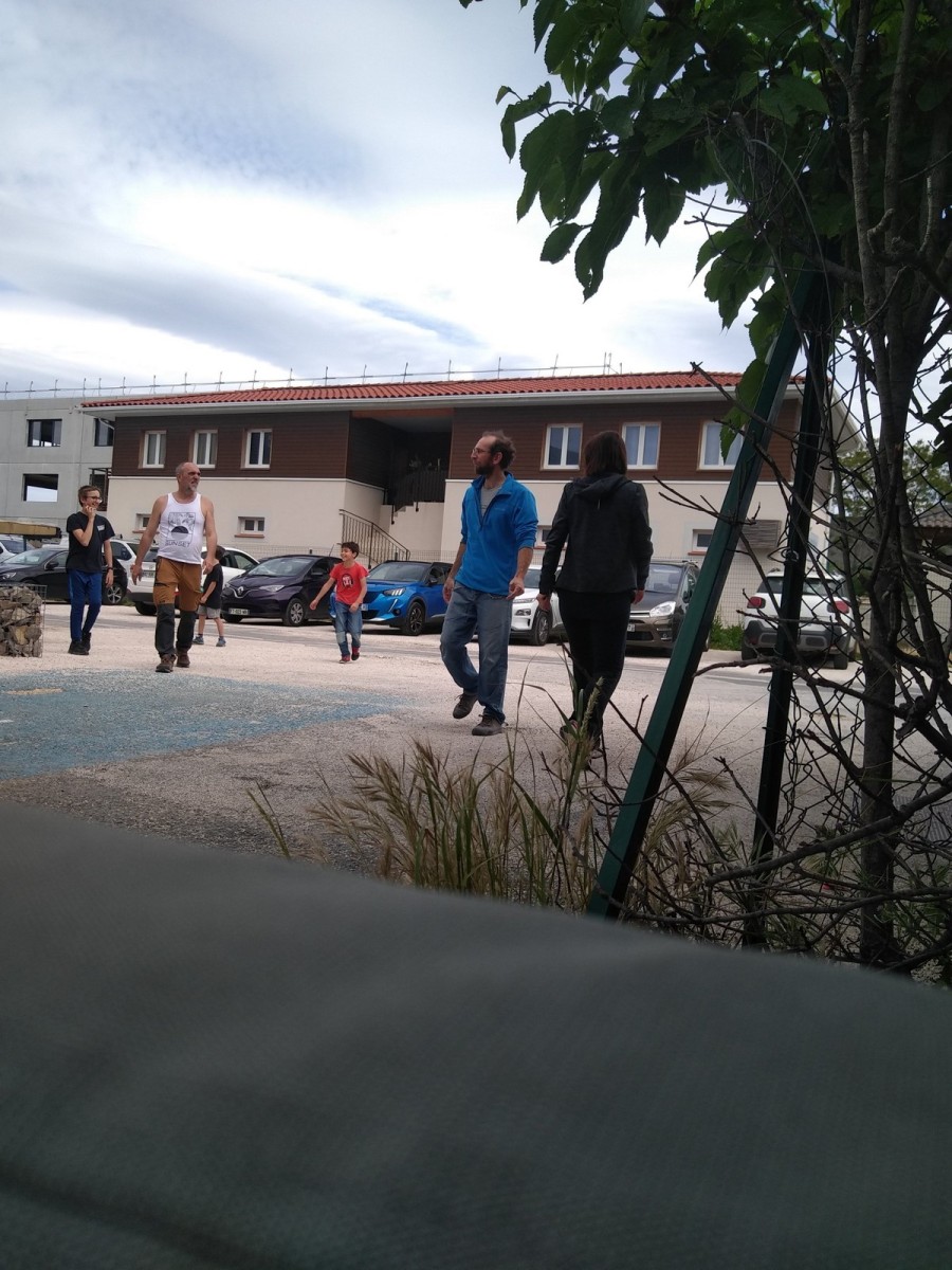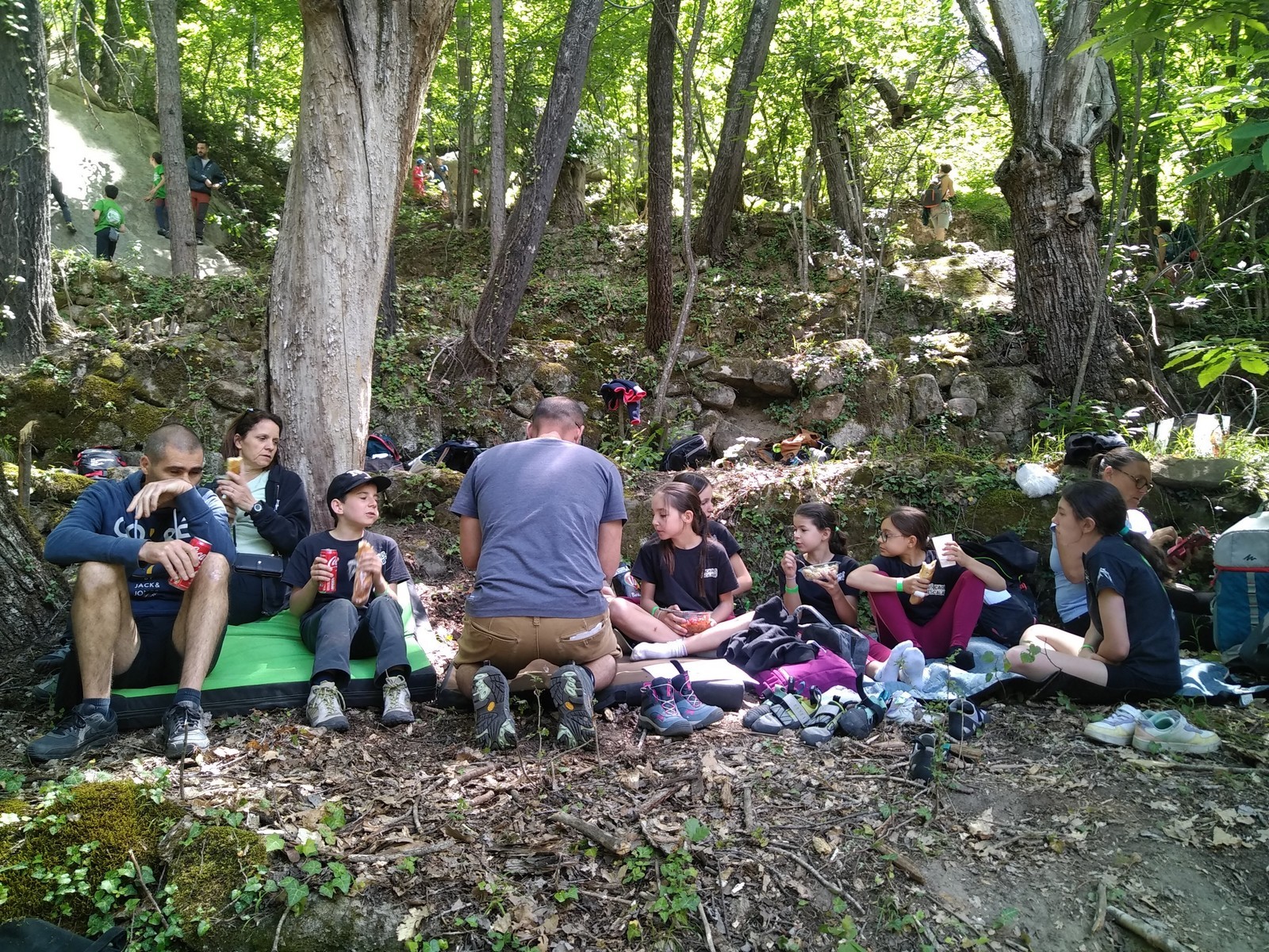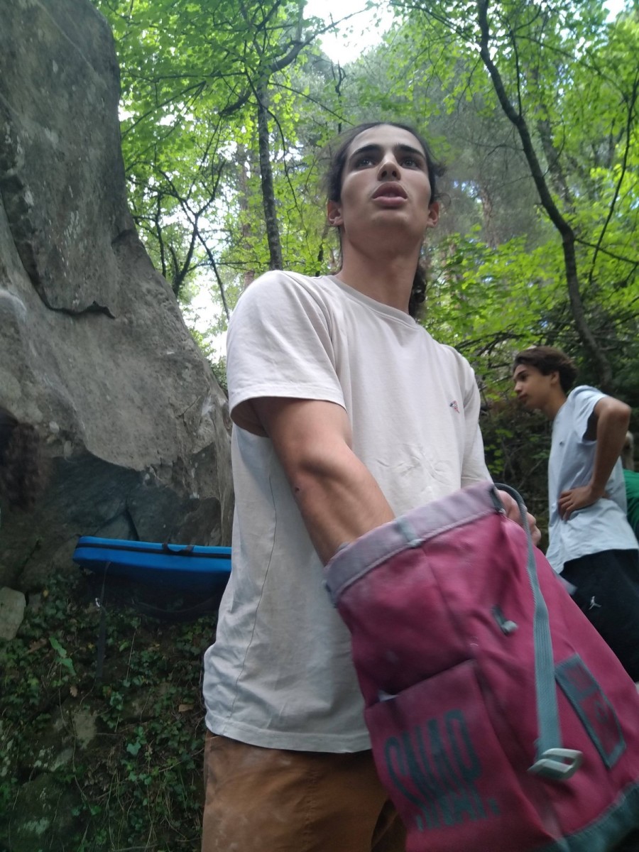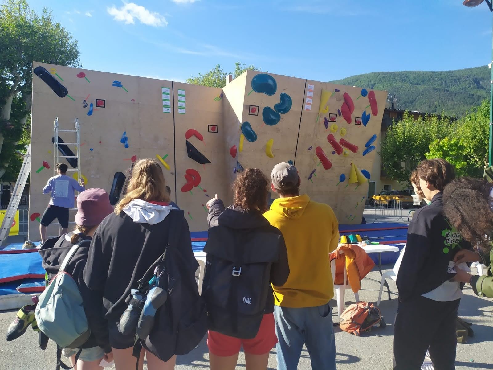 Nous nous retrouvons tous plus ou moins à l’heure donnée sur la place du village pour finaliser les inscriptions, distribuer les pads et partir à travers le village en direction des blocs. Avec les parents, nous sommes une bonne palanquée et arrivés au secteur, notre première mission est de trouver un espace suffisamment grand pour en faire un camp de base. Comme cette année il y a une buvette, on s’installe pas trop loin de celle-ci, à peu près au centre du secteur.