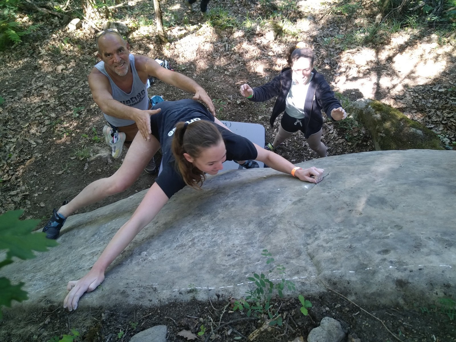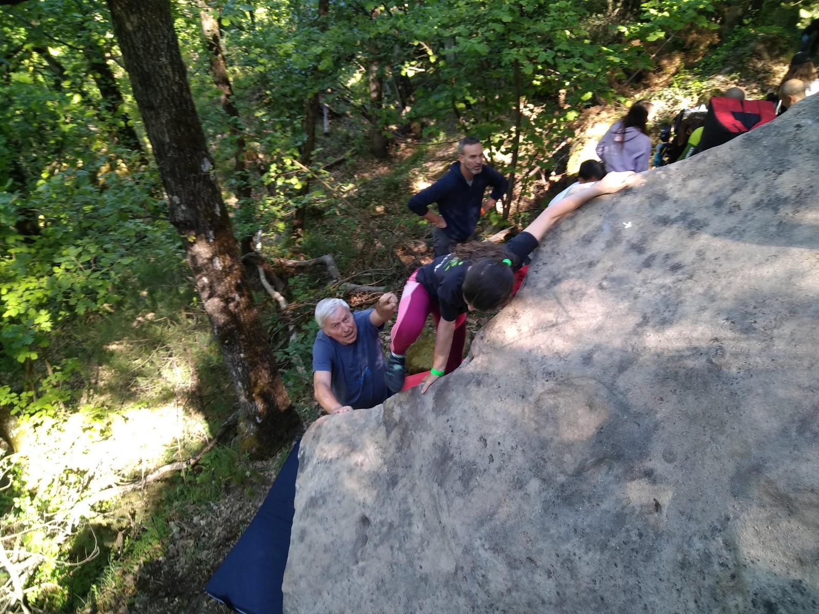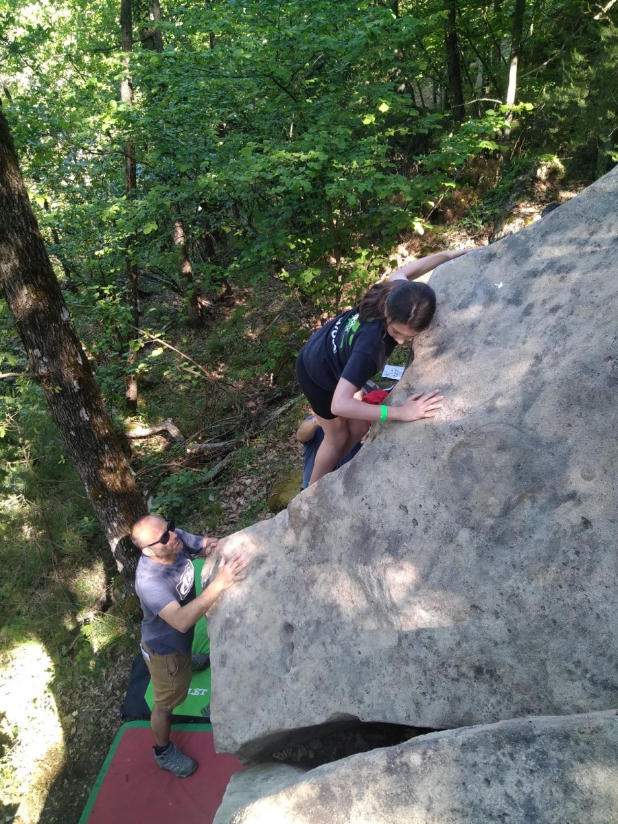 Lorsque midi sonne, on retourne à notre camp de base pour manger un bout. Pour l’après-midi, je reste surtout avec Emma et Léane qui s’essaient dans pas mal de blocs durs dans lesquels Milan et moi essayons de leur donner des méthodes. On rigole bien et on est rejoints par Antoine. On retrouve de temps en temps les petits éparpillés à droite à gauche, les parents tentant de les suivre au mieux. Tout se passe super bien, il y a du monde présent mais ce n’est pas non plus le chaos, la mauvaise météo prévue en aura certainement refroidi plus d’un, surtout ceux qui viennent de loin ! Si l’orage gronde un peu dans l’après-midi, celui-ci nous contourne et nous laisse tranquilles dans nos efforts.