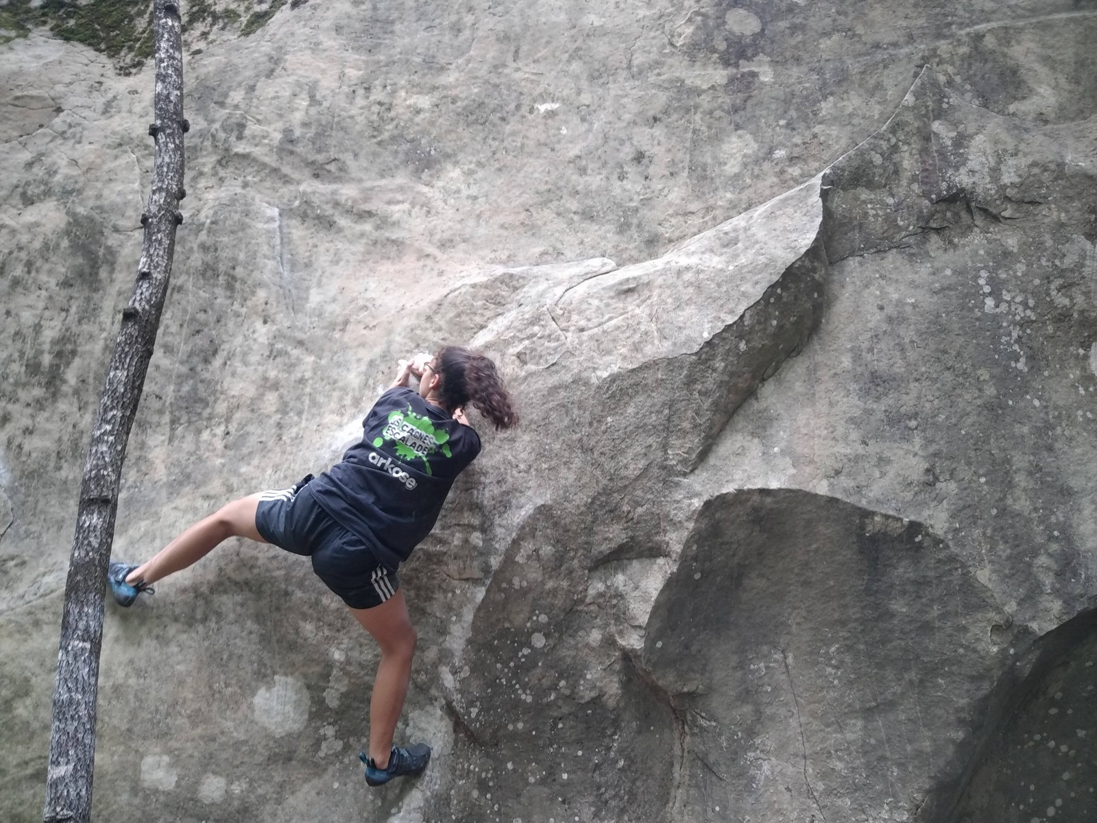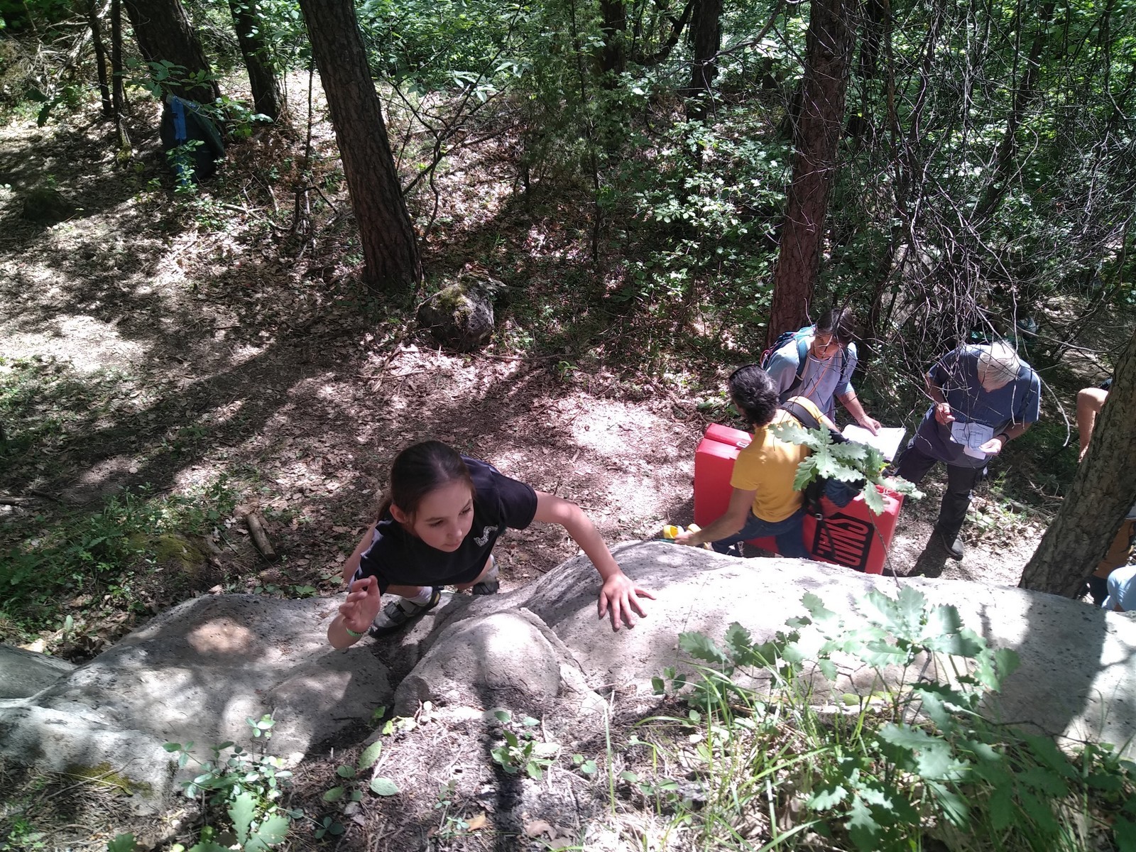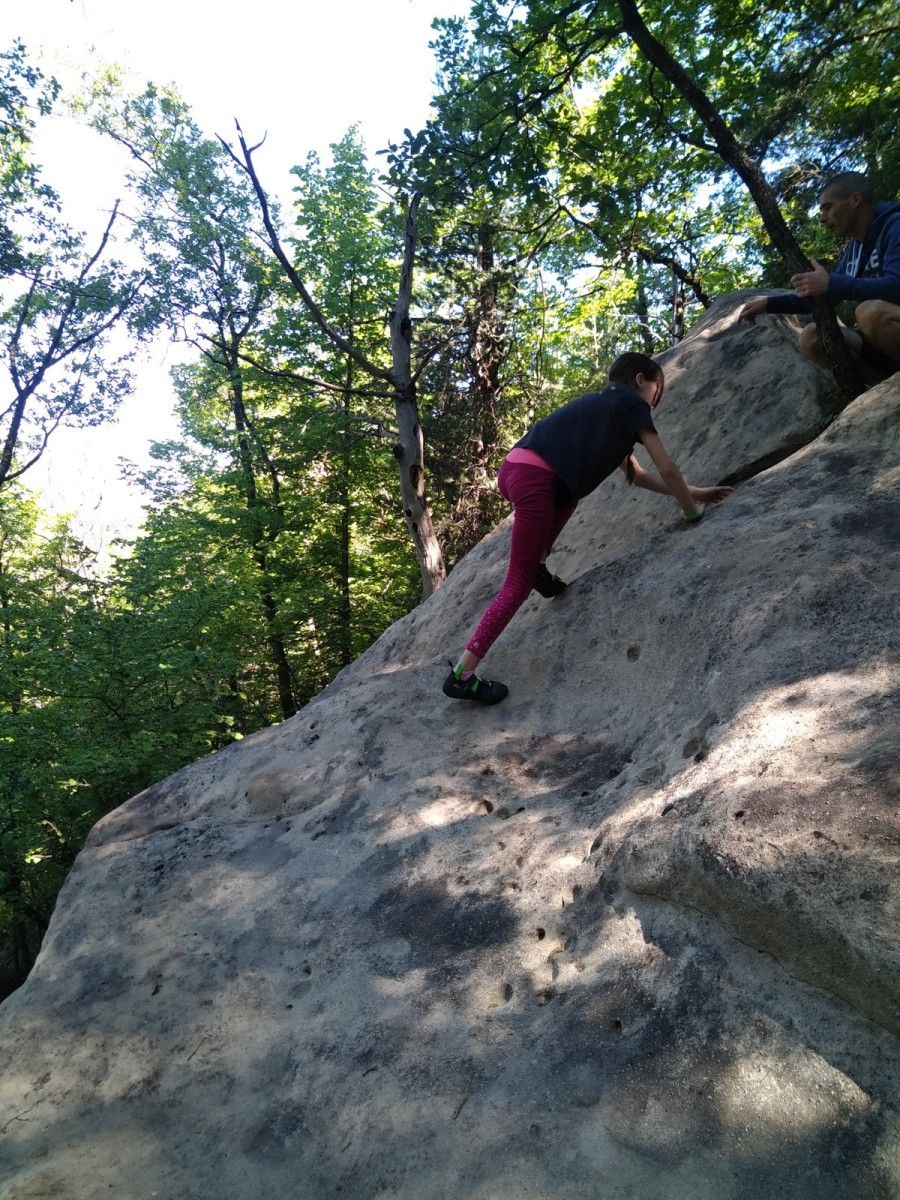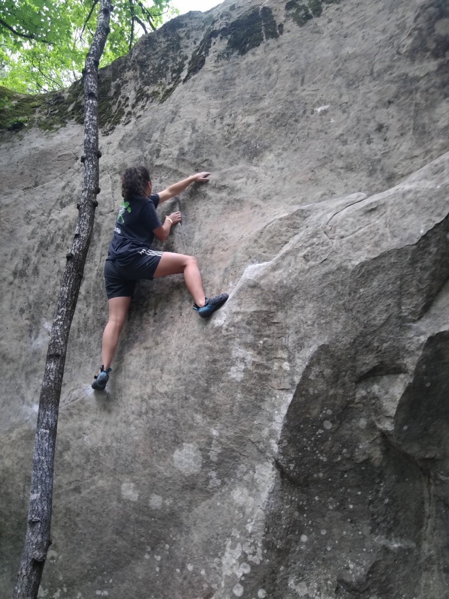 Lorsque midi sonne, on retourne à notre camp de base pour manger un bout. Pour l’après-midi, je reste surtout avec Emma et Léane qui s’essaient dans pas mal de blocs durs dans lesquels Milan et moi essayons de leur donner des méthodes. On rigole bien et on est rejoints par Antoine. On retrouve de temps en temps les petits éparpillés à droite à gauche, les parents tentant de les suivre au mieux. Tout se passe super bien, il y a du monde présent mais ce n’est pas non plus le chaos, la mauvaise météo prévue en aura certainement refroidi plus d’un, surtout ceux qui viennent de loin ! Si l’orage gronde un peu dans l’après-midi, celui-ci nous contourne et nous laisse tranquilles dans nos efforts.