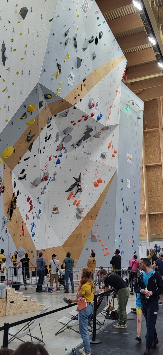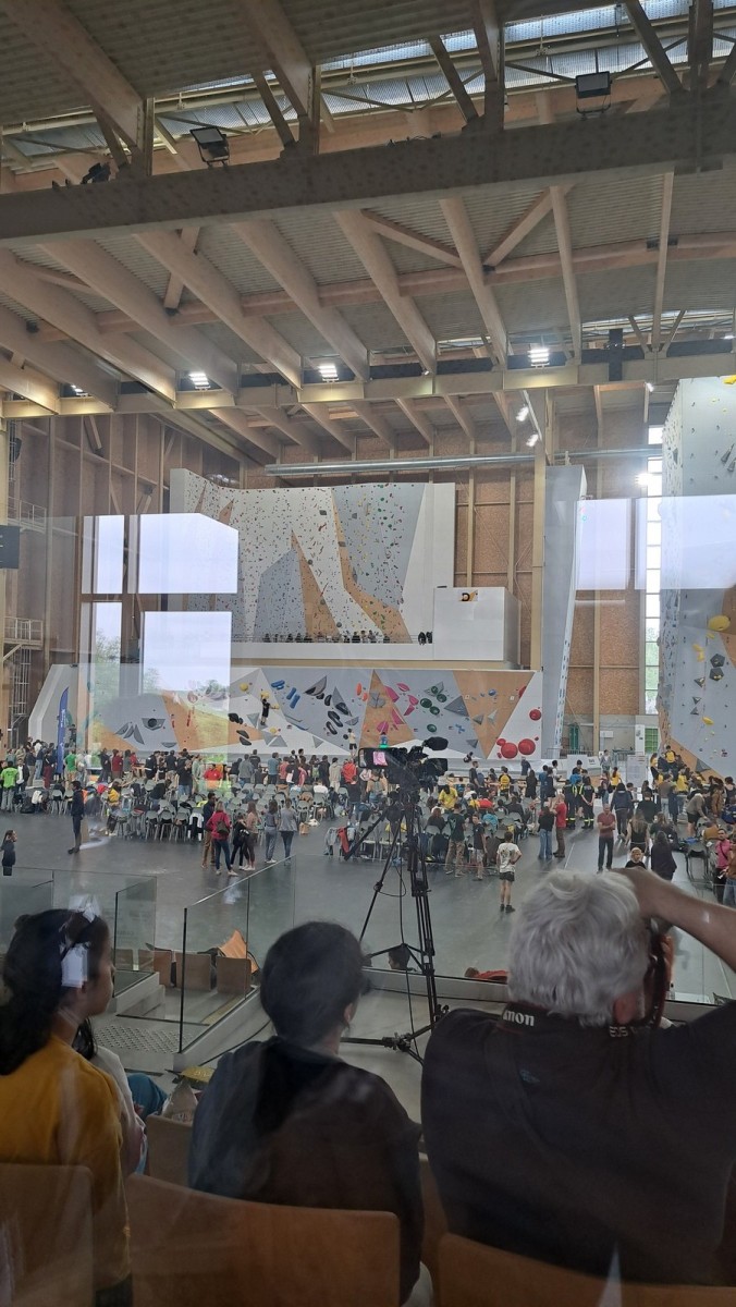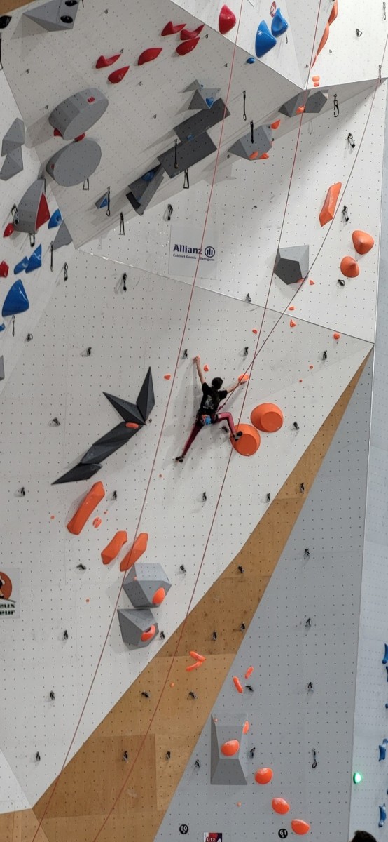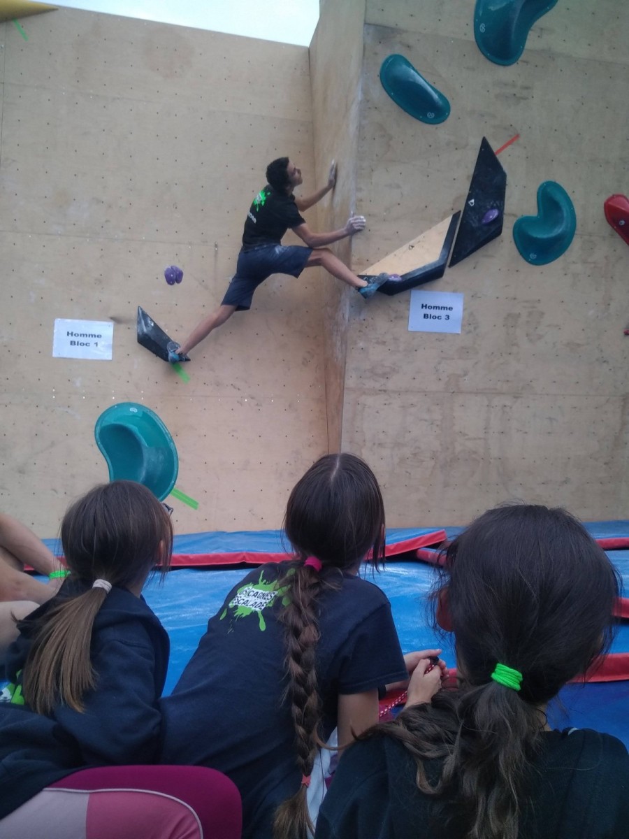 Les finalistes ont 3 blocs à faire. Léane est la plus jeune, mais elle a un fan club incroyable ! Elle sort son premier bloc en 3 essais, son second en deux, et flashe le troisième bloc, étant la seule à comprendre qu’il fallait se retourner face au public. Un grand moment. Elle termine 3ème de la finale, à rien des deux premières.
