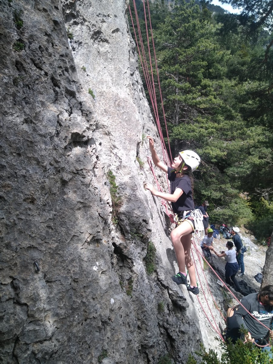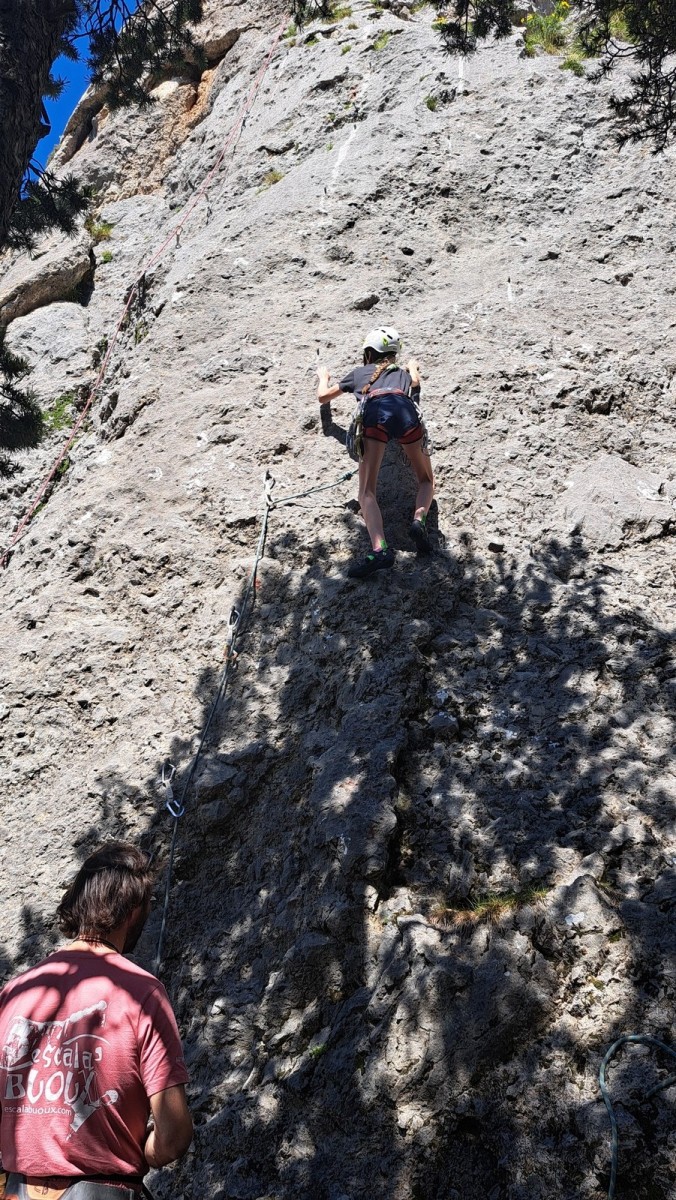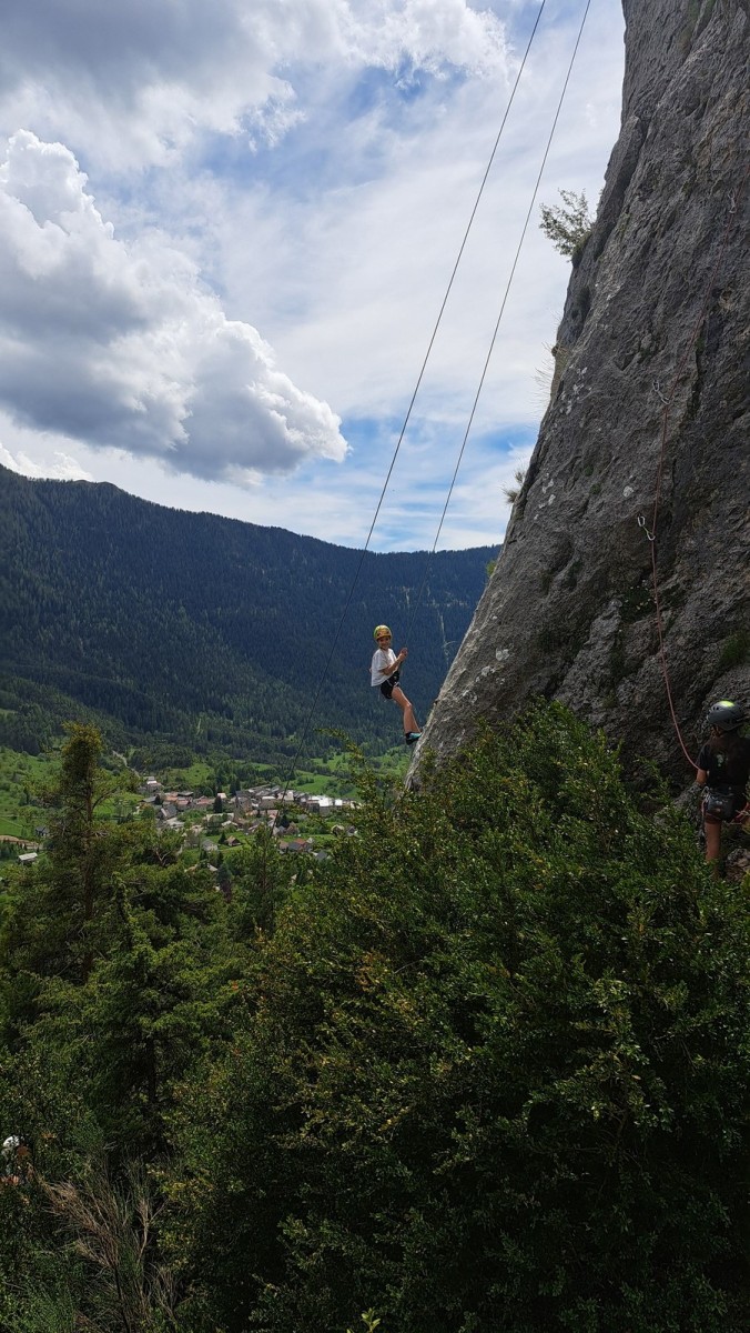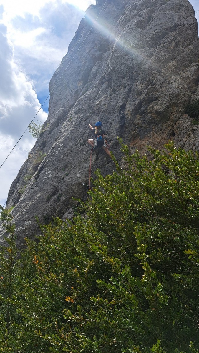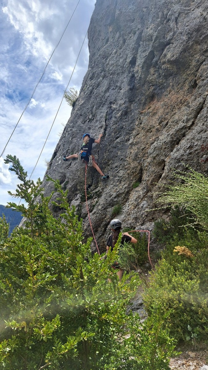Apolline, la plus jeune du groupe, avale dans la journée les 9 voies du donjon, de même qu’Anaïs avec plus ou moins de style. Lilas prend doucement confiance dans l’escalade en tête, de même que sa soeur Rose. Aleksander, fidèle à lui-même, n’usera pas beaucoup ses chaussons sur le caillou mais ira parcourir les chemins alentours avec Adèle, un peu plus motivée par l’escalade tout de même. C’est compliqué également pour Lorenzo et Rayan qui préfèrent s’amuser au sol. Il faudra un peu de temps pour réussir à motiver Abd’Allah mais une fois lancé, il ne s’arrêtera plus !