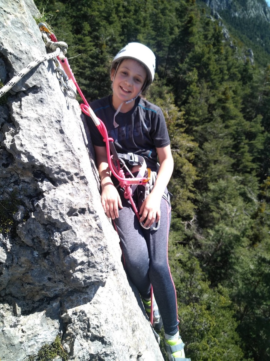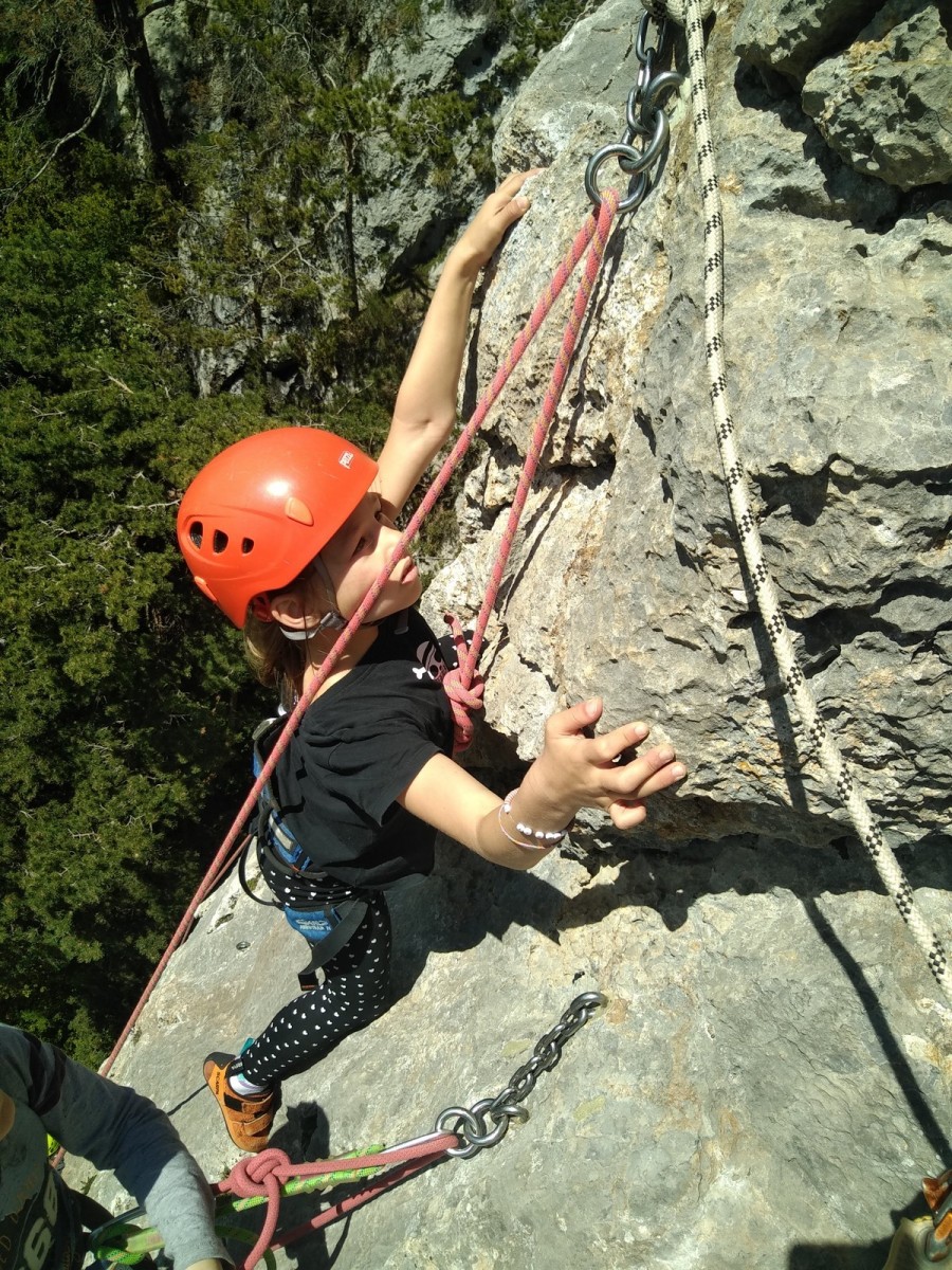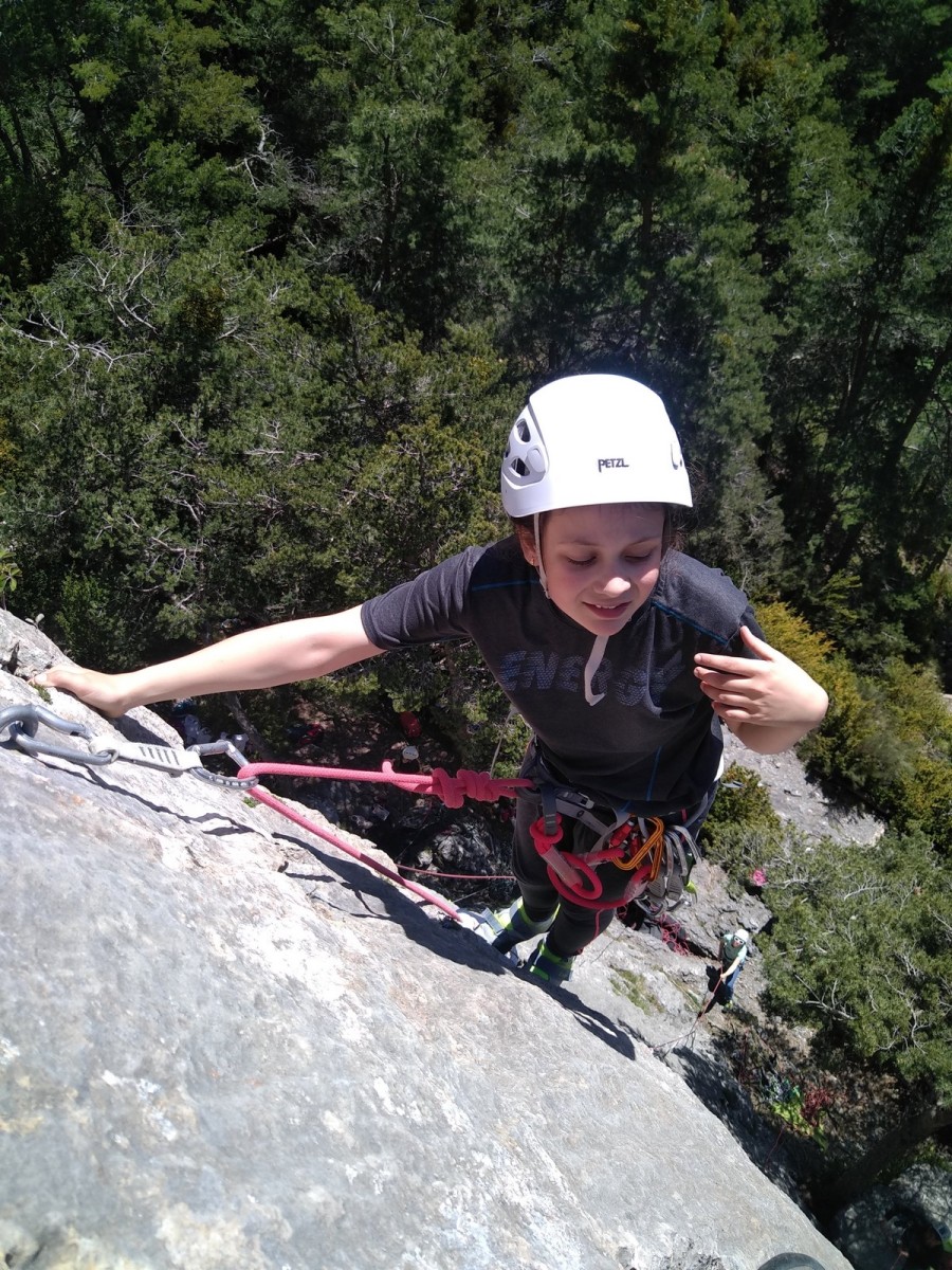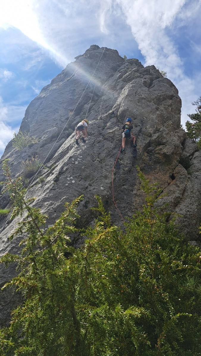 Apolline, la plus jeune du groupe, avale dans la journée les 9 voies du donjon, de même qu’Anaïs avec plus ou moins de style. Lilas prend doucement confiance dans l’escalade en tête, de même que sa soeur Rose. Aleksander, fidèle à lui-même, n’usera pas beaucoup ses chaussons sur le caillou mais ira parcourir les chemins alentours avec Adèle, un peu plus motivée par l’escalade tout de même. C’est compliqué également pour Lorenzo et Rayan qui préfèrent s’amuser au sol. Il faudra un peu de temps pour réussir à motiver Abd’Allah mais une fois lancé, il ne s’arrêtera plus !