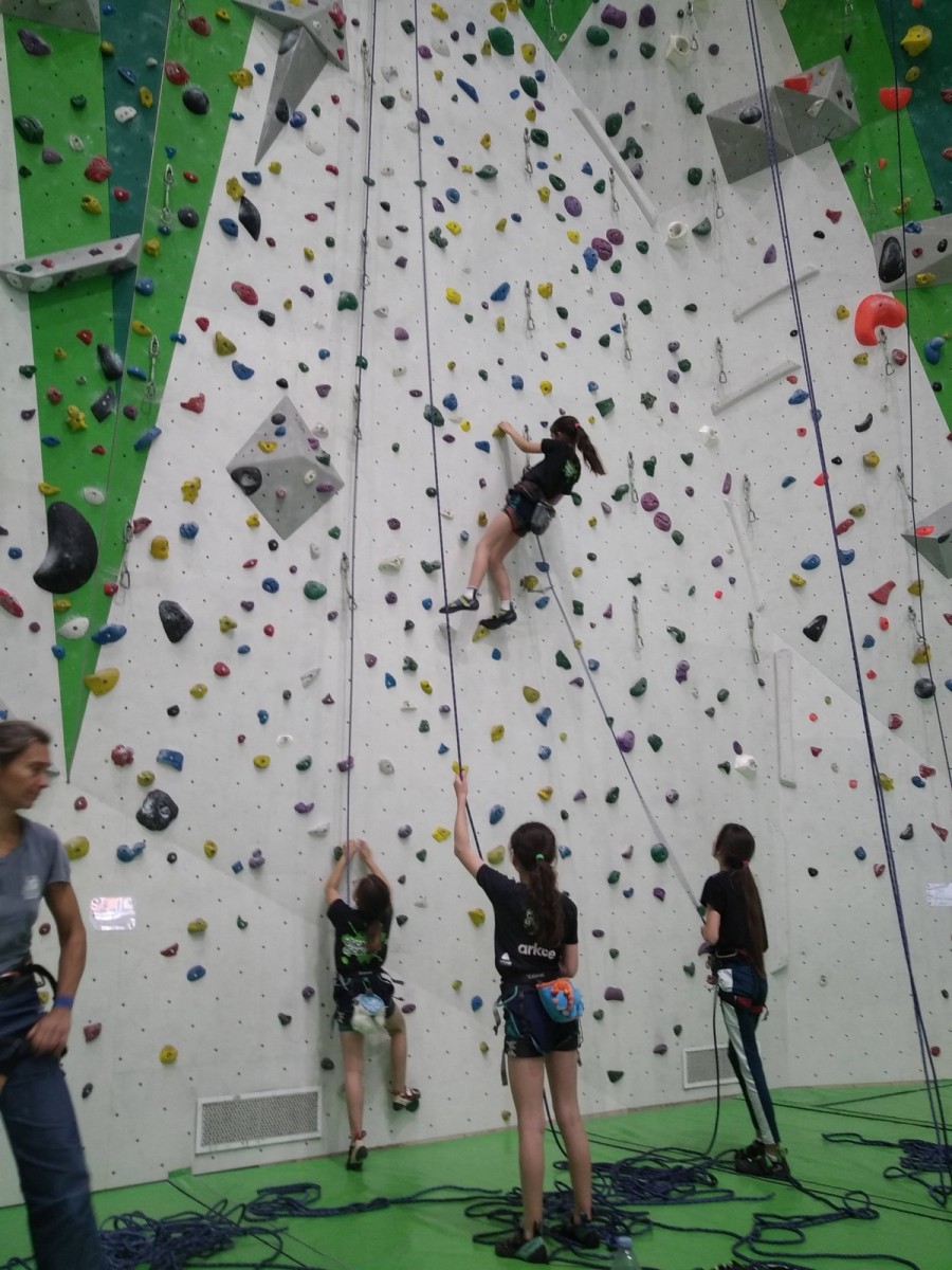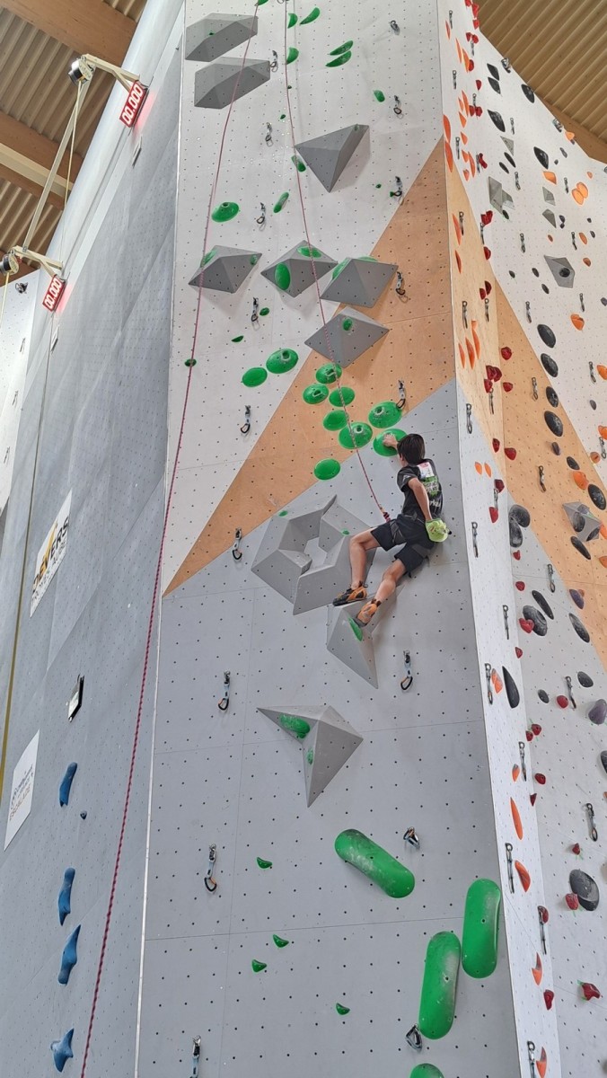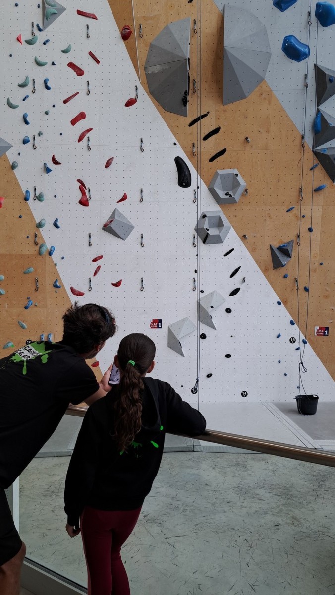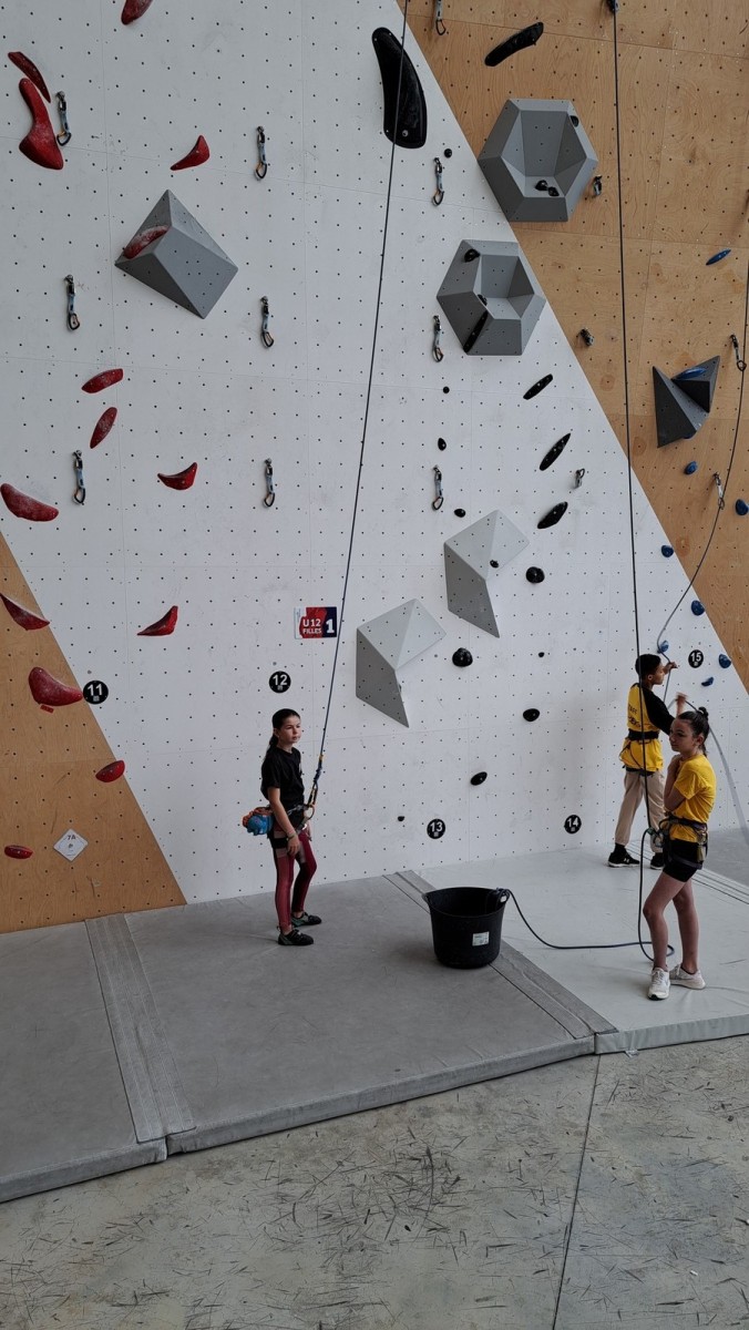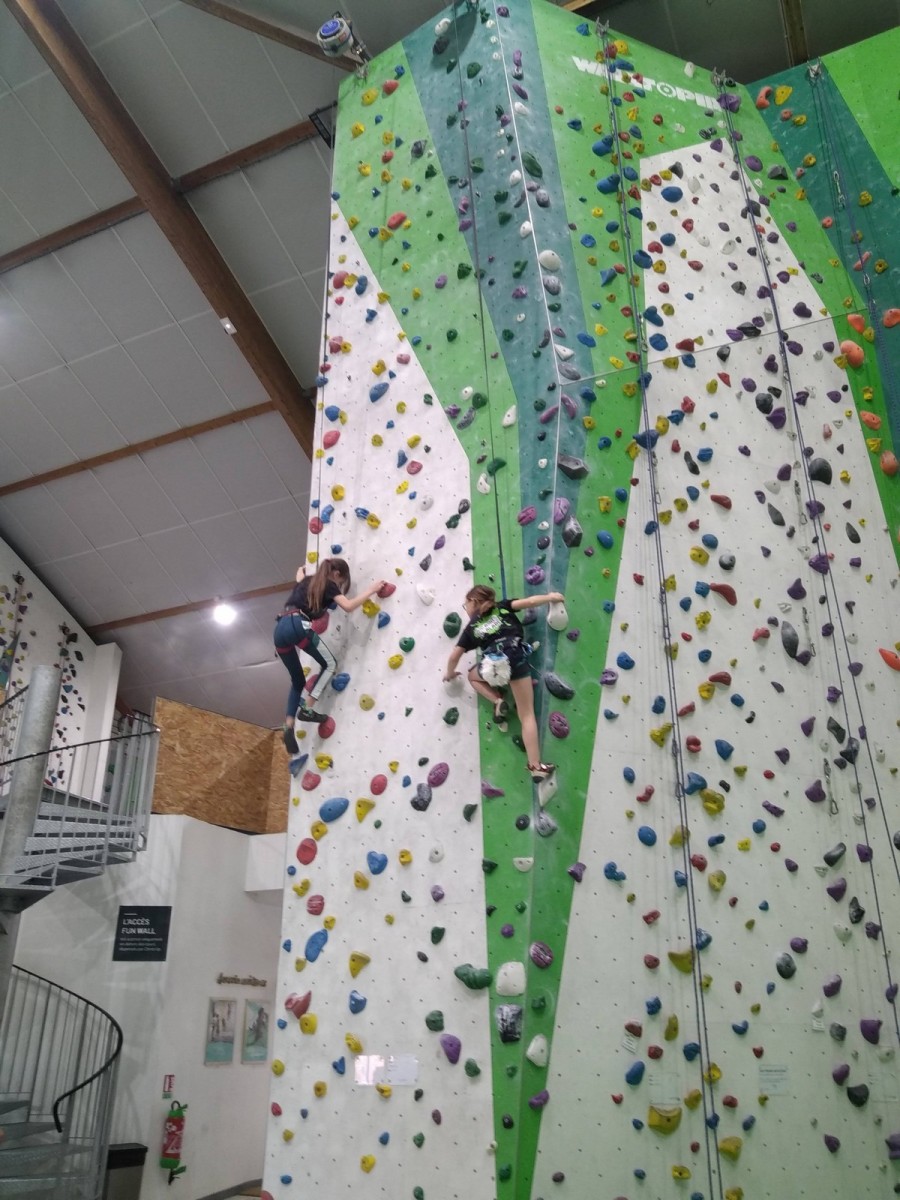 Aujourd’hui, il n’est pas temps question de performance que de plaisir. Les enfants grimpent à leur rythme, certains en moulinette, certains en tête. Quelques-uns iront jusqu’à essayer du 6a à l’image de Mélia et Baptiste mais la plupart restent dans leur zone de confort dans le 5. Ce qui n’empêche pas Alaric de faire sa première chute en tête, brillamment assurée par Milo !