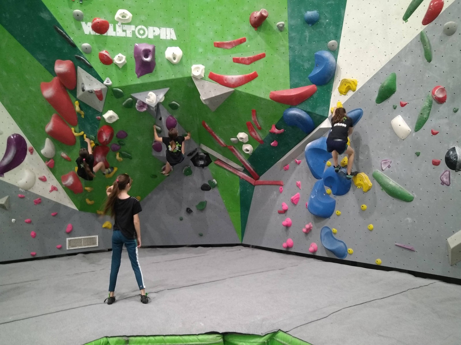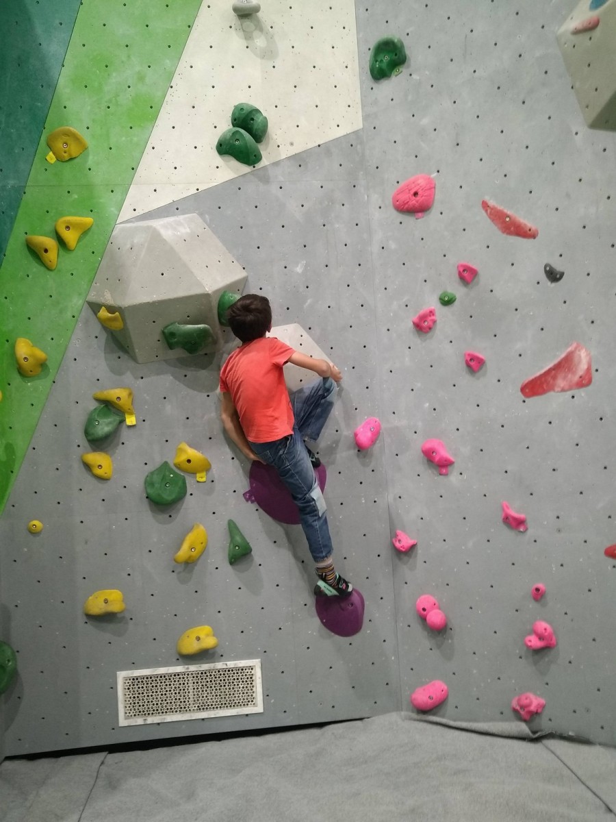 Et c’est parti pour l’escalade ! J’attaque avec les plus jeunes : Romane, Lino, Rose, Lilas, Lya, Maya et Mélia. Ils connaissent déjà les rudiments de l’activité puisqu’on avait fait une session en septembre, de la pose de pads à la parade. Les parents sont également vigilants et bien présents derrière nos jeunes bambins qui se chauffent allègrement dans les premiers blocs adaptés à leur taille.