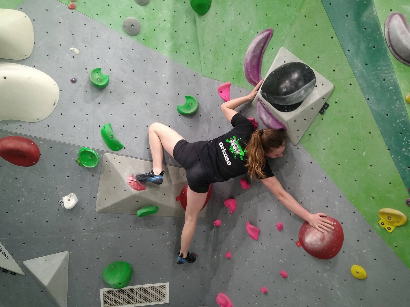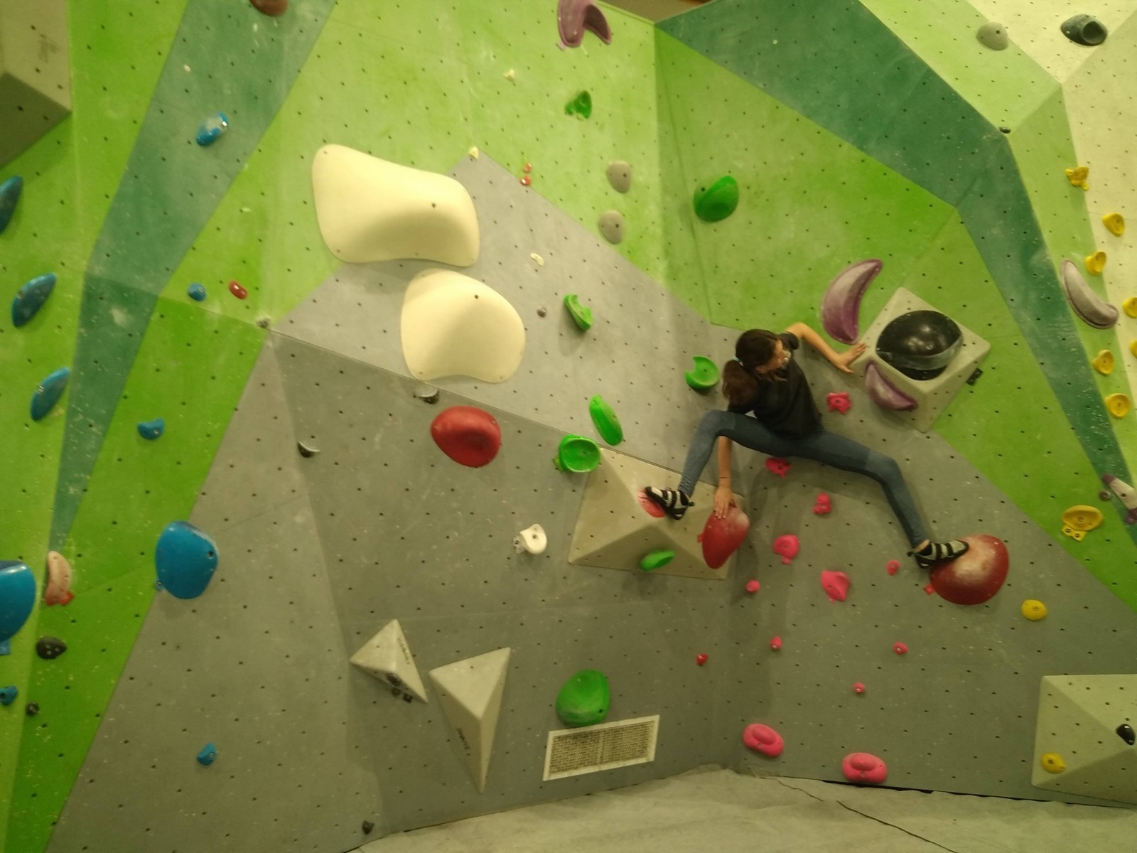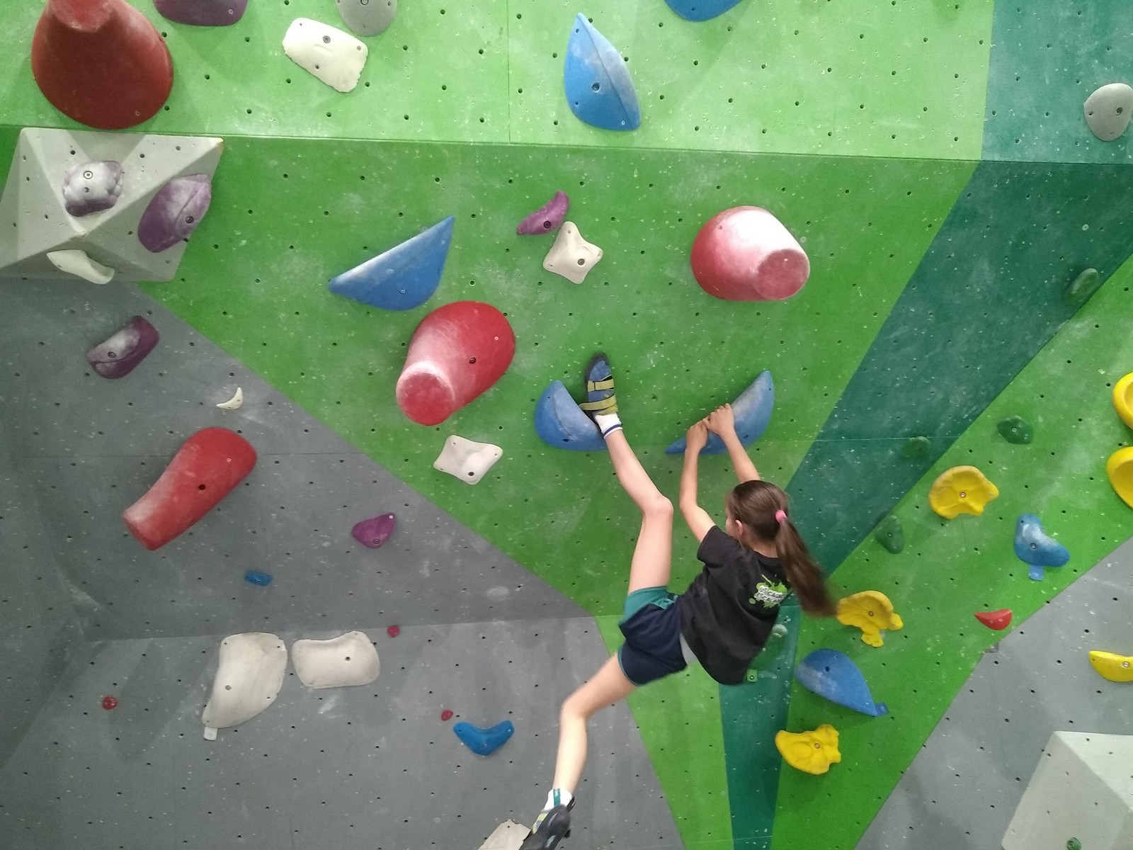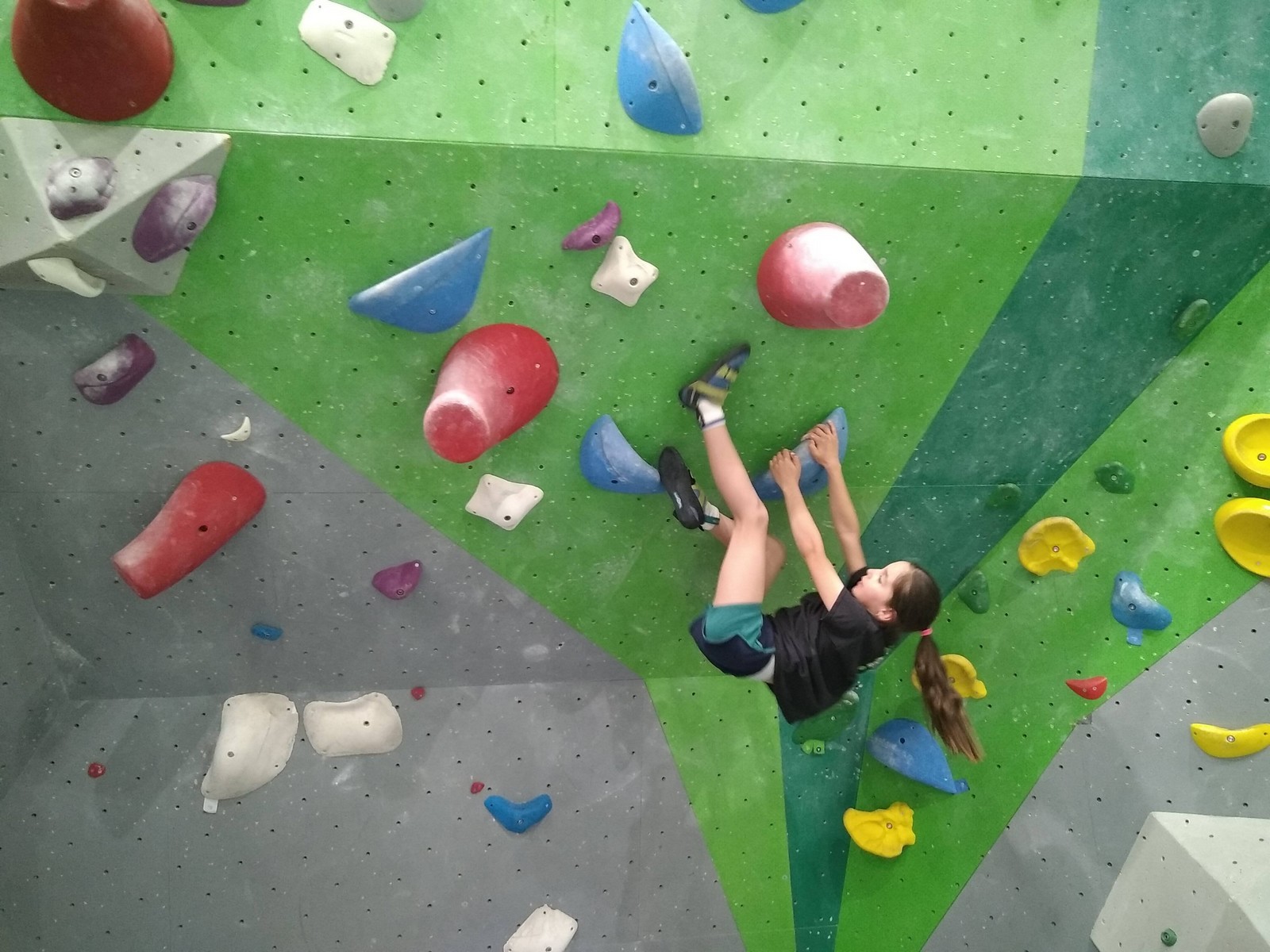 Les plus grands étant occupés ar un stage de l’équipe régionale, c’est surtout avec les petits que nous avons arpenté les blocs et les voies de cette structure. Au programme, du à vue en masse, à essayer des blocs dans un style différent de ce qui se fait chez nous (et moins morpho également) et des voies de tous niveaux.