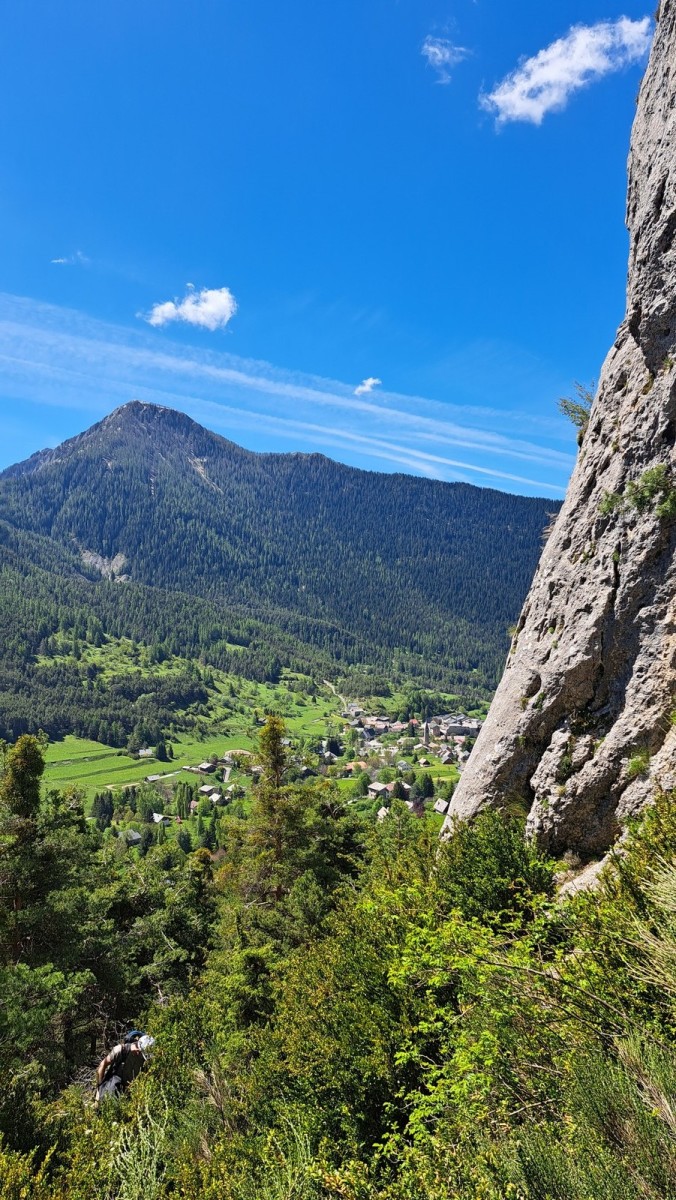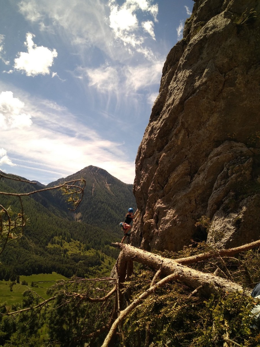 Les longueurs s’enchaînent après une petite frayeur au R1. Camille maîtrise à merveille et je peux m’occuper de Laura jusqu’au passage d’un petit gendarme qu’on arrive à négocier sans perdre trop de temps. Là, c’est Brice qui prend le relais jusqu’à la vire (le chemin de ronde) juste sous le sommet. Camille se lance dans la dernière longueur en 6a+ et quelques minutes plus tard, nous voilà tous à apprécier la vue depuis la cime du piton rocheux. La descente demande de la prudence mais nous retournons à la voiture sans encombre.
