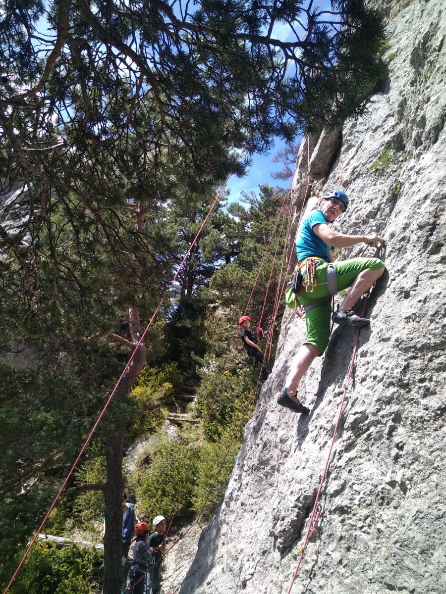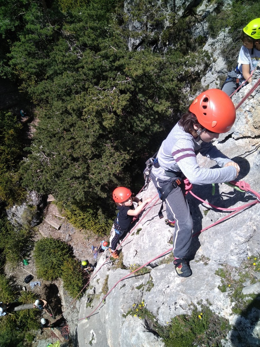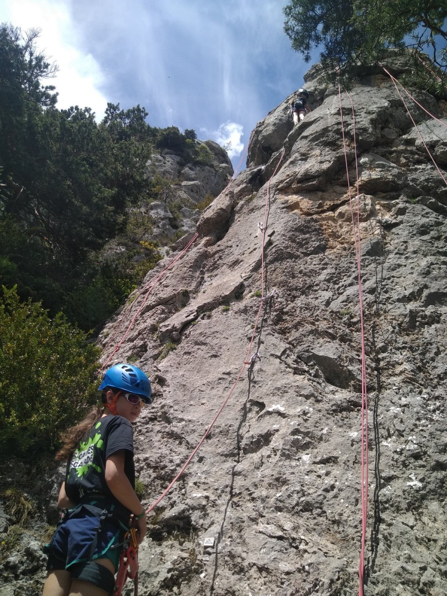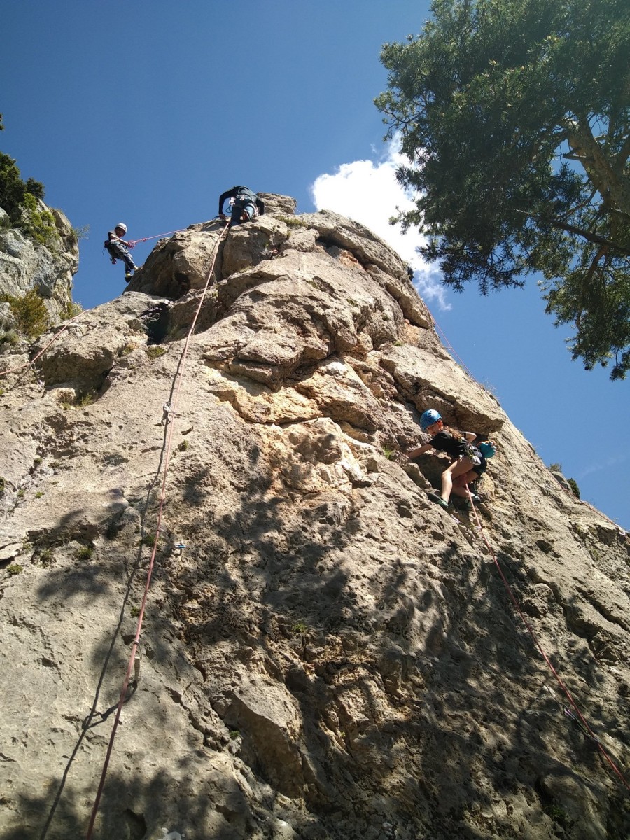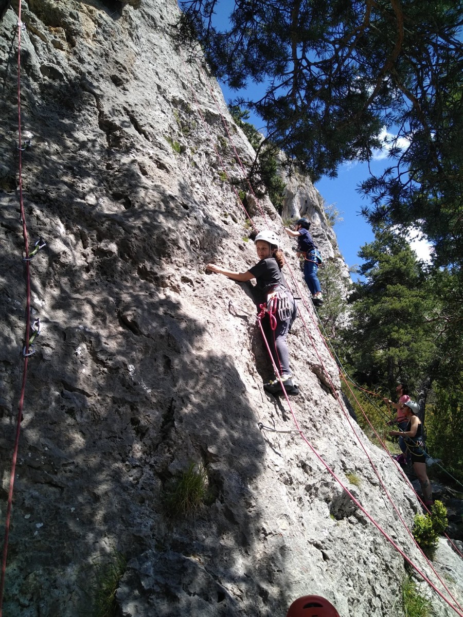 Nous choisissons le petit secteur bien dense du Donjon, là où se cotoient 9 voies entre 5a et 5c. Parfait. Après un petit rappel sur la manip de haut de voie, c’est parti pour l’installation des cordes. Ils sont nombreux à être à l’aise dans ce niveau et très vite, une corde pend à chaque relais et le bal vertical est bien lancé.