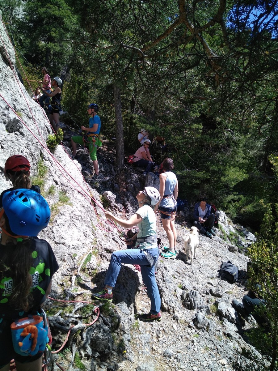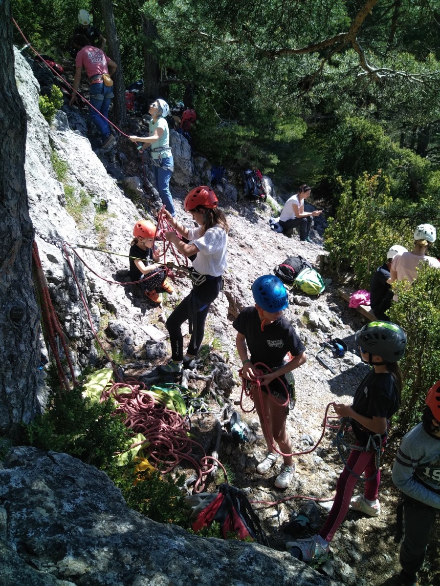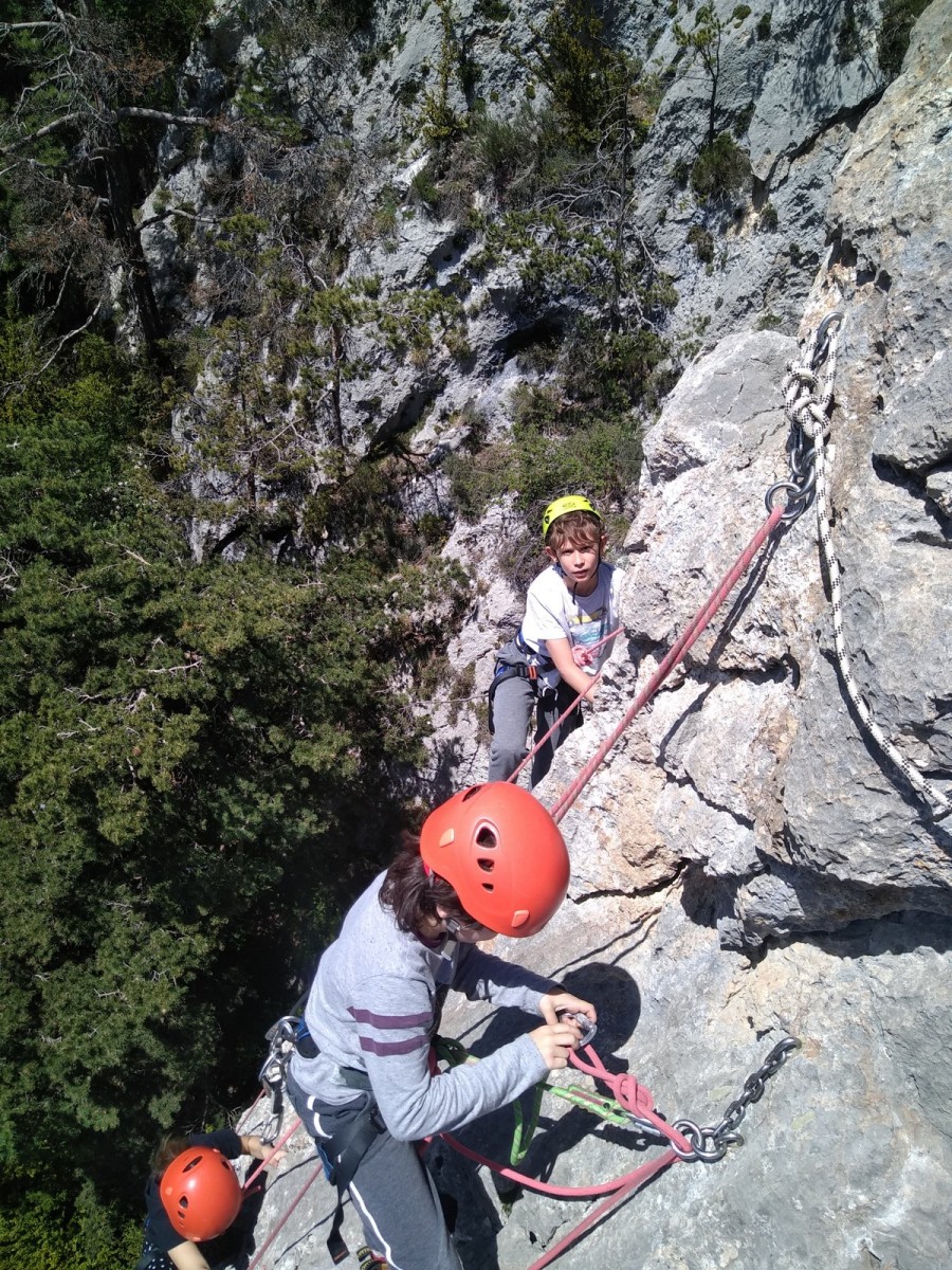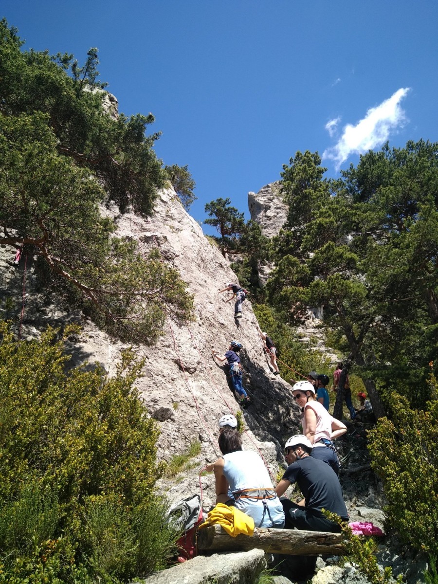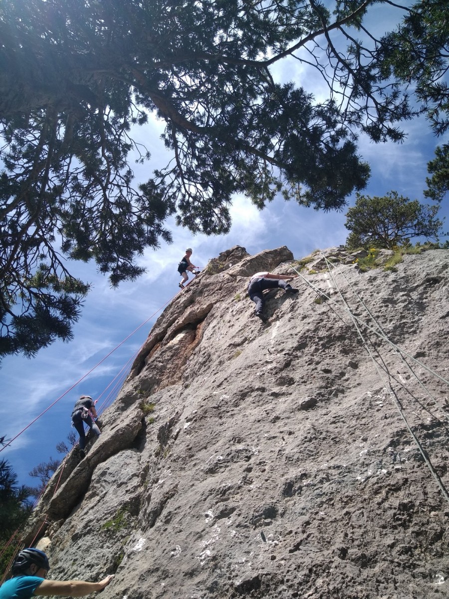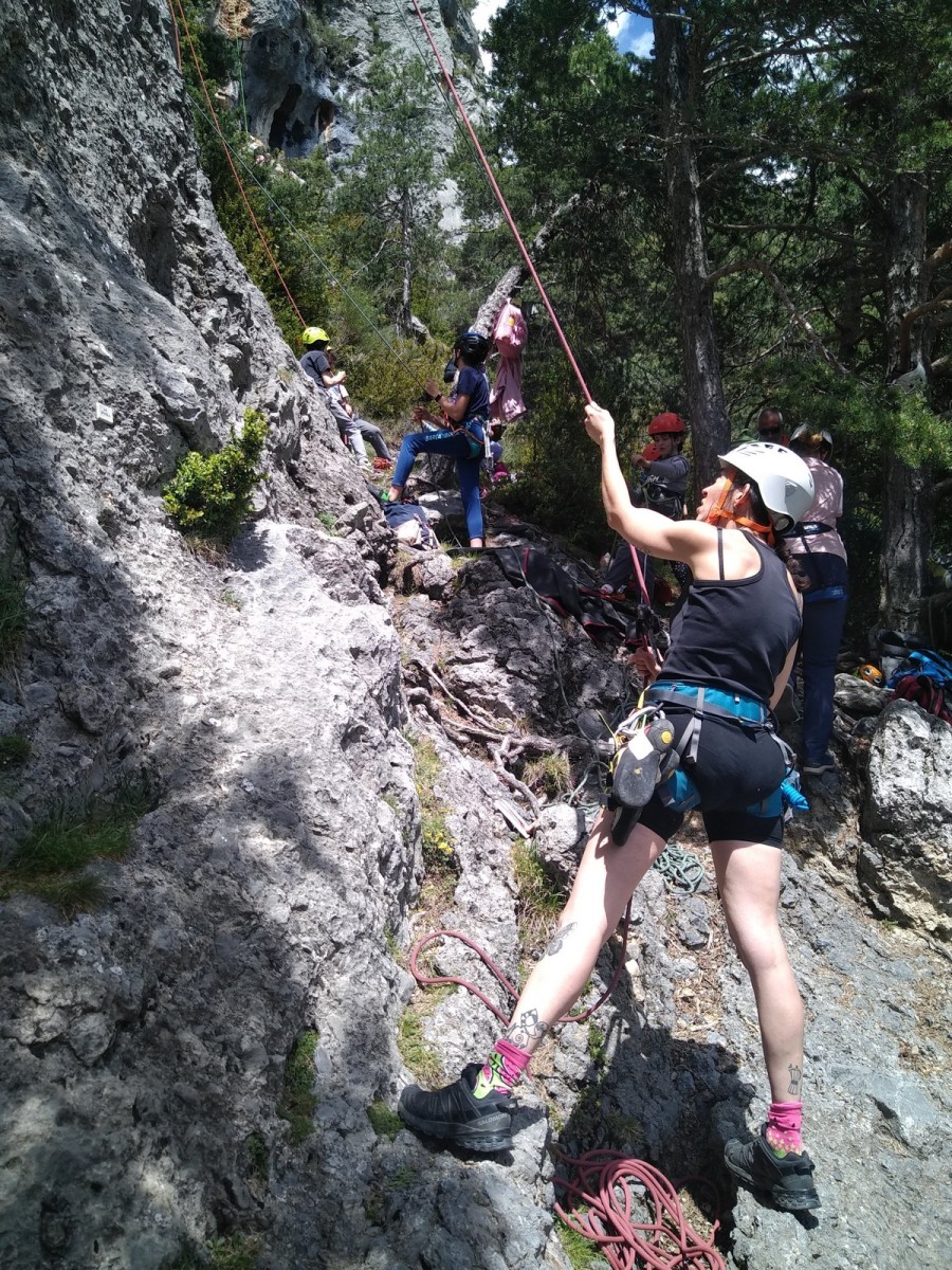 Nous choisissons le petit secteur bien dense du Donjon, là où se cotoient 9 voies entre 5a et 5c. Parfait. Après un petit rappel sur la manip de haut de voie, c’est parti pour l’installation des cordes. Ils sont nombreux à être à l’aise dans ce niveau et très vite, une corde pend à chaque relais et le bal vertical est bien lancé.