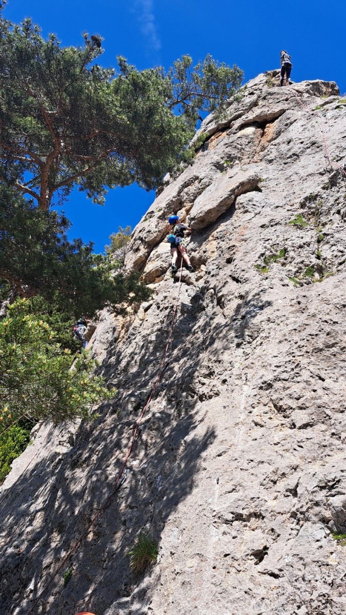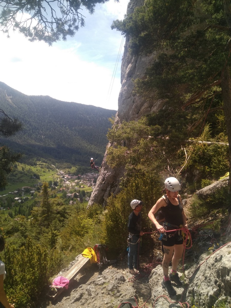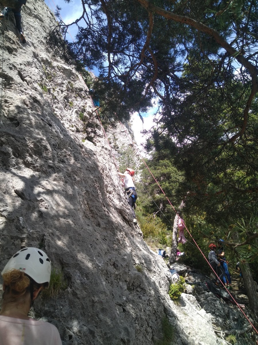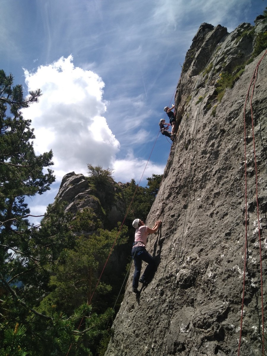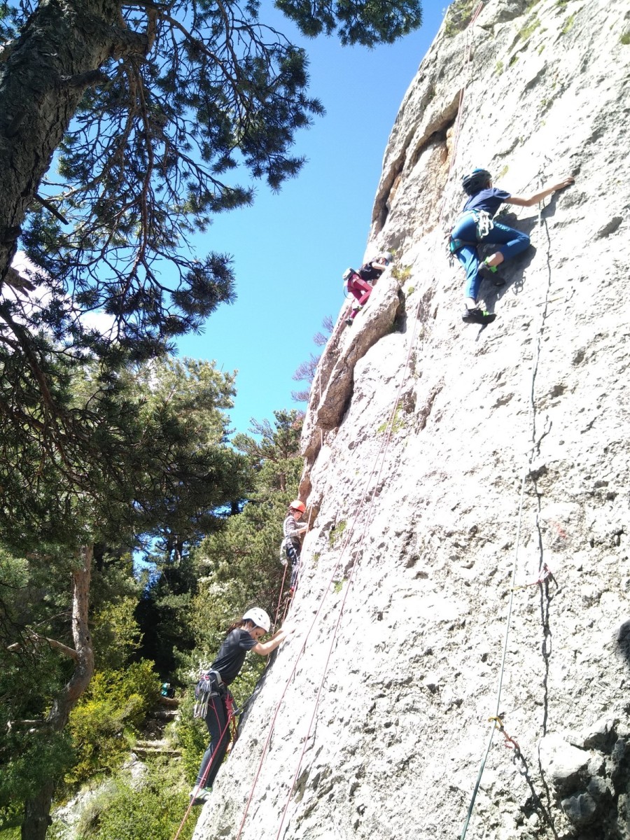Nous choisissons le petit secteur bien dense du Donjon, là où se cotoient 9 voies entre 5a et 5c. Parfait. Après un petit rappel sur la manip de haut de voie, c’est parti pour l’installation des cordes. Ils sont nombreux à être à l’aise dans ce niveau et très vite, une corde pend à chaque relais et le bal vertical est bien lancé.