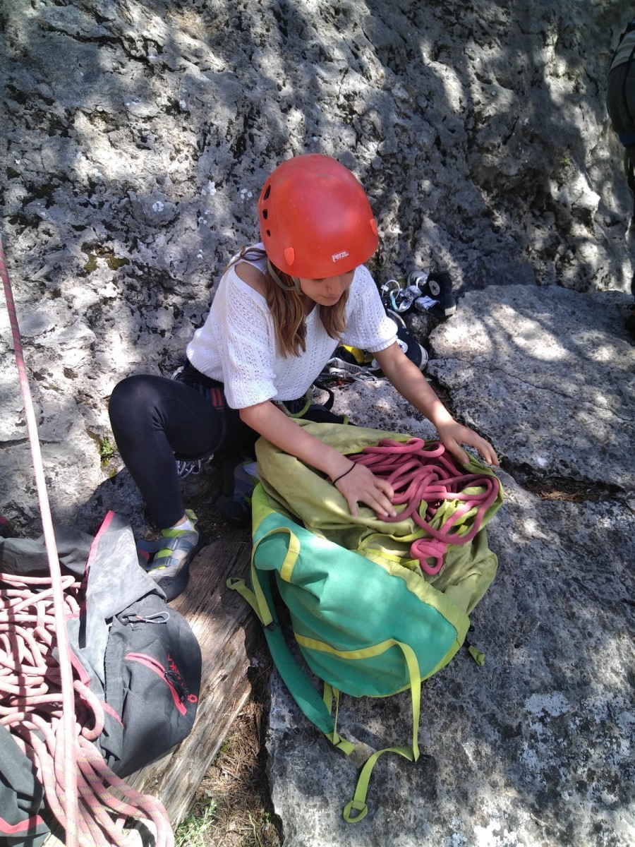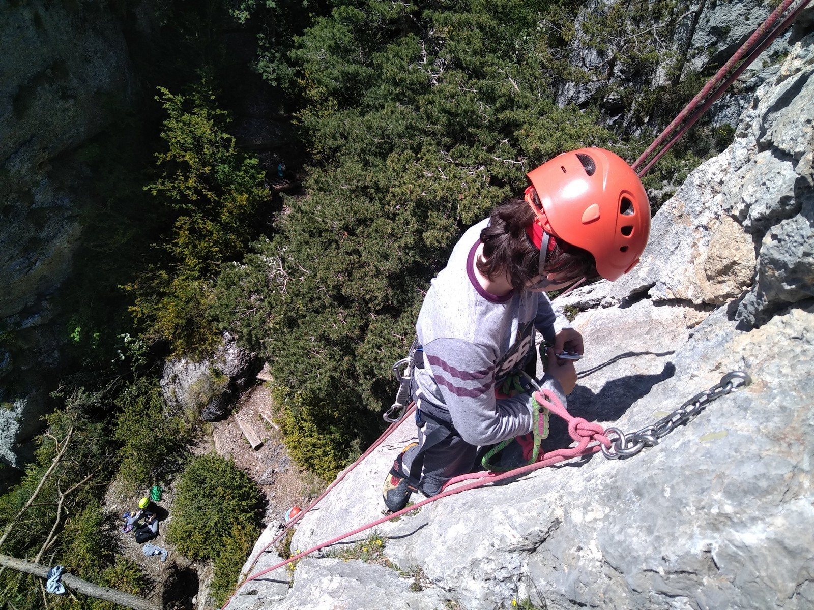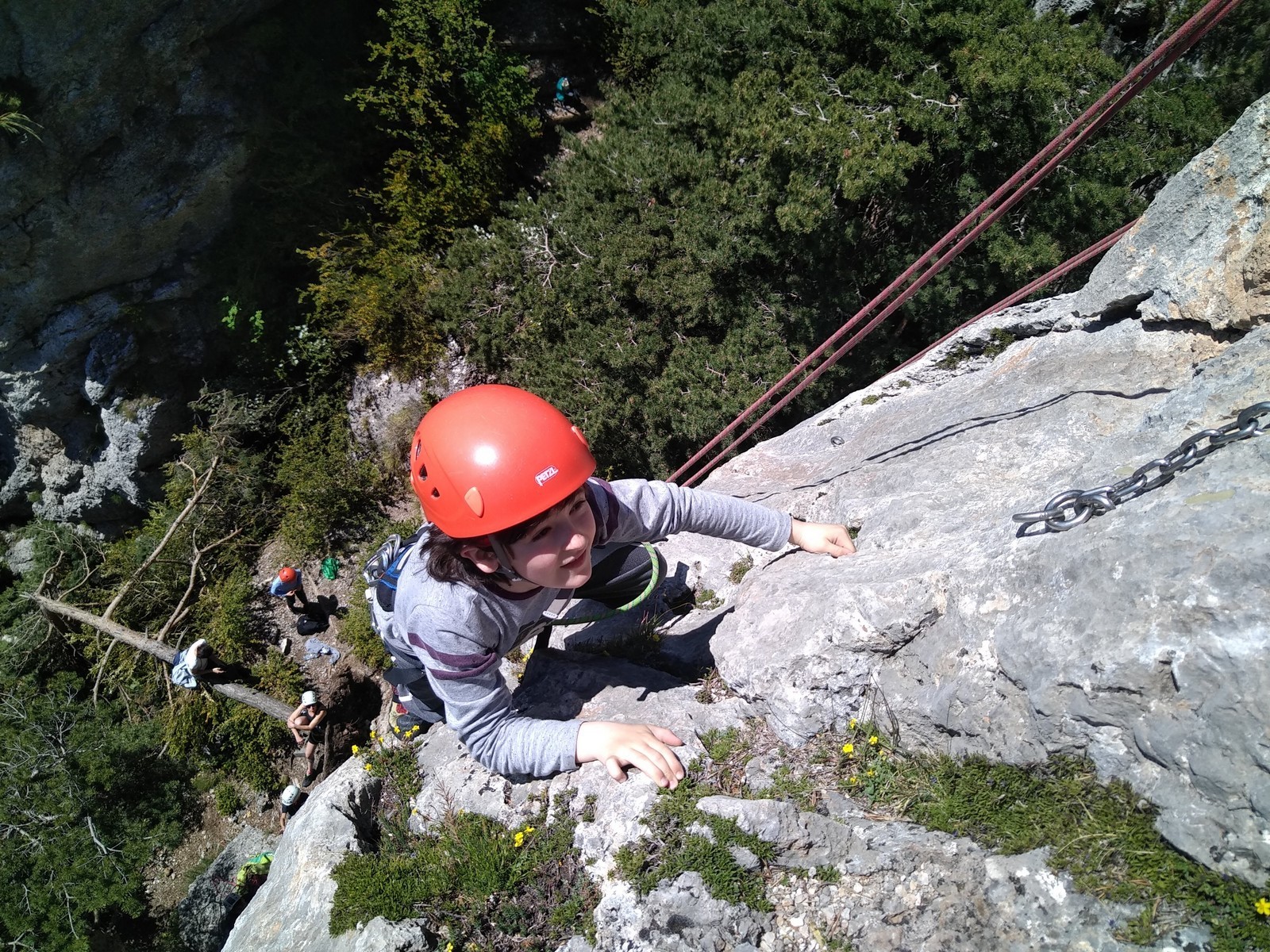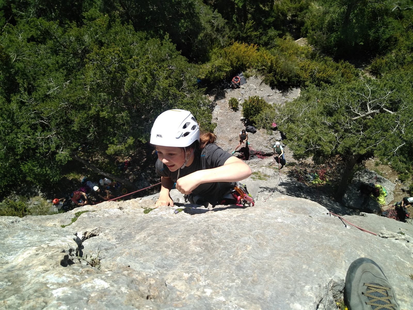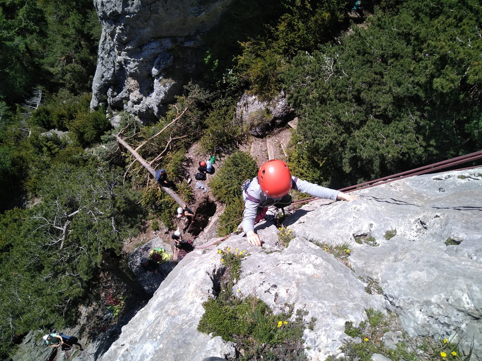 Nous choisissons le petit secteur bien dense du Donjon, là où se cotoient 9 voies entre 5a et 5c. Parfait. Après un petit rappel sur la manip de haut de voie, c’est parti pour l’installation des cordes. Ils sont nombreux à être à l’aise dans ce niveau et très vite, une corde pend à chaque relais et le bal vertical est bien lancé.