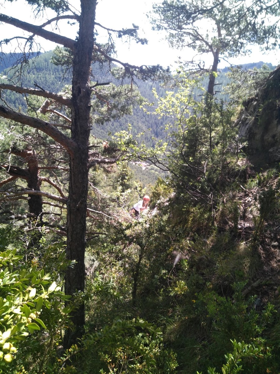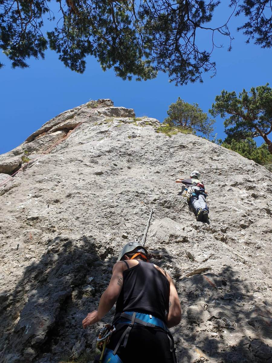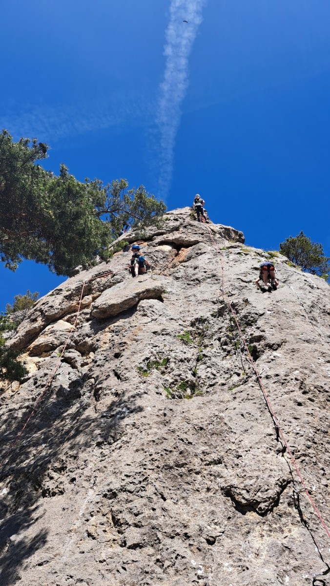Le groupe de Yannick se prépare pour un projet d’ampleur. Durant la marche d’approche Cécile et Yannick, obnubilés par la recherche du départ de la voie, délaissent un peu leurs coéquipiers qui, sans topo, s’égarent, descendent pour remonter et ainsi peaufinent leur échauffement. Une fois tous au pied de la voie, les cordées s’organisent. Cécile, Sandrine et Yannick font partie de la première cordée. Djé, Eric et Xavier leur collent aux basques. Dans la deuxième longueur un « pas » marque la première difficulté. Cécile prend la place de leader et s’envole pour trois longueurs extraordinaires, des taffonis aux formes incroyables qui laissent pantois. Notre présidente, pleine de confiance, chemine tranquillement en plaçant ses friends et câblés. Dans la cordée d’en dessous c’est Éric qui prend la tête pour sa première en terrain d’aventure. Il s’amuse comme un enfant et réclame des clichés à chaque protection posée. Il faut dire que le cadre s’y prête, un caillou d’exception, des couleurs fantastiques avec la rivière, bien connue des canyoneurs, » la Vacca » qui coule 150 mètres en dessous. Au R5, un petit rappel est requis pour accéder à la suite. Dans la cordée de tête Cécile laisse sa place à Sandrine. qui s’en sort parfaitement. Le groupe se retrouve rapidement au pied de la dernière longueur. Ici deux options, soit s’échapper par le chemin de ronde soit gravir un 6a+ d’anthologie afin de parvenir au sommet. Djé, Xavier, Eric et Sandrine ont leur compte et s’échappent pendant que Cécile poursuit avec Yannick. Les taffonis tiennent leurs promesses, ici point de crux subtil : on prend les bacs et on tracte pour être finalement récompensés par la vue au sommet ! Majeur…