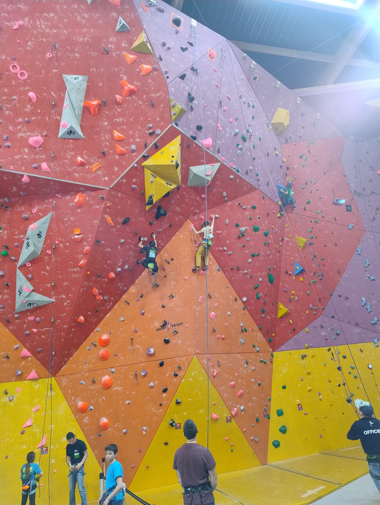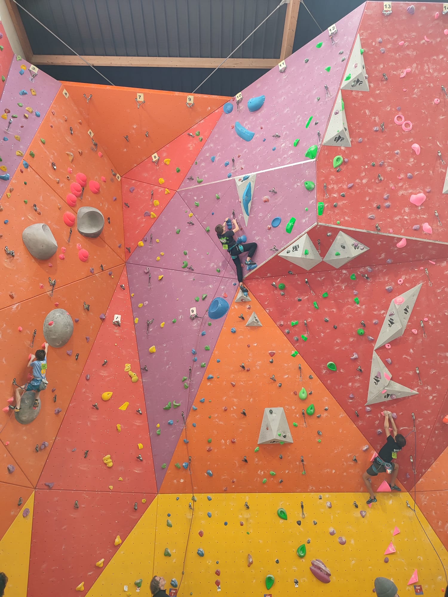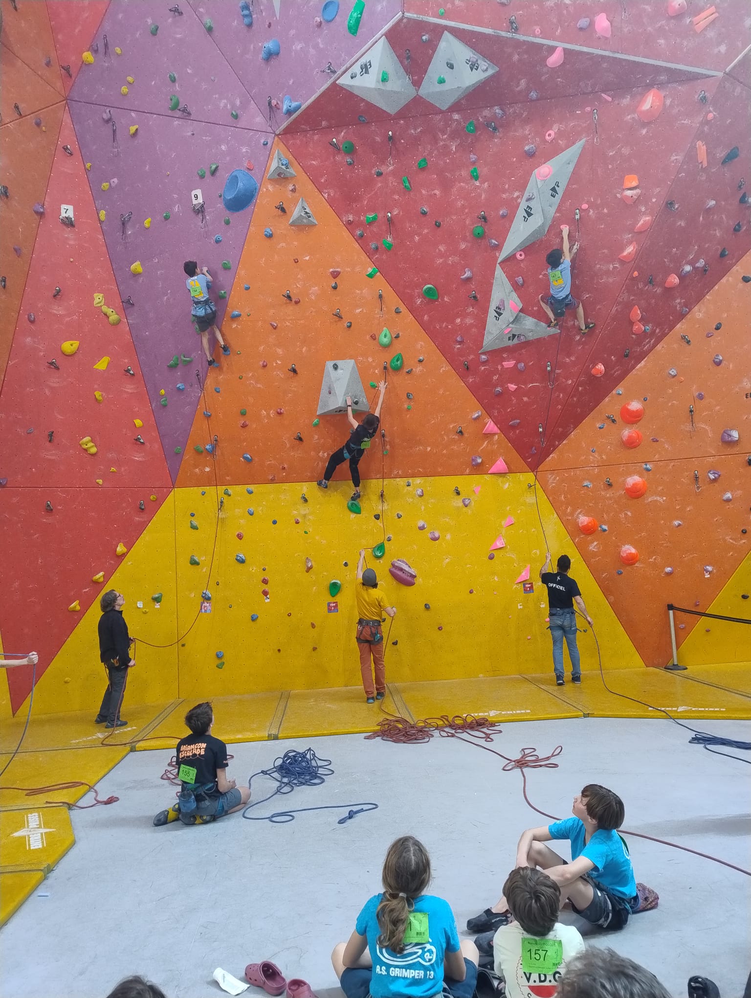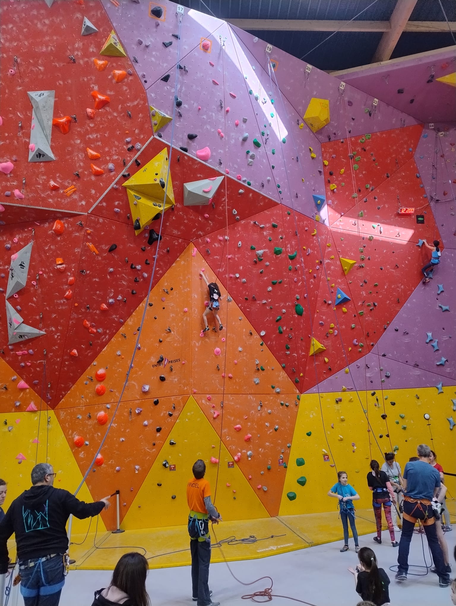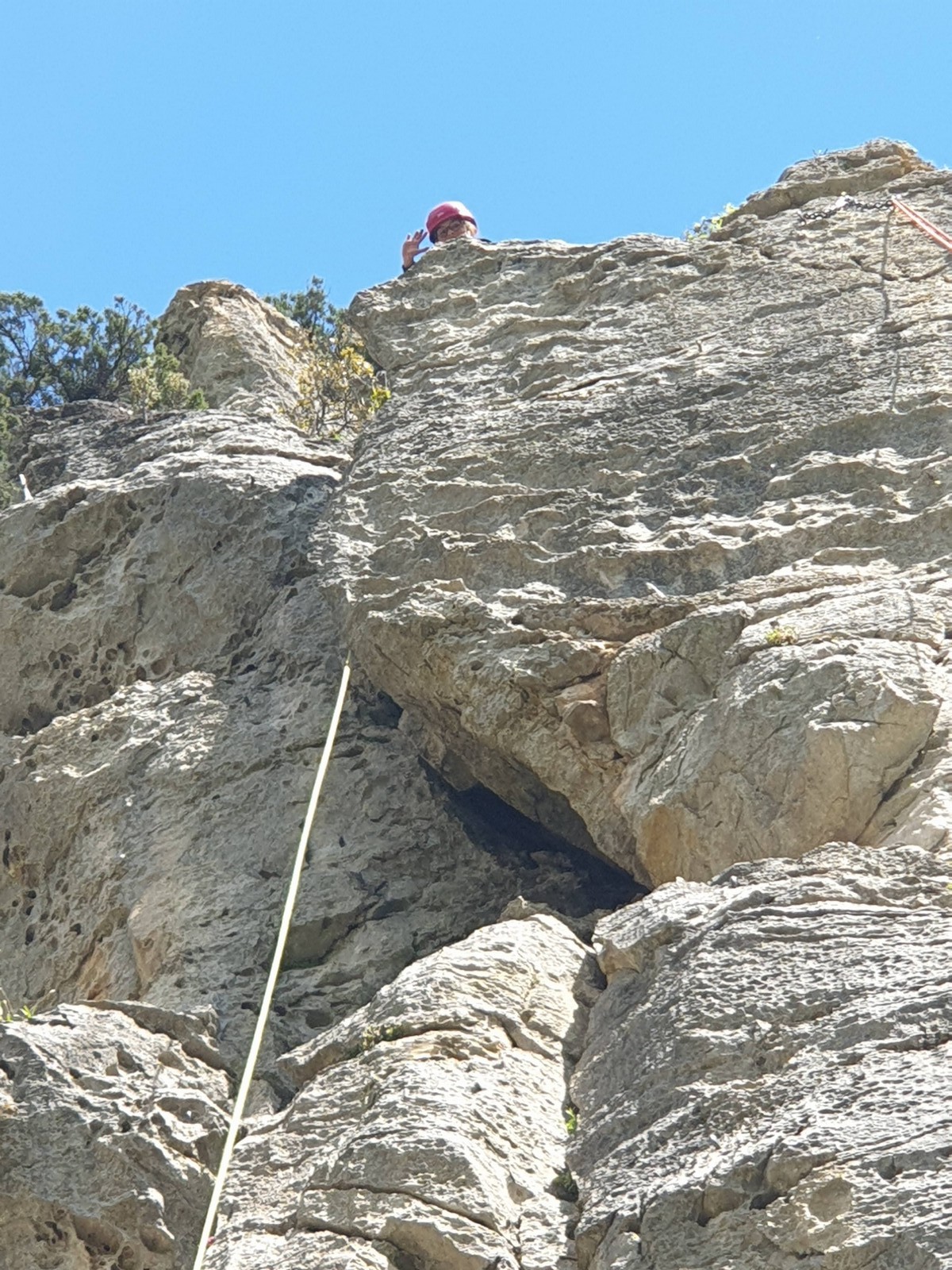 L’après-midi, les voies plus sérieuses attendent les jeunes. Léane parcourt l’interminable 7a « Cap Horn » mais la réussite n’est pas au rendez-vous, madame Lerebours choit dans les derniers mètres. La cordée « Mélia-Rose » s’active et s’en va découvrir un 6b puis Mélia continuera la moisson en enchaînant presque en sifflotant le 6b+ déversant juste à côté. Matéo s’élève dans » Le colibri », un 5b+ de plus de 40 mètres installé par Lia mais ne parvient pas à toucher le relais à quelques mètres près. Sylvain installe la moulinette dans le plus que superbe Borderline, un 6b+ de 40m qui verra les assauts de quelques valeureux grimpeurs comme Timéo et Mani.