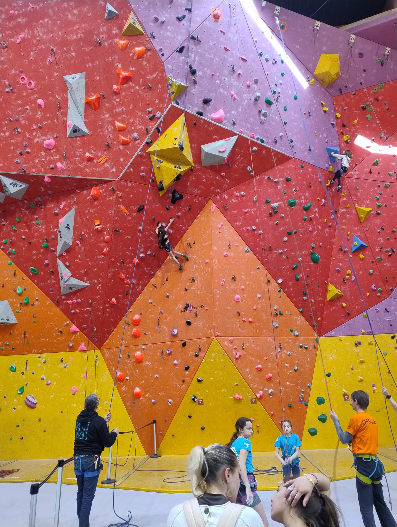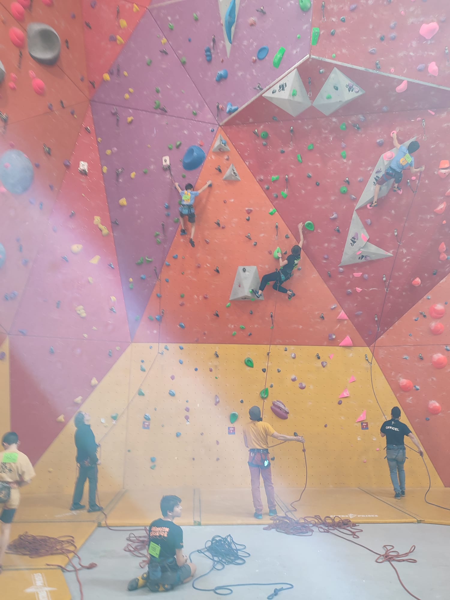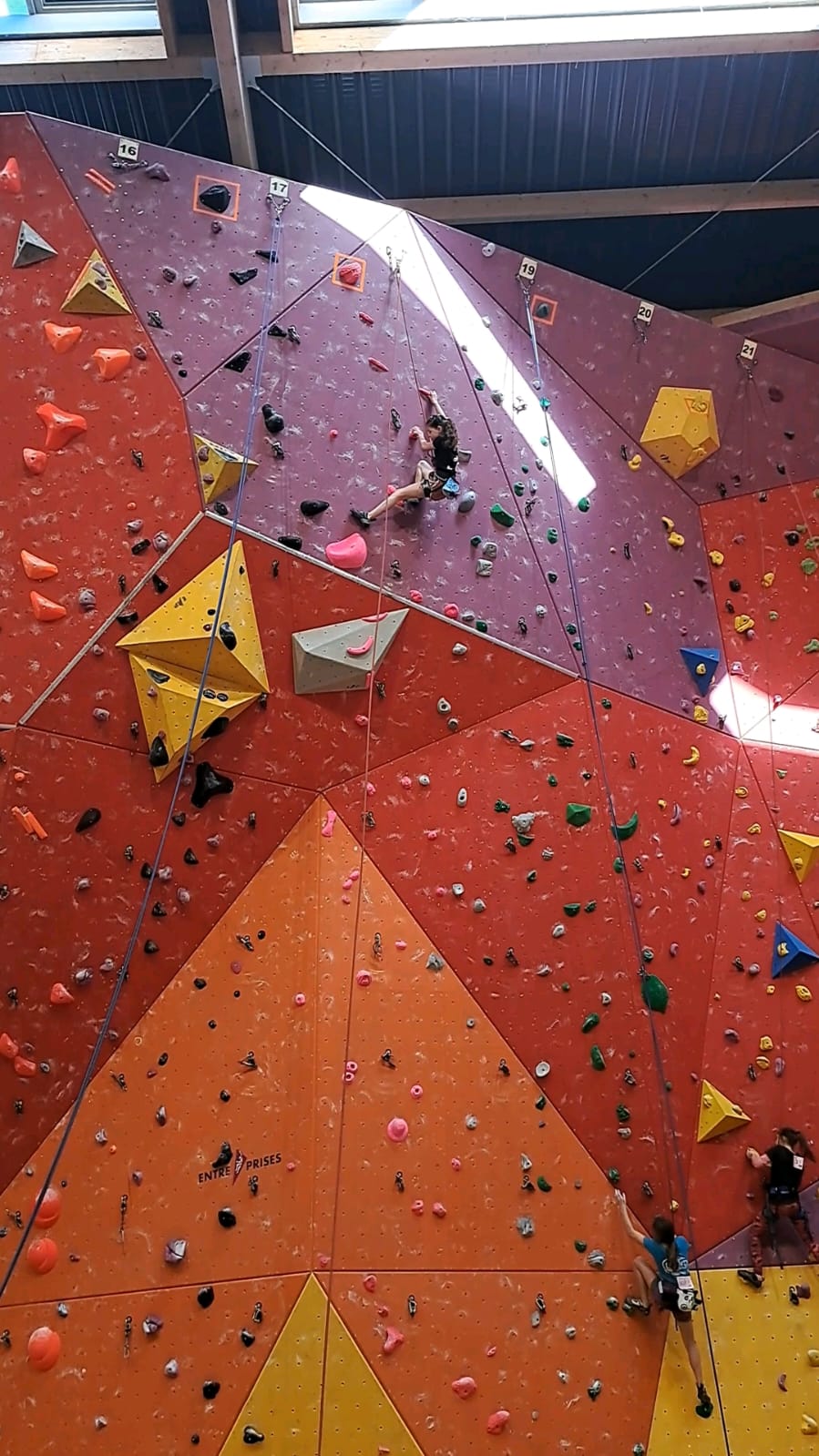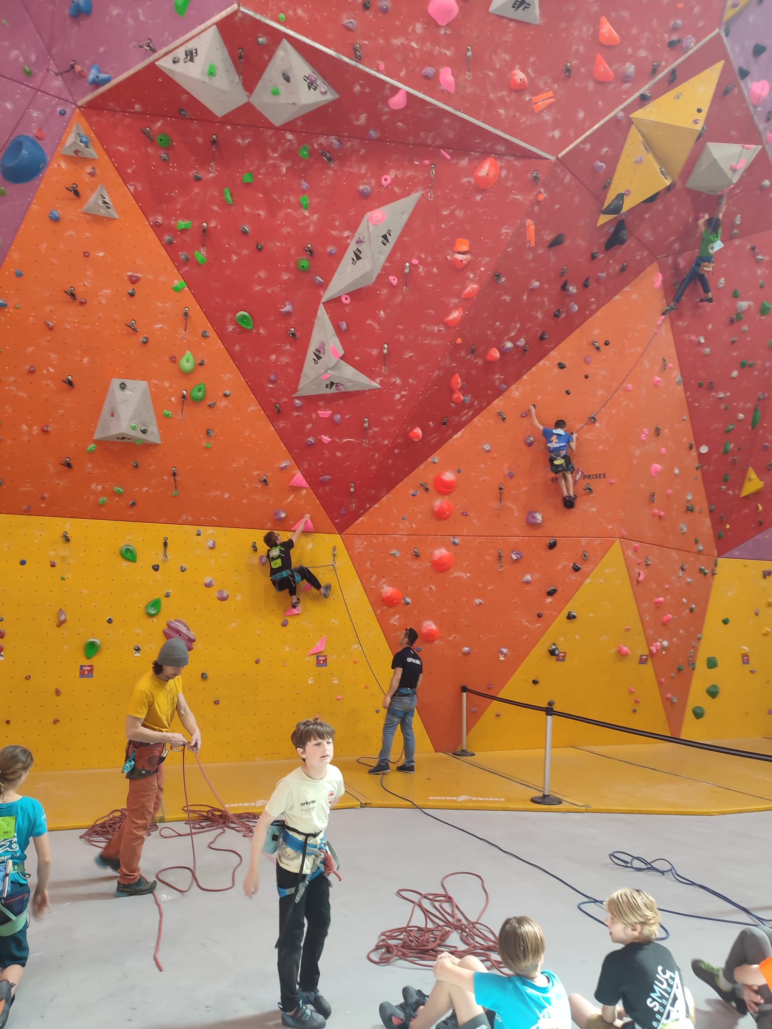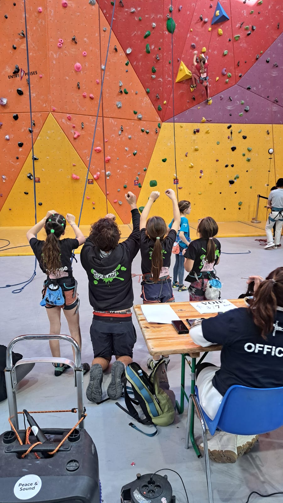 L’après-midi, les voies plus sérieuses attendent les jeunes. Léane parcourt l’interminable 7a « Cap Horn » mais la réussite n’est pas au rendez-vous, madame Lerebours choit dans les derniers mètres. La cordée « Mélia-Rose » s’active et s’en va découvrir un 6b puis Mélia continuera la moisson en enchaînant presque en sifflotant le 6b+ déversant juste à côté. Matéo s’élève dans » Le colibri », un 5b+ de plus de 40 mètres installé par Lia mais ne parvient pas à toucher le relais à quelques mètres près. Sylvain installe la moulinette dans le plus que superbe Borderline, un 6b+ de 40m qui verra les assauts de quelques valeureux grimpeurs comme Timéo et Mani.