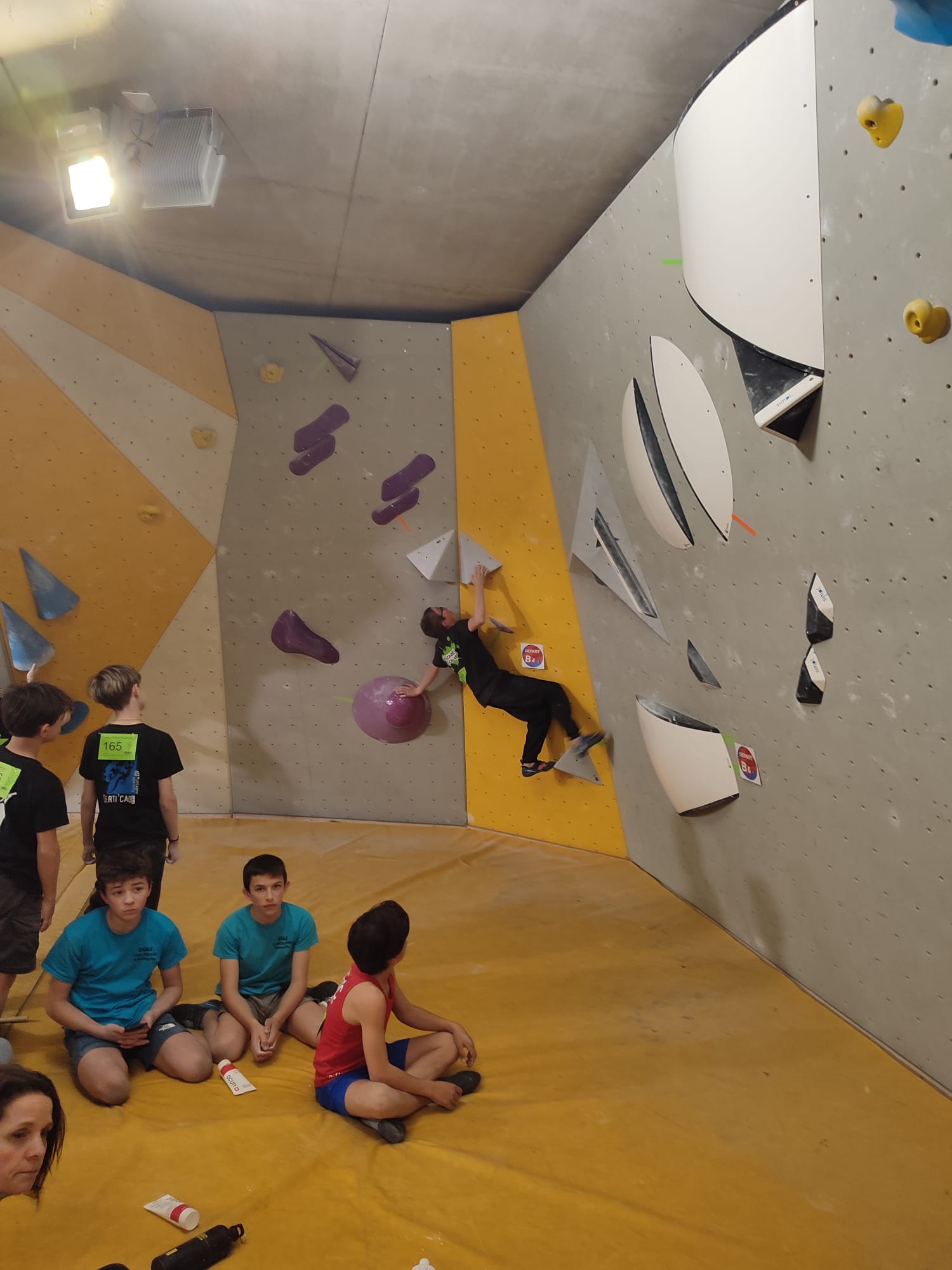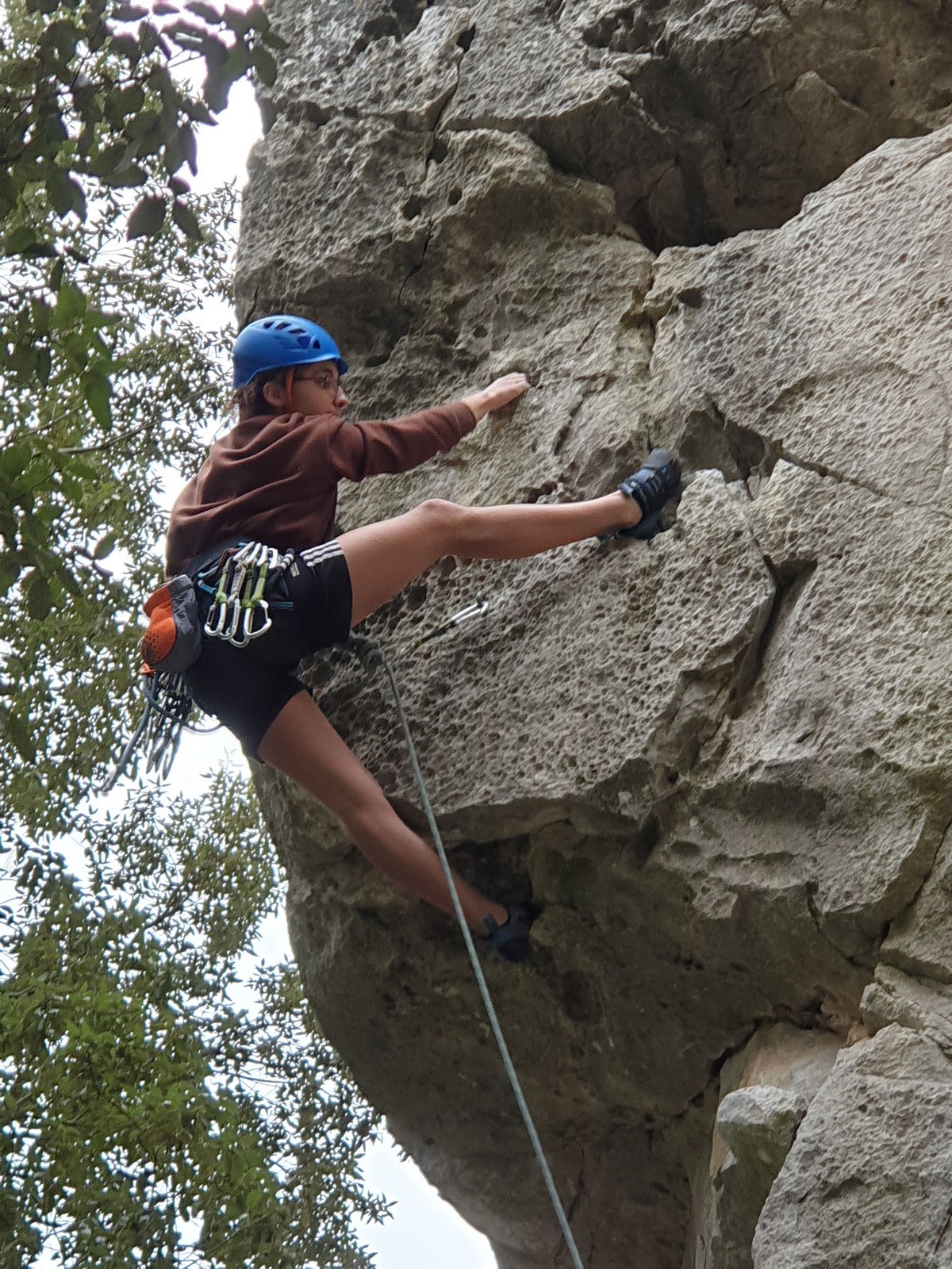 Une fois l’après-midi, le gros des troupes reste sur place à poncer toutes les voies possibles jusqu’à 6b+. Mais un petit groupe retroune à la grande face et Mani est le premier à prendre la moulinette dans « Le chmatex » un 7a classique du secteur. Il monte encore et encore mais finit par tomber dans la section finale probablement géné par son entaille au doigt grâce à laquelle il marque toutes les prises de son ADN. Timéo ne se fait pas prier et, aidé par le » flash » du copain enchaîne directement cette même voie. Félicitations pour cette belle performance ! Lia se surpasse et va très loin dans « Arielle » un 6b+ aux points espacés. Bravo Lia ! Boris sort le grand jeu et enchaîne à vue … un 6b de quarante mètres ainsi que « Arielle » la voie citée précédemment. Sans surprise Mathis réalise au 1er essai « Abolition des privilèges » raté la veille puis signé une belle perf en empochant à vue » Les couleurs du charme », un 7b+ usant et engagé. Pour finir Léane enchaîne à vue deux des trois 7a classiques de la grande face, à savoir » Les frontières du néant » et » La chmatex », deux petits bijoux de dame nature. Et comment appelle t-on ce genre de voies les jeunes ?? Bah des voies complètement majeures évidemment !
