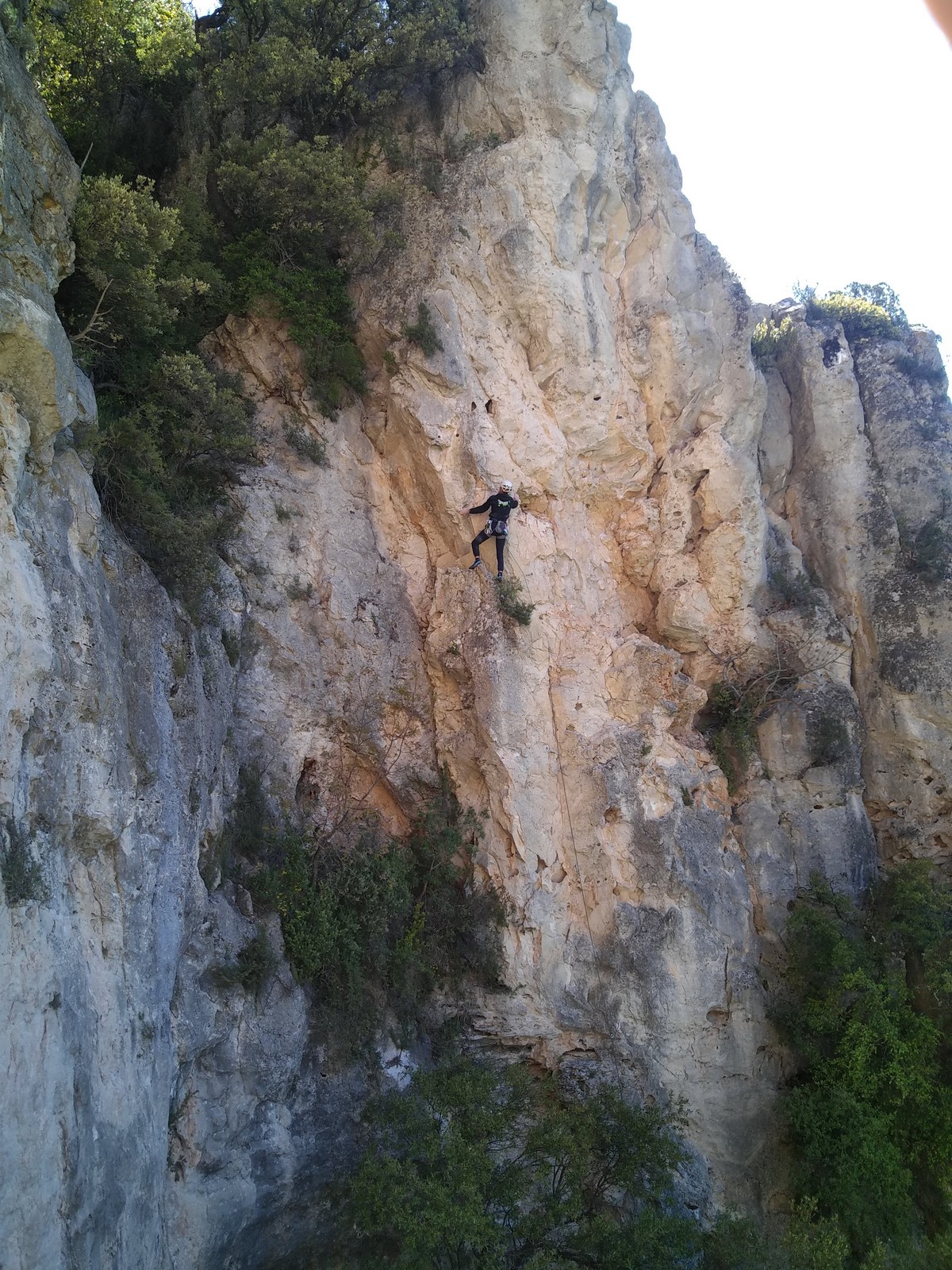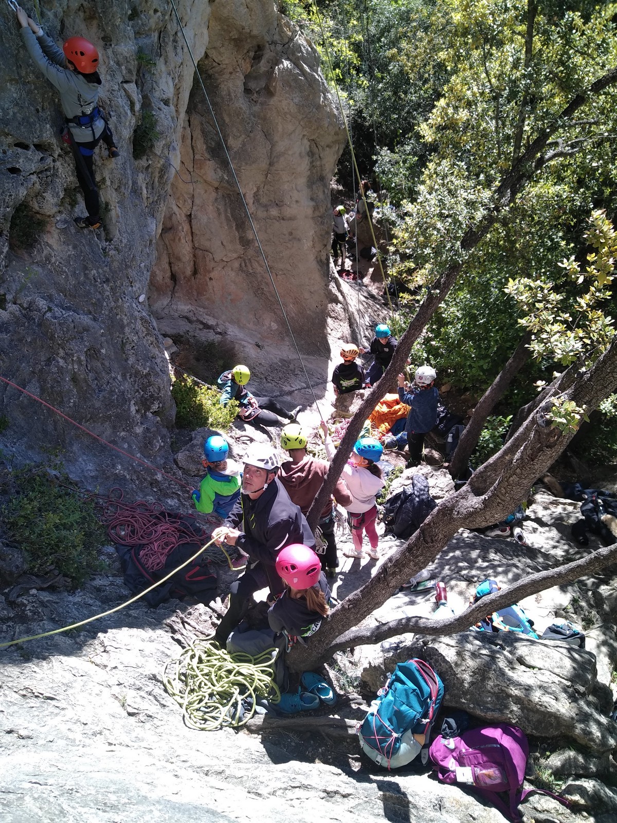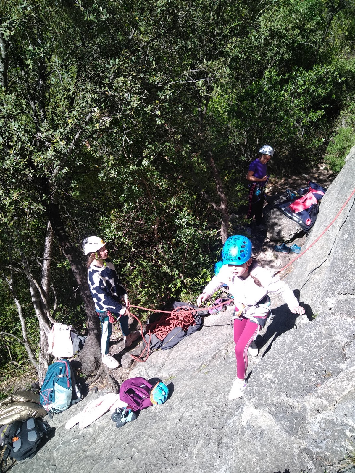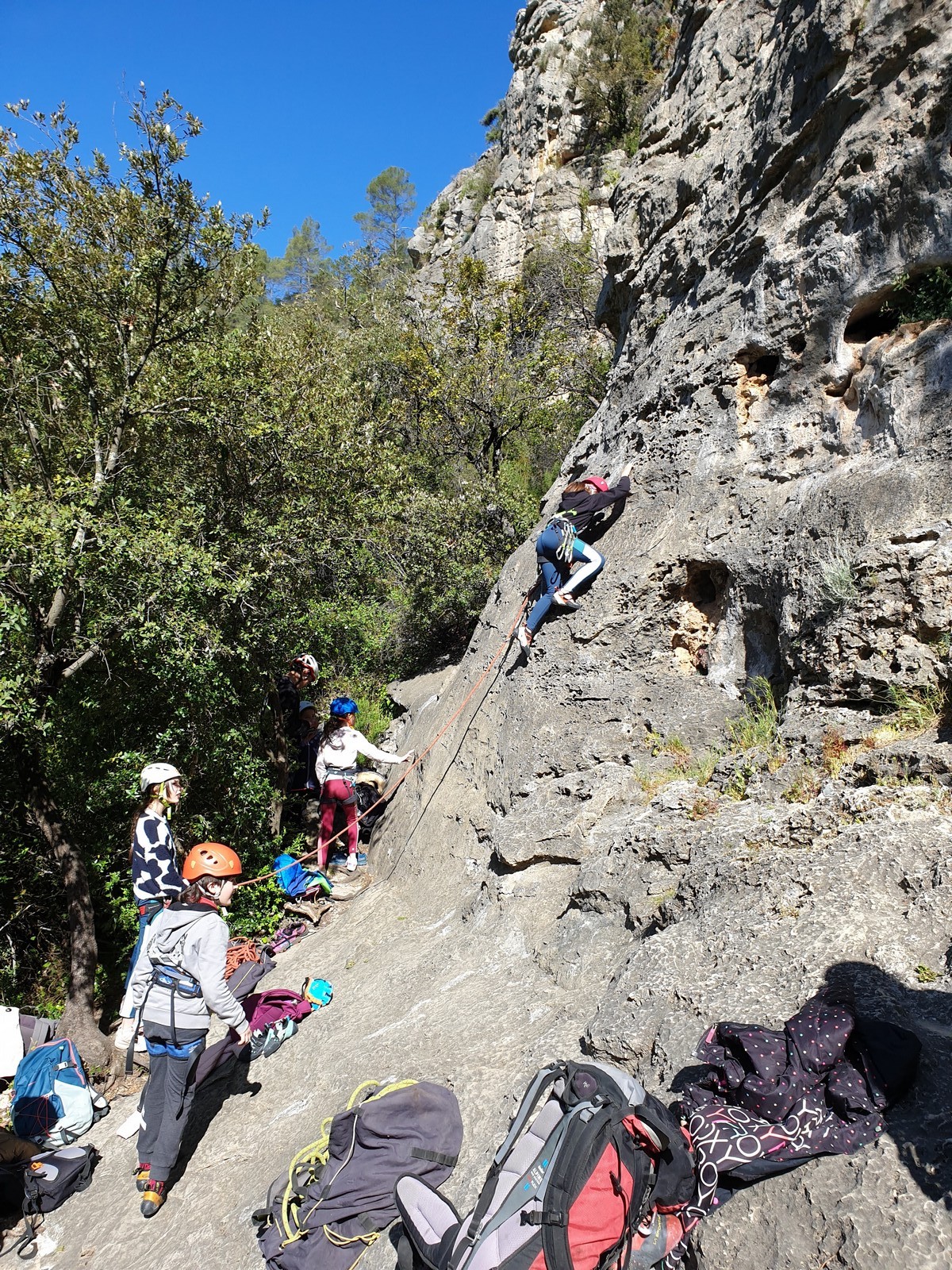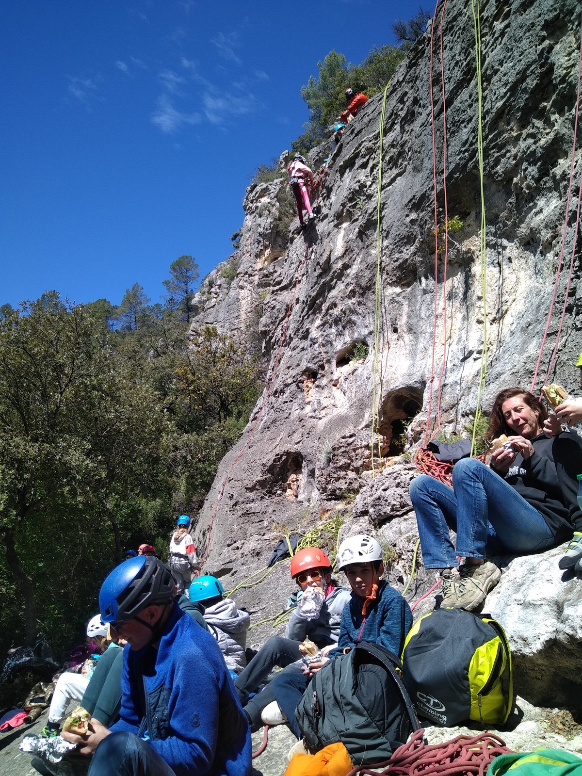 Aujourd’hui nous jetons notre dévolu sur les secteurs » Tintin », tout petit secteur idéal pour réviser l’escalade en tête dans des voies courtes et faciles et le secteur situé sur la vire juste au dessus proposant des voies d’un peu plus d’ampleur jusqu’à 7a. Le côté pratique étant qu’ici lorsque nous sommes à l’étage, sur la terrasse, nous avons quasiment les pieds au niveau des relais du secteur inférieur et c’est ainsi que les jeunes novices peuvent sereinement réviser ou même apprendre à faire la « manip » nécessaire lorsque l’on grimpe en tête. Aujourd’hui le soleil est présent mais le petit vent s’engouffrant dans le « vallon sourn » nous raffermit les chairs et nous interdit toute escalade en t-shirt. Les grimpeurs s’activent avec plus ou moins d’intensité et à 20 grimpeurs, la quasitotalité des voies sont prises. Mathis et Esteban vont grimper sur un bout de caillou juste à côté pour installer une moulinette dans un très long 6a, tandis que Léane s’essaie dans le superbe 7a du secteur « Caldoquie » à la difficulté concentrée dans les permiers mètres. Elle chute dans le passage difficile, et avec elle son humeur. Sylvain installe le superbe 6b+ juste à côté pour offrir aux plus motivés une voie de 35m abordable qui sera écumée toute la journée ! An fin de matinée, nous sommes rejoints par les parents de Rose et Lilas, Didier et Amandine, ainsi que Prune la soeur, qui dorment dans un camping car non loin du vallon. Avec eux débarquent Rebecca et Marion avec sa fille Maya, qu’on retrouvera tout au long du séjour.
