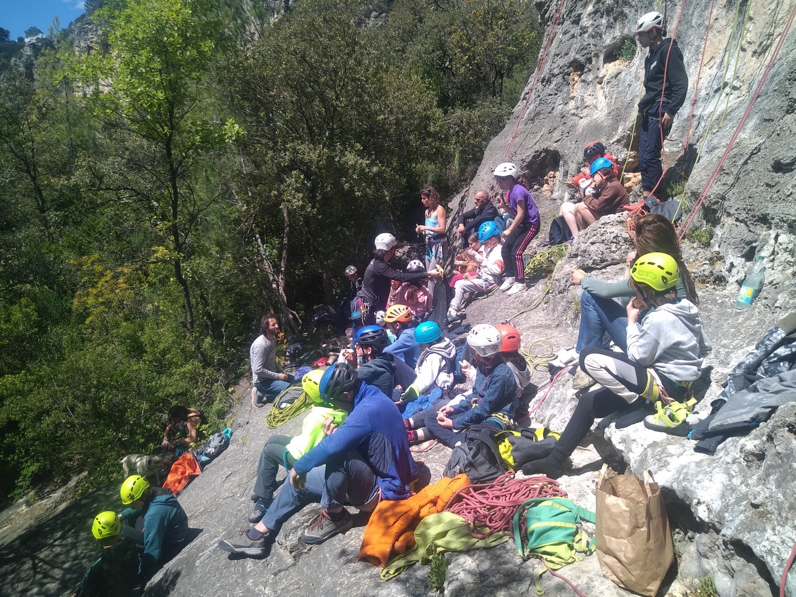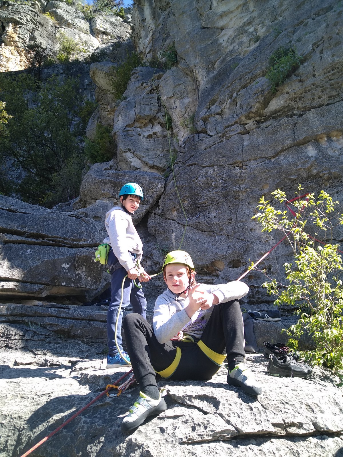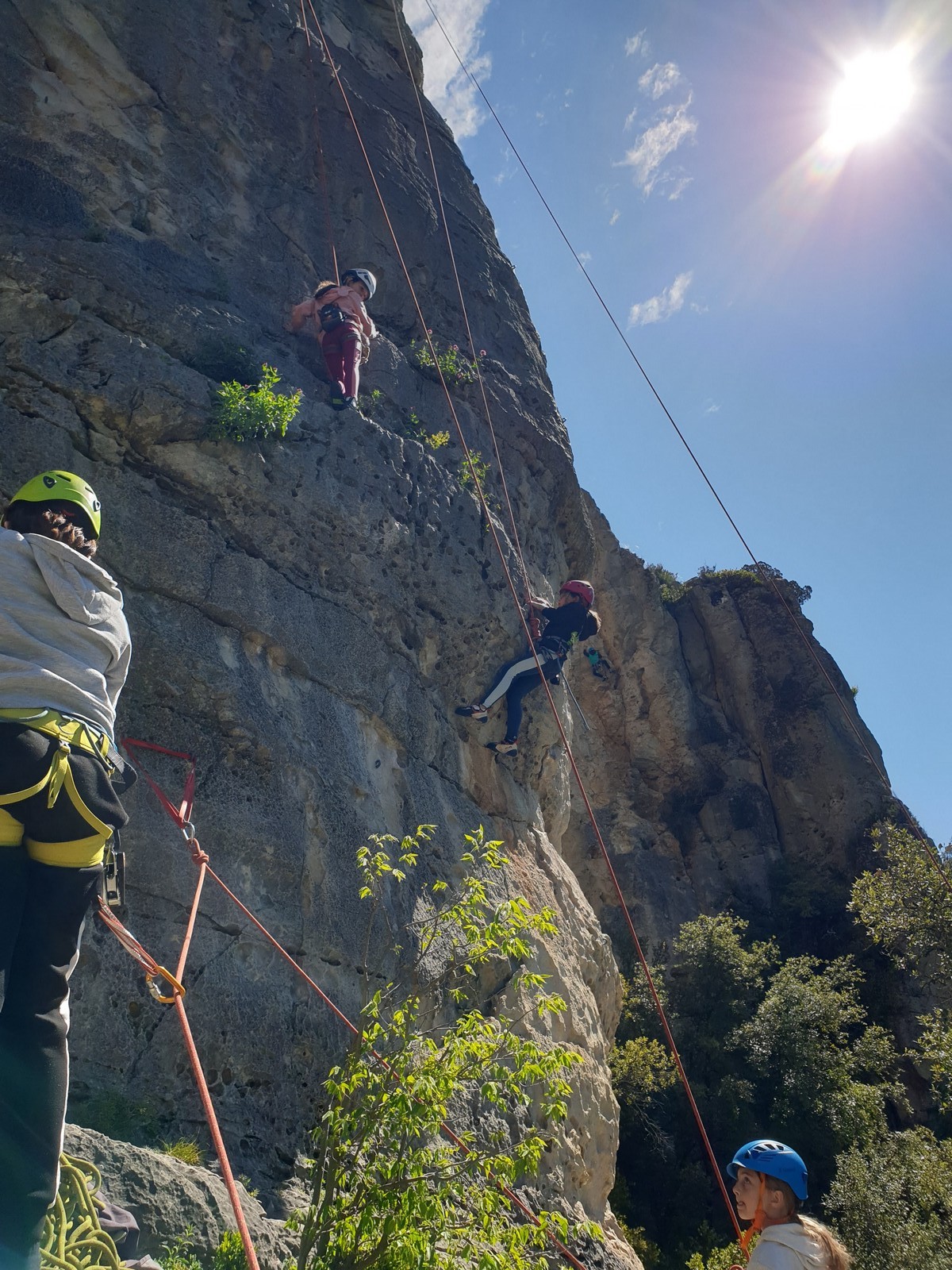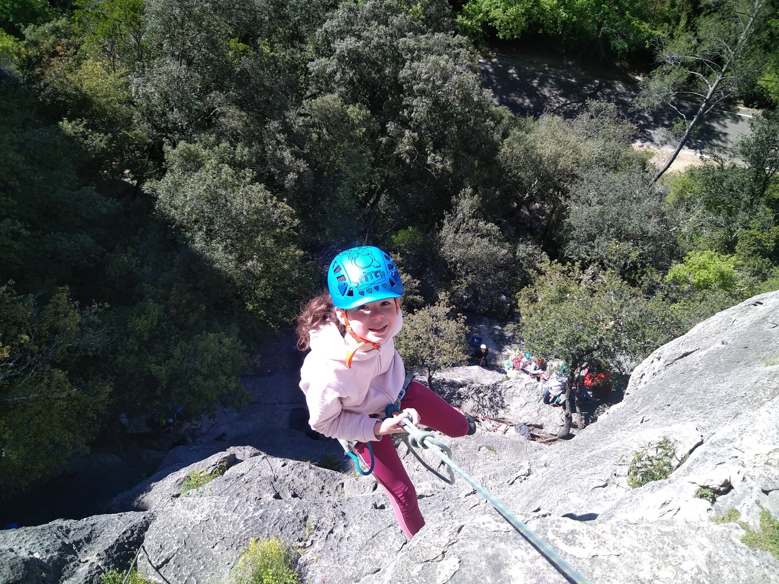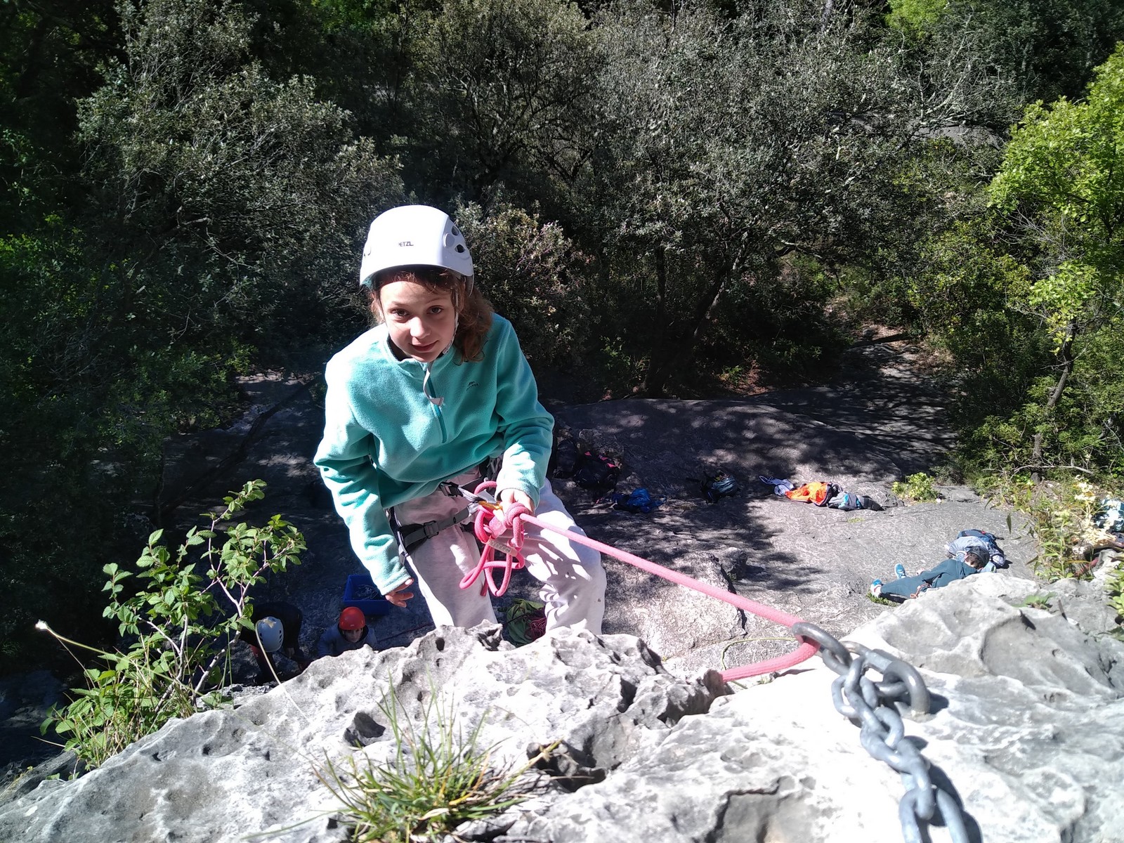 Aujourd’hui nous jetons notre dévolu sur les secteurs » Tintin », tout petit secteur idéal pour réviser l’escalade en tête dans des voies courtes et faciles et le secteur situé sur la vire juste au dessus proposant des voies d’un peu plus d’ampleur jusqu’à 7a. Le côté pratique étant qu’ici lorsque nous sommes à l’étage, sur la terrasse, nous avons quasiment les pieds au niveau des relais du secteur inférieur et c’est ainsi que les jeunes novices peuvent sereinement réviser ou même apprendre à faire la « manip » nécessaire lorsque l’on grimpe en tête. Aujourd’hui le soleil est présent mais le petit vent s’engouffrant dans le « vallon sourn » nous raffermit les chairs et nous interdit toute escalade en t-shirt. Les grimpeurs s’activent avec plus ou moins d’intensité et à 20 grimpeurs, la quasitotalité des voies sont prises. Mathis et Esteban vont grimper sur un bout de caillou juste à côté pour installer une moulinette dans un très long 6a, tandis que Léane s’essaie dans le superbe 7a du secteur « Caldoquie » à la difficulté concentrée dans les permiers mètres. Elle chute dans le passage difficile, et avec elle son humeur. Sylvain installe le superbe 6b+ juste à côté pour offrir aux plus motivés une voie de 35m abordable qui sera écumée toute la journée ! An fin de matinée, nous sommes rejoints par les parents de Rose et Lilas, Didier et Amandine, ainsi que Prune la soeur, qui dorment dans un camping car non loin du vallon. Avec eux débarquent Rebecca et Marion avec sa fille Maya, qu’on retrouvera tout au long du séjour.