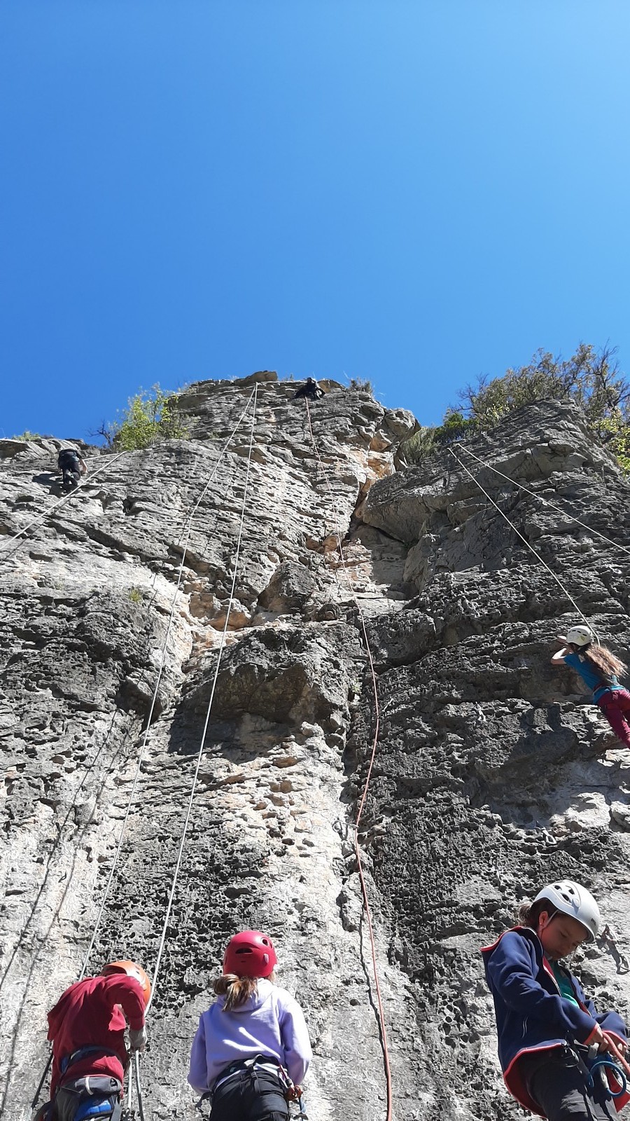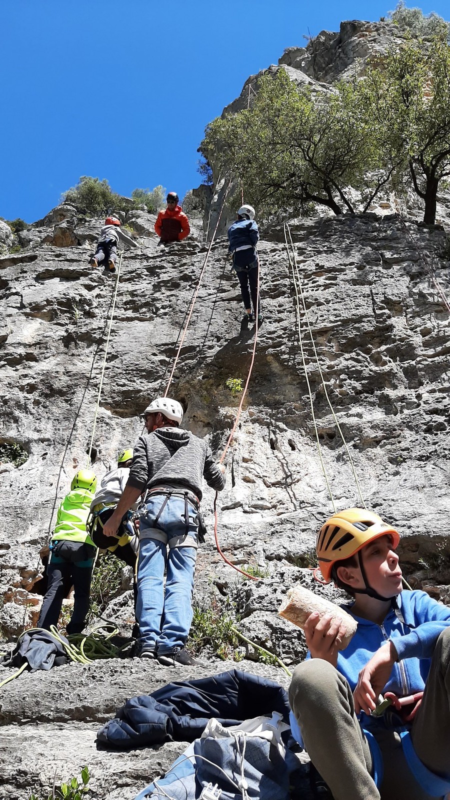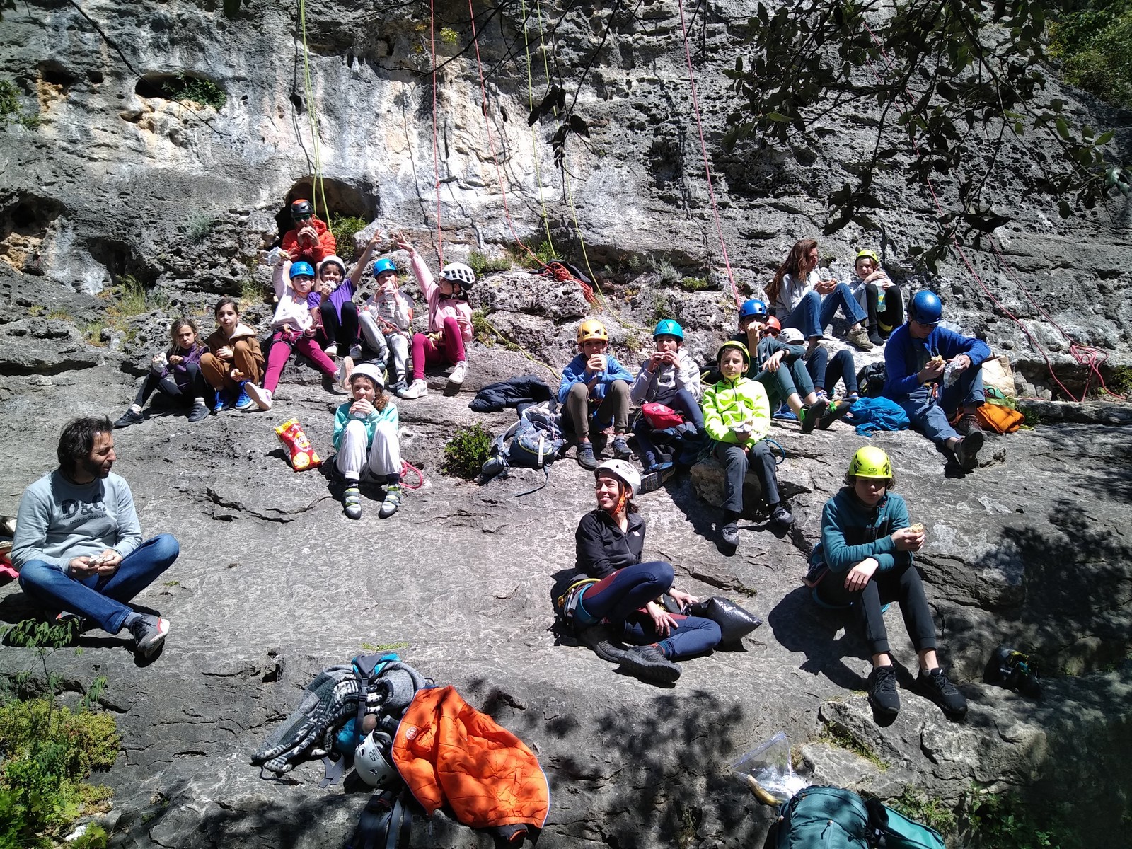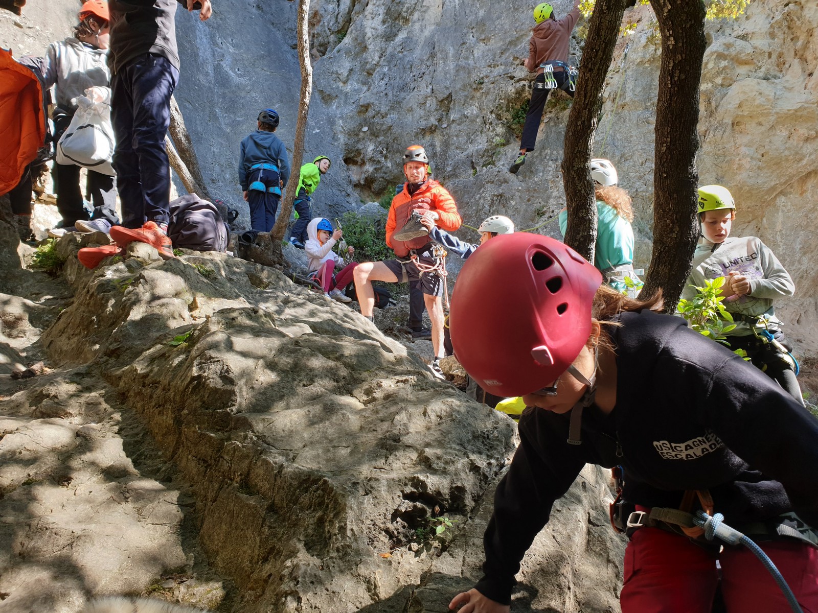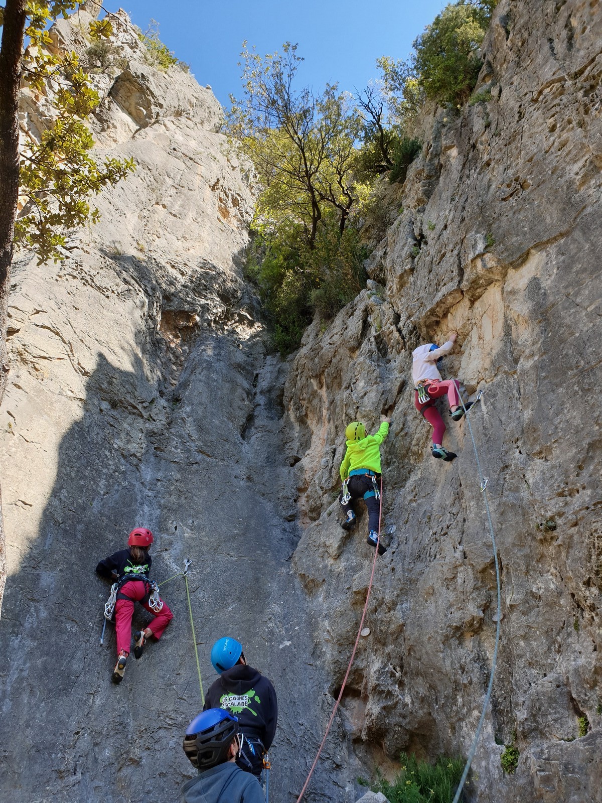 Aujourd’hui nous jetons notre dévolu sur les secteurs » Tintin », tout petit secteur idéal pour réviser l’escalade en tête dans des voies courtes et faciles et le secteur situé sur la vire juste au dessus proposant des voies d’un peu plus d’ampleur jusqu’à 7a. Le côté pratique étant qu’ici lorsque nous sommes à l’étage, sur la terrasse, nous avons quasiment les pieds au niveau des relais du secteur inférieur et c’est ainsi que les jeunes novices peuvent sereinement réviser ou même apprendre à faire la « manip » nécessaire lorsque l’on grimpe en tête. Aujourd’hui le soleil est présent mais le petit vent s’engouffrant dans le « vallon sourn » nous raffermit les chairs et nous interdit toute escalade en t-shirt. Les grimpeurs s’activent avec plus ou moins d’intensité et à 20 grimpeurs, la quasitotalité des voies sont prises. Mathis et Esteban vont grimper sur un bout de caillou juste à côté pour installer une moulinette dans un très long 6a, tandis que Léane s’essaie dans le superbe 7a du secteur « Caldoquie » à la difficulté concentrée dans les permiers mètres. Elle chute dans le passage difficile, et avec elle son humeur. Sylvain installe le superbe 6b+ juste à côté pour offrir aux plus motivés une voie de 35m abordable qui sera écumée toute la journée ! An fin de matinée, nous sommes rejoints par les parents de Rose et Lilas, Didier et Amandine, ainsi que Prune la soeur, qui dorment dans un camping car non loin du vallon. Avec eux débarquent Rebecca et Marion avec sa fille Maya, qu’on retrouvera tout au long du séjour.