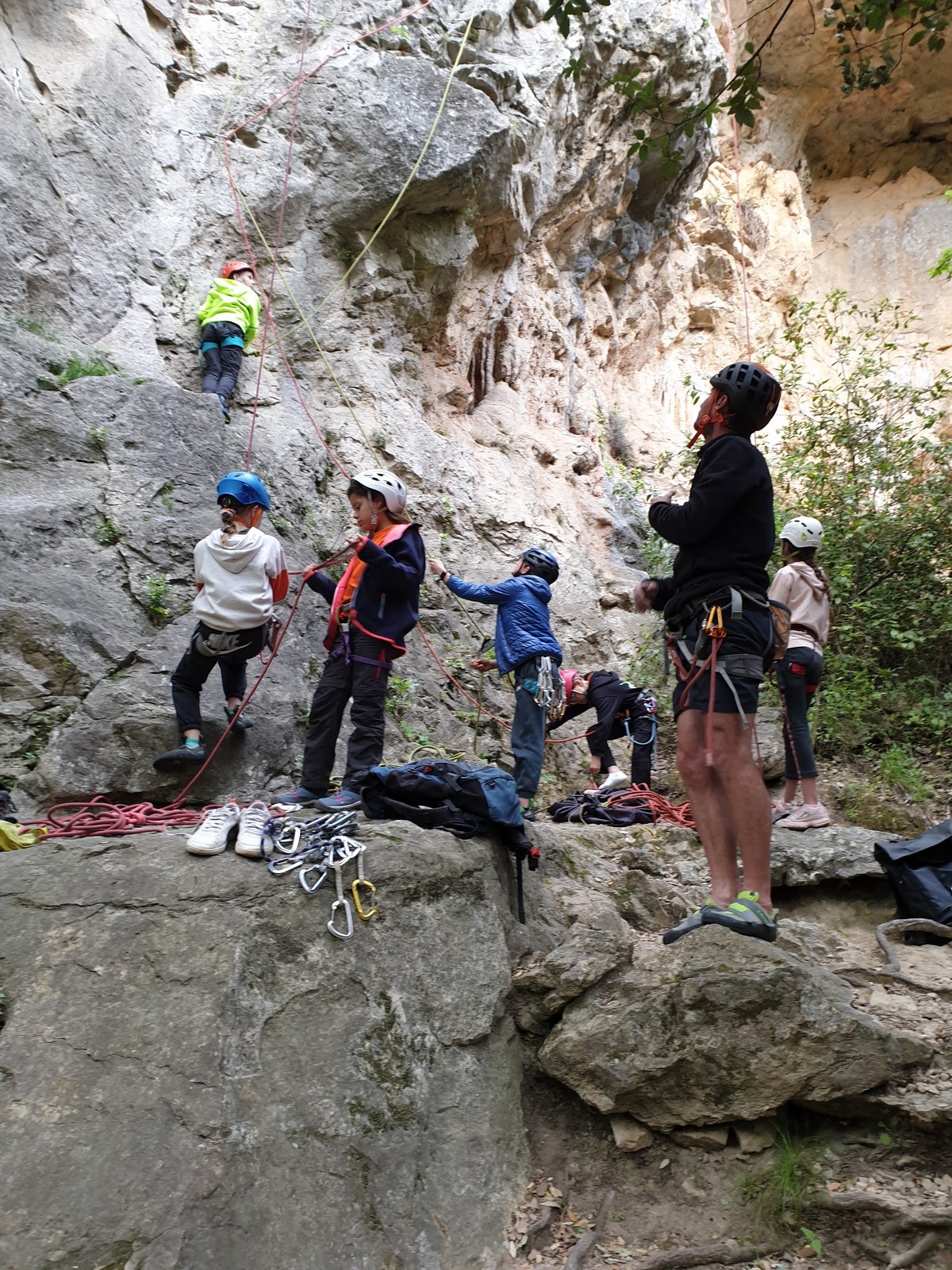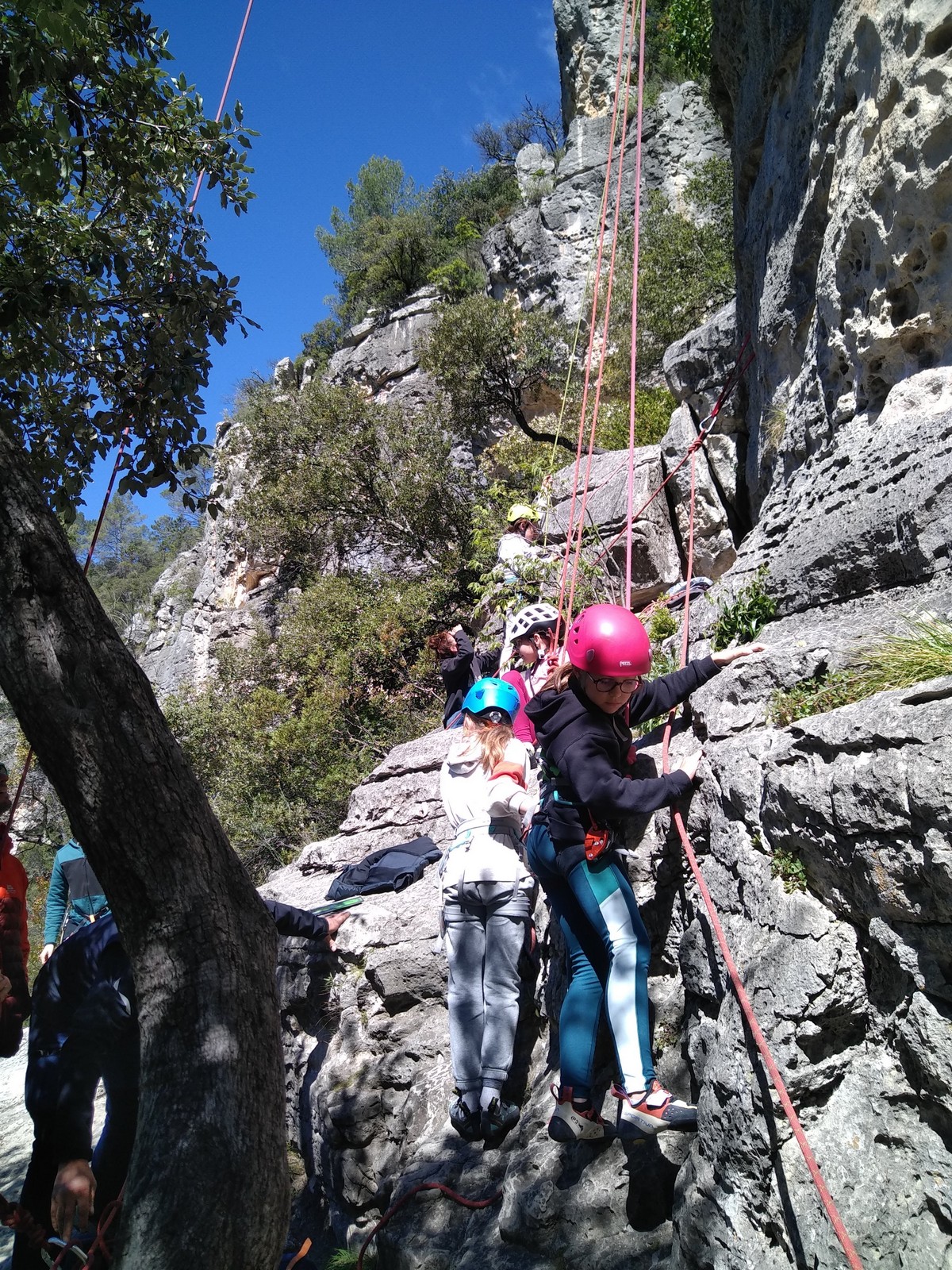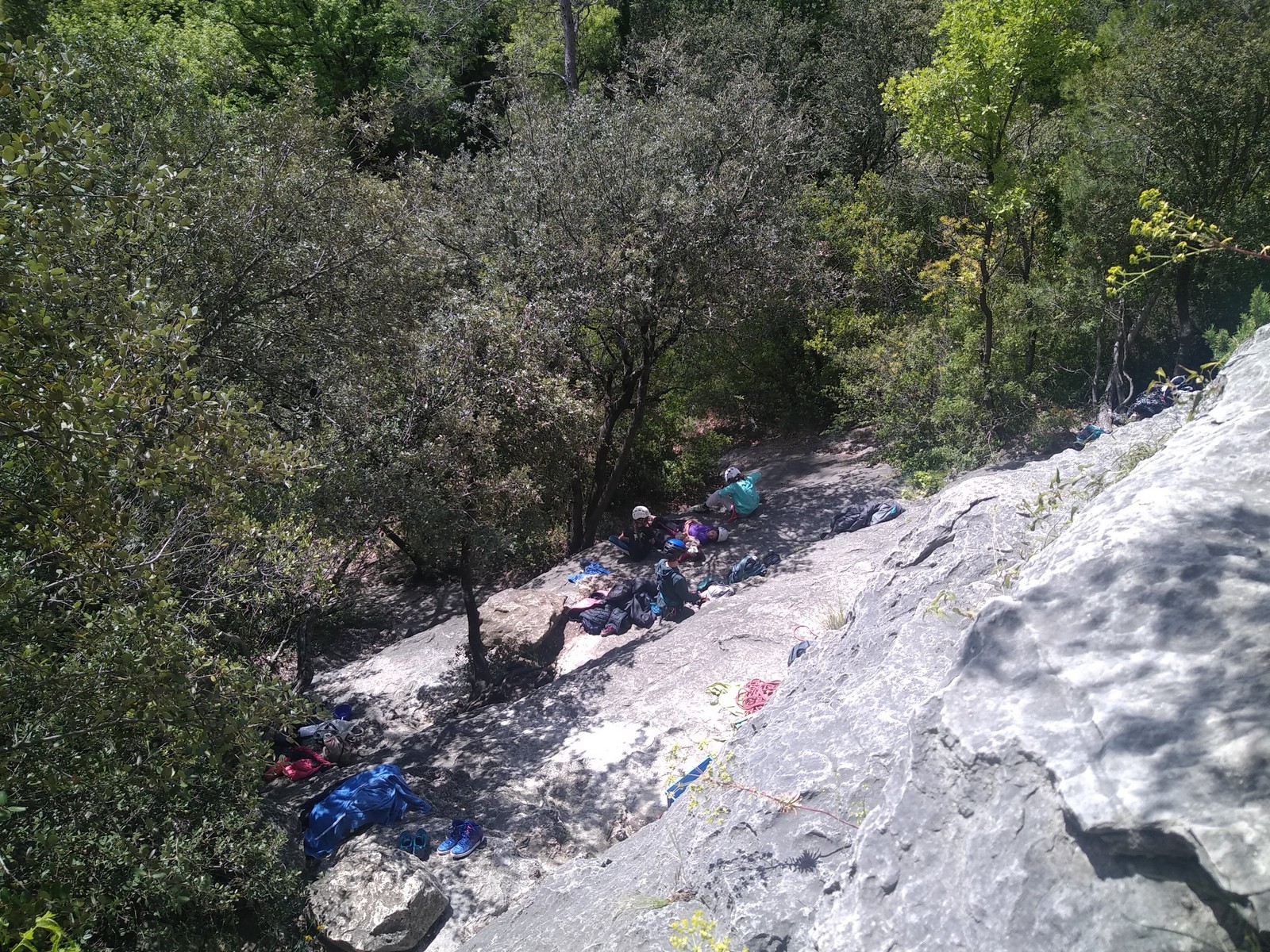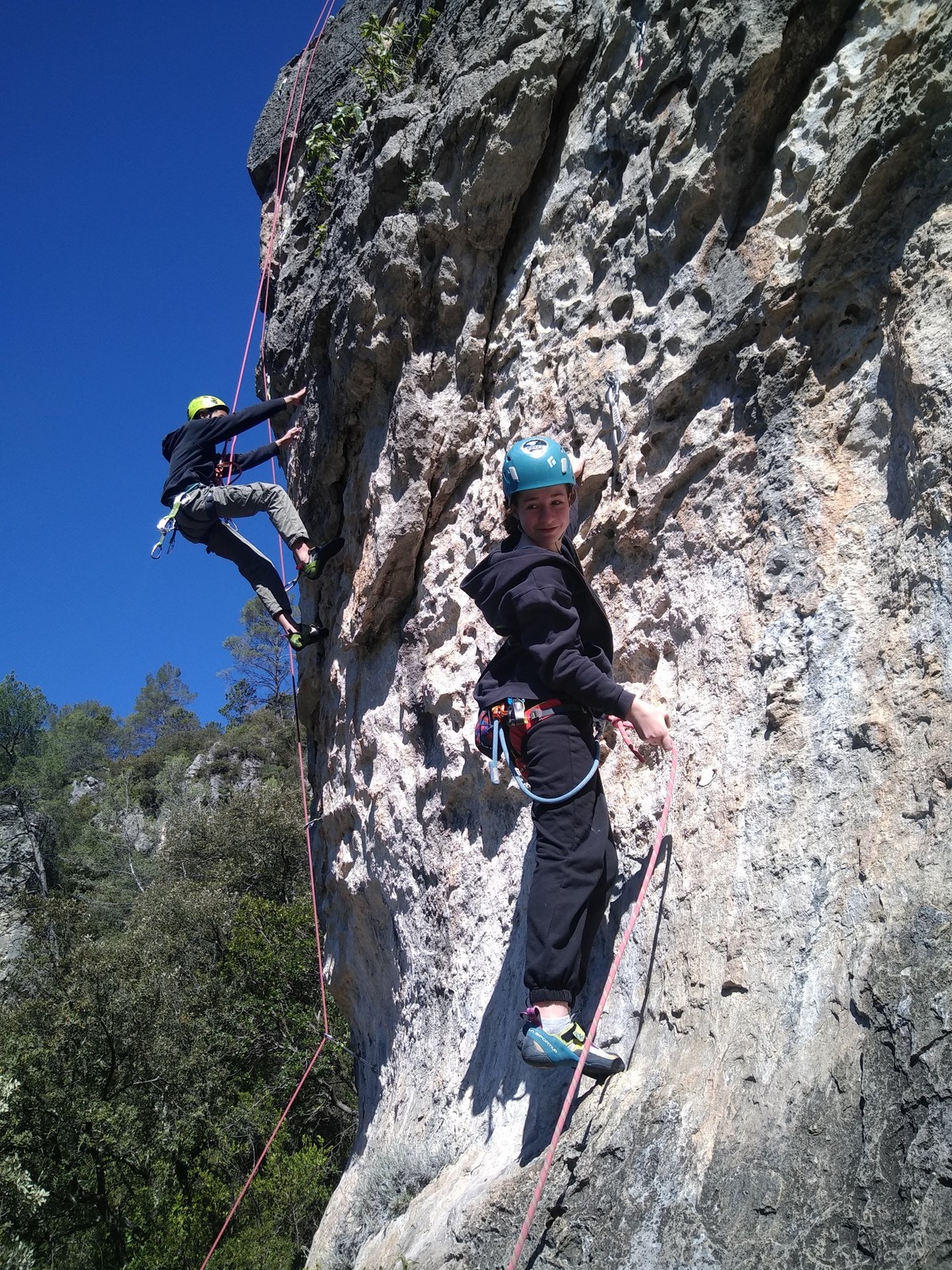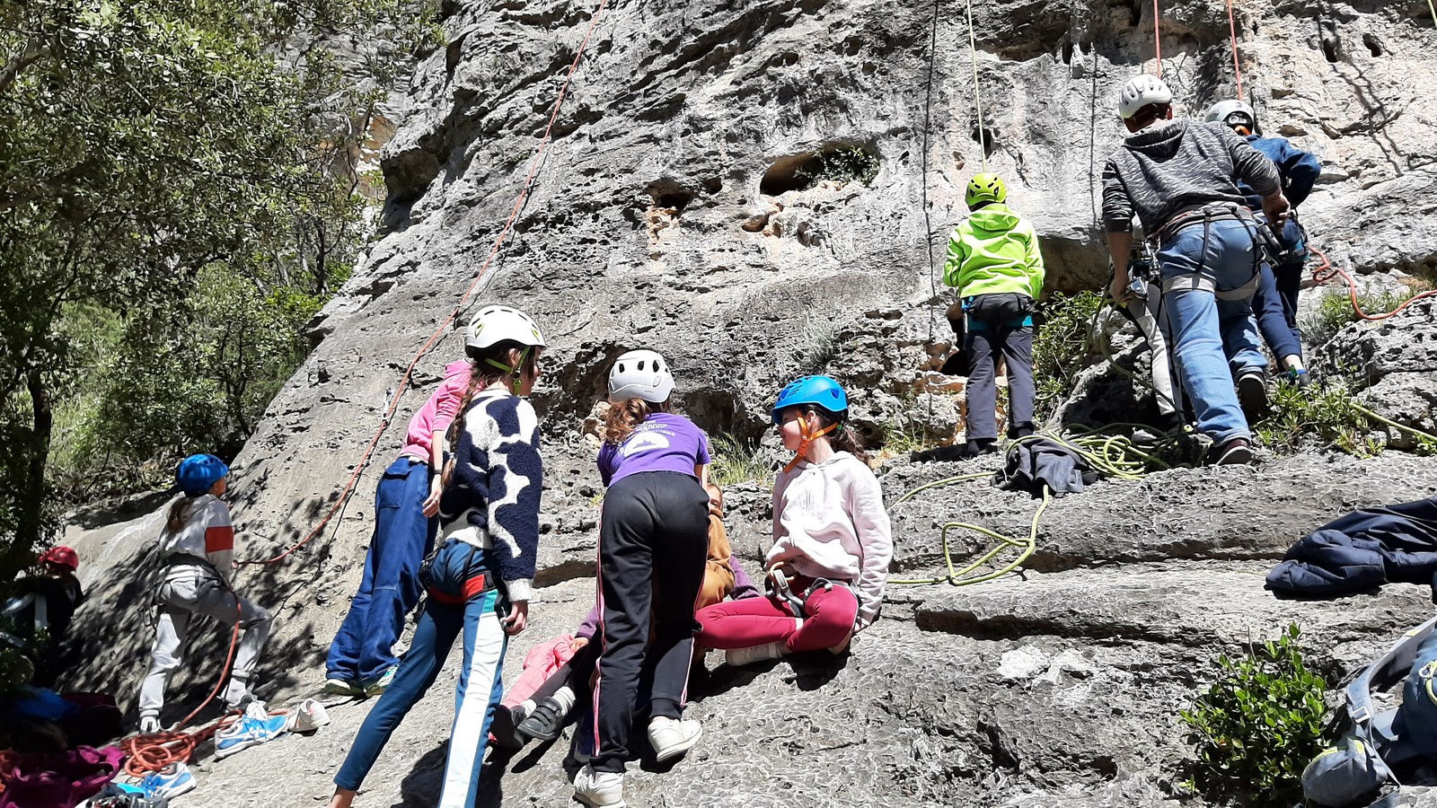 Aujourd’hui nous jetons notre dévolu sur les secteurs » Tintin », tout petit secteur idéal pour réviser l’escalade en tête dans des voies courtes et faciles et le secteur situé sur la vire juste au dessus proposant des voies d’un peu plus d’ampleur jusqu’à 7a. Le côté pratique étant qu’ici lorsque nous sommes à l’étage, sur la terrasse, nous avons quasiment les pieds au niveau des relais du secteur inférieur et c’est ainsi que les jeunes novices peuvent sereinement réviser ou même apprendre à faire la « manip » nécessaire lorsque l’on grimpe en tête. Aujourd’hui le soleil est présent mais le petit vent s’engouffrant dans le « vallon sourn » nous raffermit les chairs et nous interdit toute escalade en t-shirt. Les grimpeurs s’activent avec plus ou moins d’intensité et à 20 grimpeurs, la quasitotalité des voies sont prises. Mathis et Esteban vont grimper sur un bout de caillou juste à côté pour installer une moulinette dans un très long 6a, tandis que Léane s’essaie dans le superbe 7a du secteur « Caldoquie » à la difficulté concentrée dans les permiers mètres. Elle chute dans le passage difficile, et avec elle son humeur. Sylvain installe le superbe 6b+ juste à côté pour offrir aux plus motivés une voie de 35m abordable qui sera écumée toute la journée ! An fin de matinée, nous sommes rejoints par les parents de Rose et Lilas, Didier et Amandine, ainsi que Prune la soeur, qui dorment dans un camping car non loin du vallon. Avec eux débarquent Rebecca et Marion avec sa fille Maya, qu’on retrouvera tout au long du séjour.