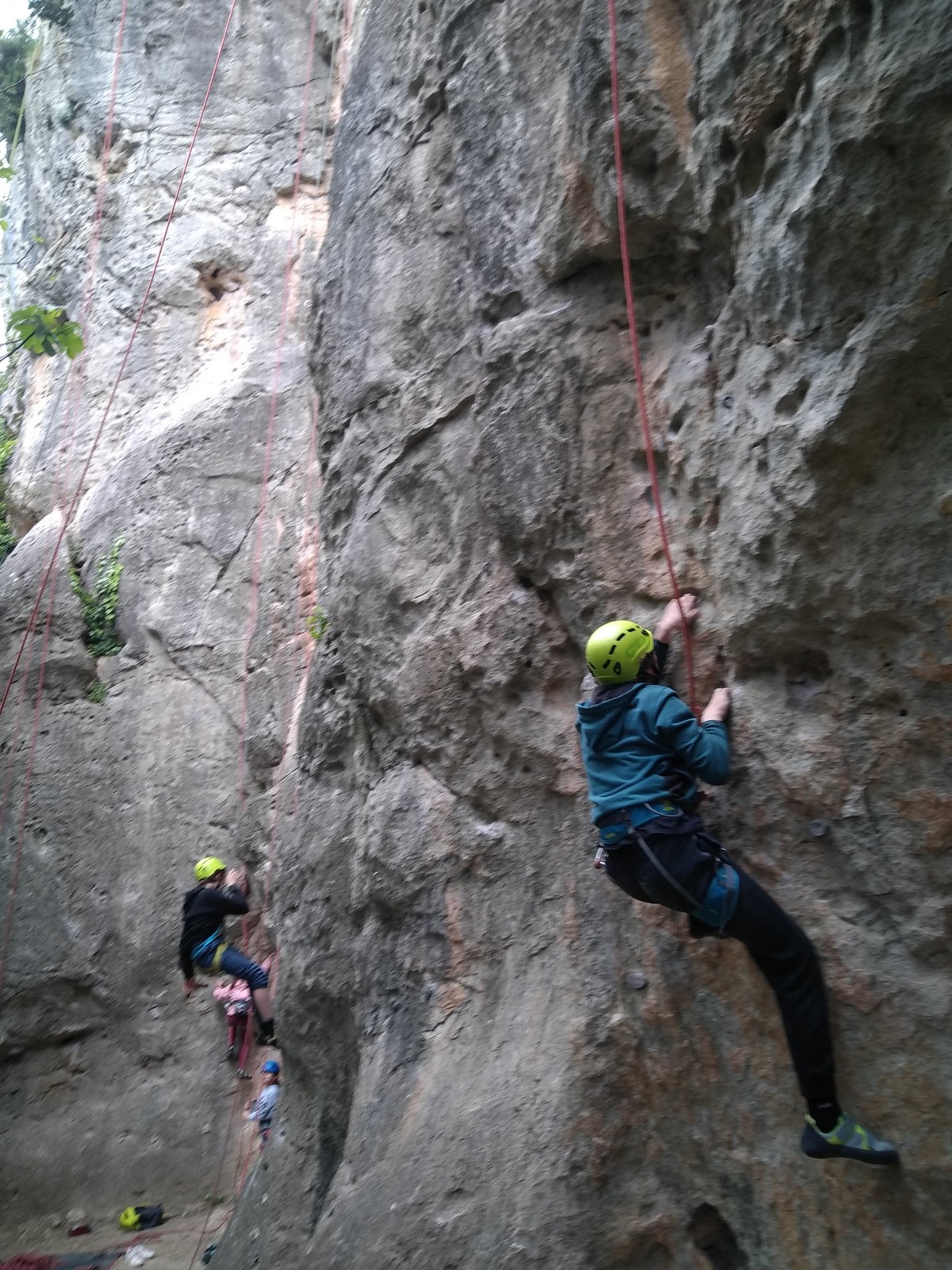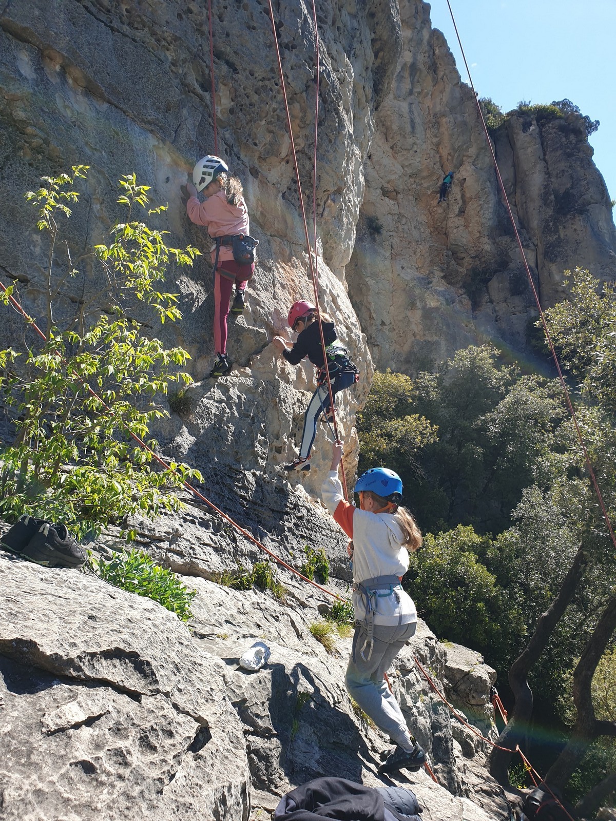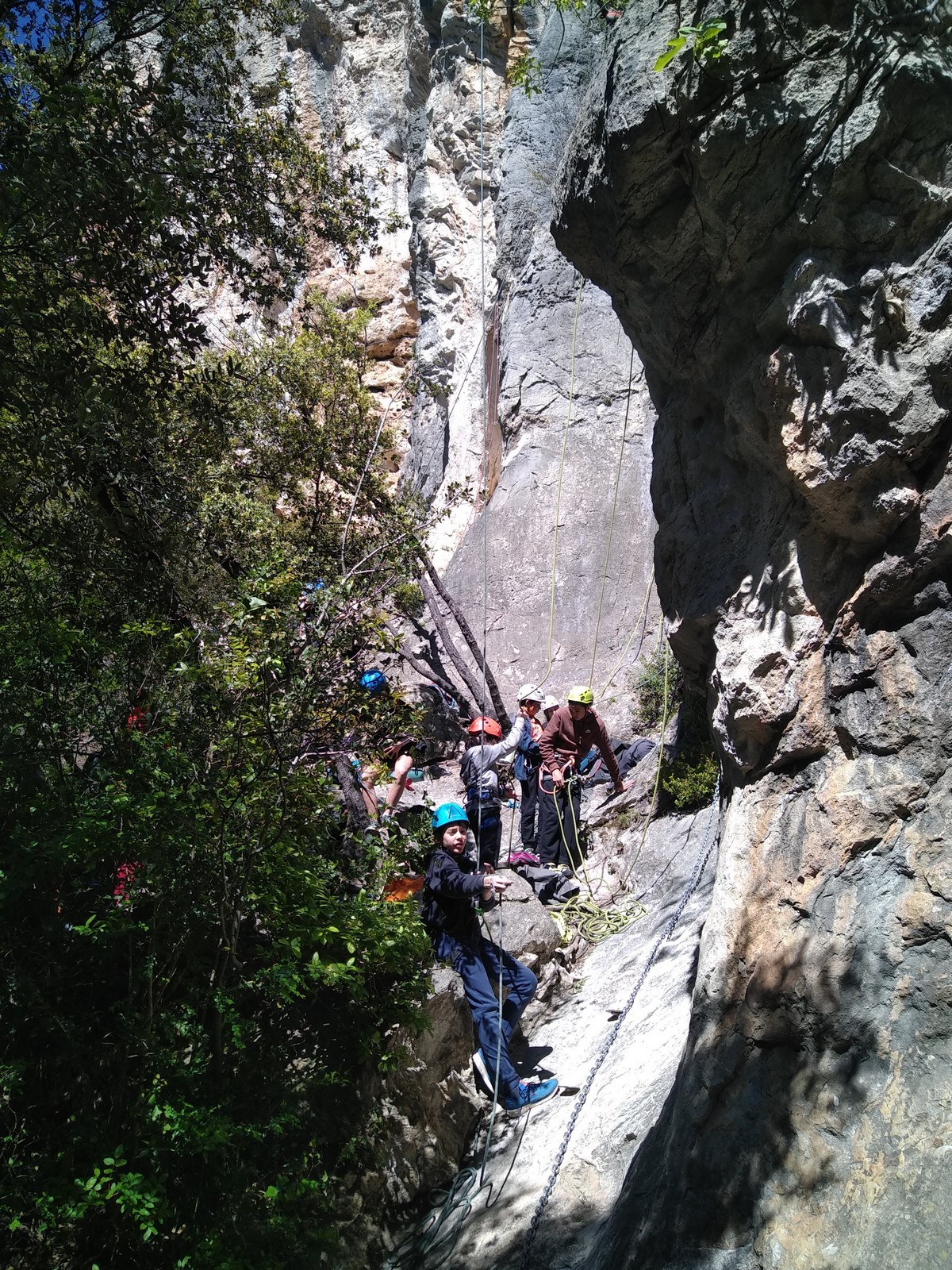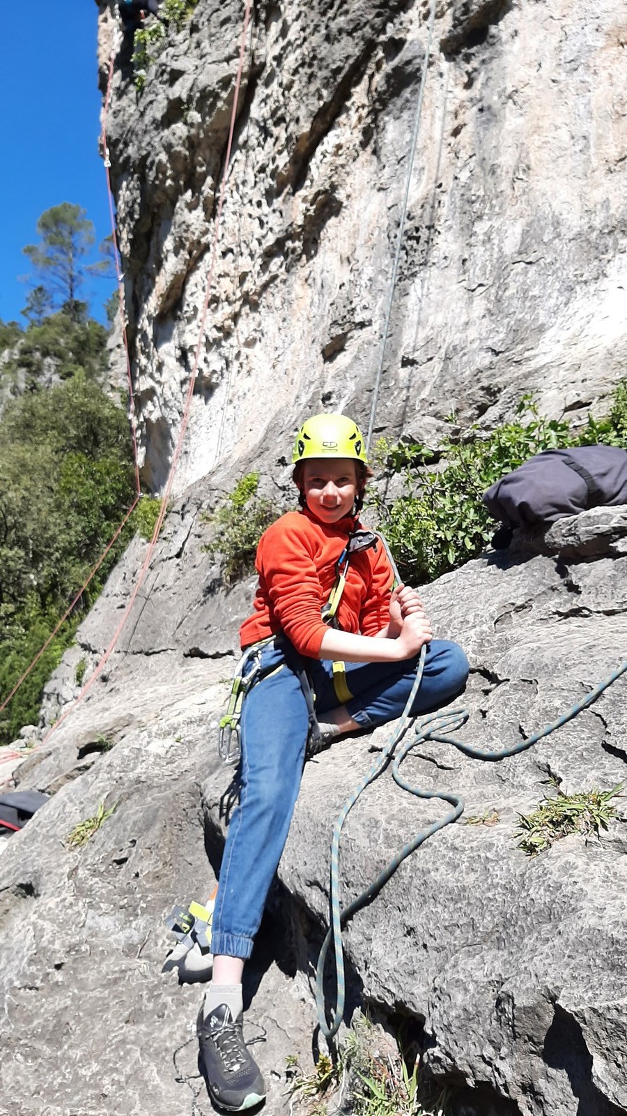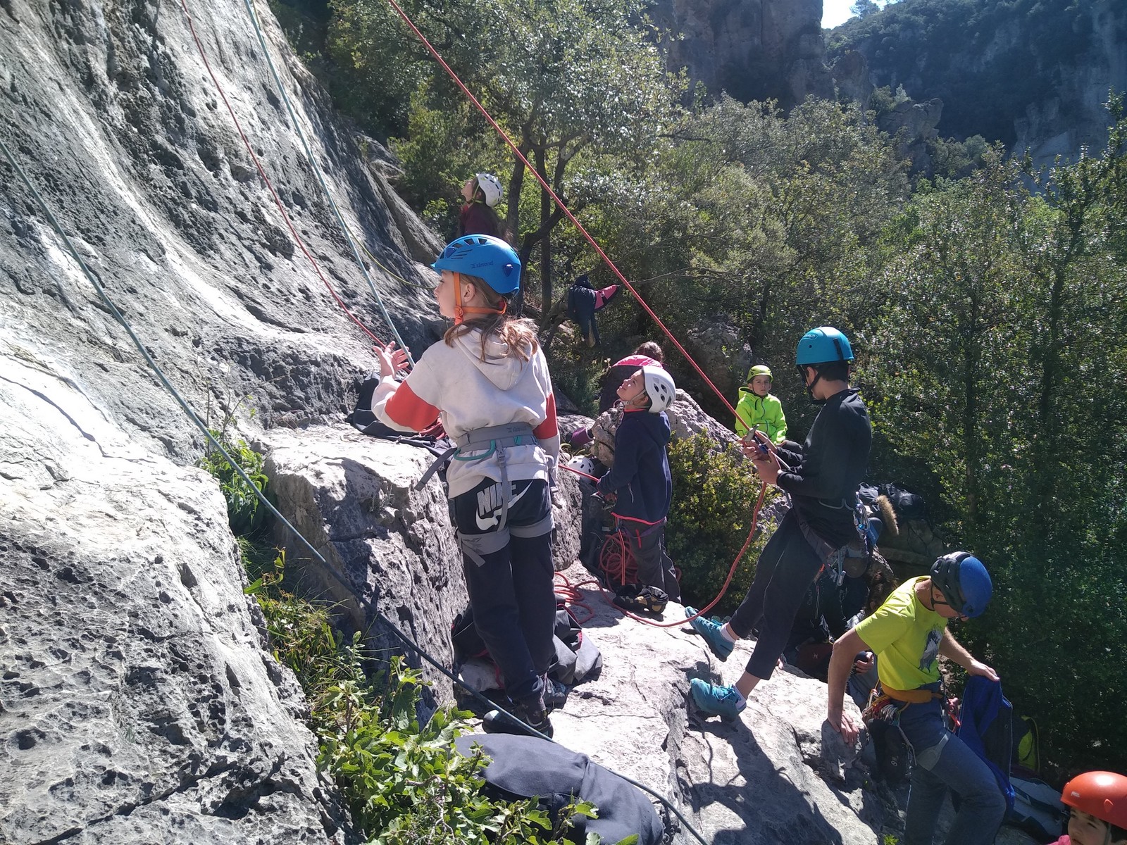 Aujourd’hui nous jetons notre dévolu sur les secteurs » Tintin », tout petit secteur idéal pour réviser l’escalade en tête dans des voies courtes et faciles et le secteur situé sur la vire juste au dessus proposant des voies d’un peu plus d’ampleur jusqu’à 7a. Le côté pratique étant qu’ici lorsque nous sommes à l’étage, sur la terrasse, nous avons quasiment les pieds au niveau des relais du secteur inférieur et c’est ainsi que les jeunes novices peuvent sereinement réviser ou même apprendre à faire la « manip » nécessaire lorsque l’on grimpe en tête. Aujourd’hui le soleil est présent mais le petit vent s’engouffrant dans le « vallon sourn » nous raffermit les chairs et nous interdit toute escalade en t-shirt. Les grimpeurs s’activent avec plus ou moins d’intensité et à 20 grimpeurs, la quasitotalité des voies sont prises. Mathis et Esteban vont grimper sur un bout de caillou juste à côté pour installer une moulinette dans un très long 6a, tandis que Léane s’essaie dans le superbe 7a du secteur « Caldoquie » à la difficulté concentrée dans les permiers mètres. Elle chute dans le passage difficile, et avec elle son humeur. Sylvain installe le superbe 6b+ juste à côté pour offrir aux plus motivés une voie de 35m abordable qui sera écumée toute la journée ! An fin de matinée, nous sommes rejoints par les parents de Rose et Lilas, Didier et Amandine, ainsi que Prune la soeur, qui dorment dans un camping car non loin du vallon. Avec eux débarquent Rebecca et Marion avec sa fille Maya, qu’on retrouvera tout au long du séjour.