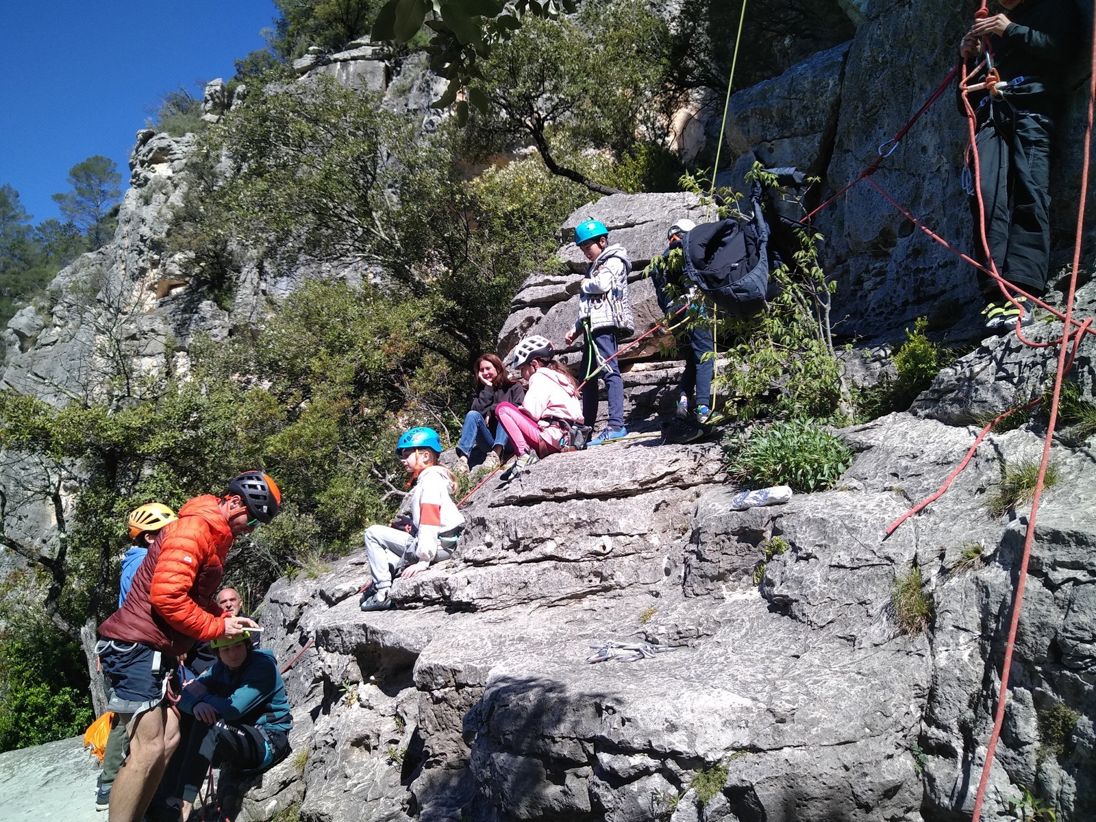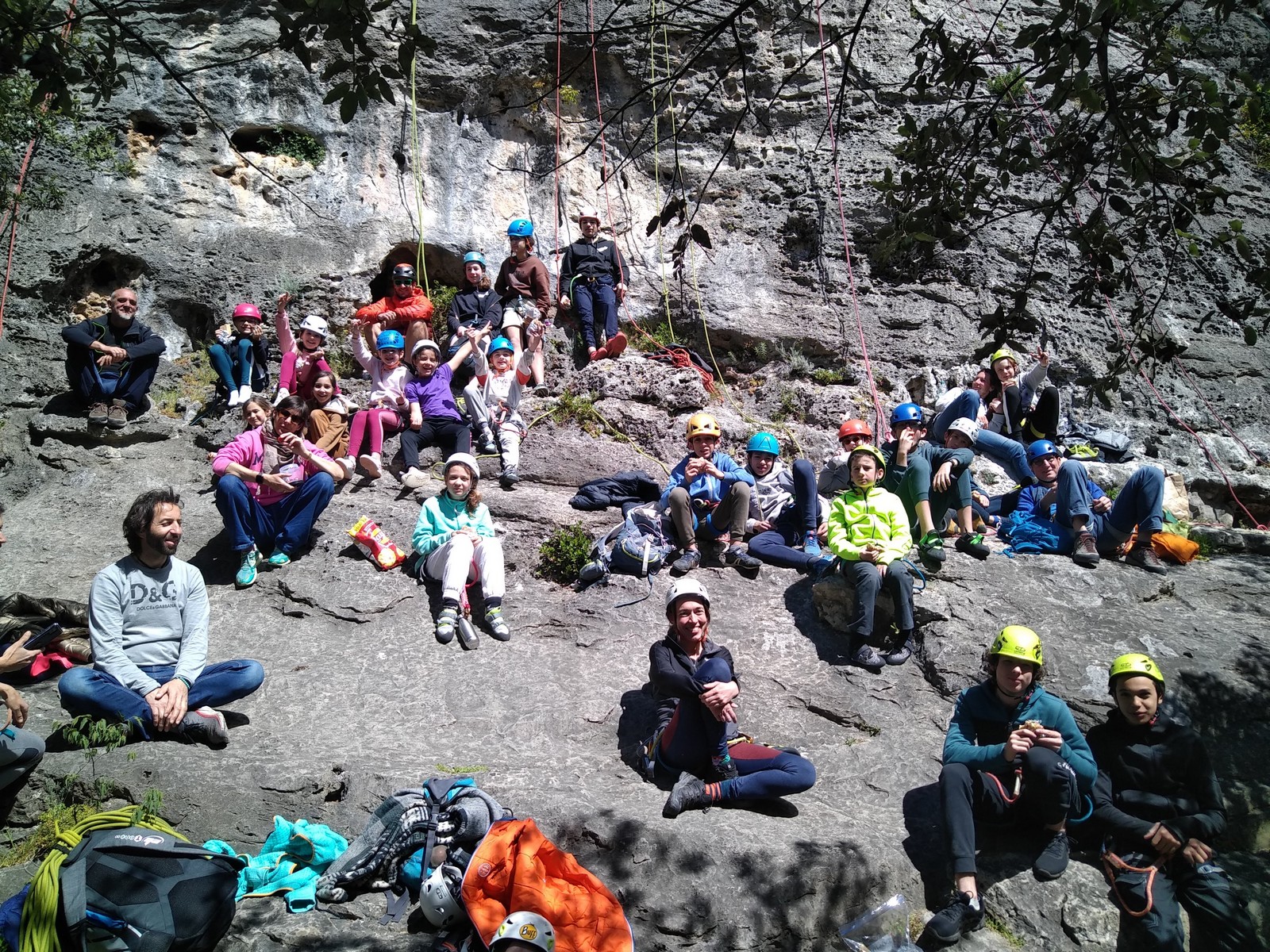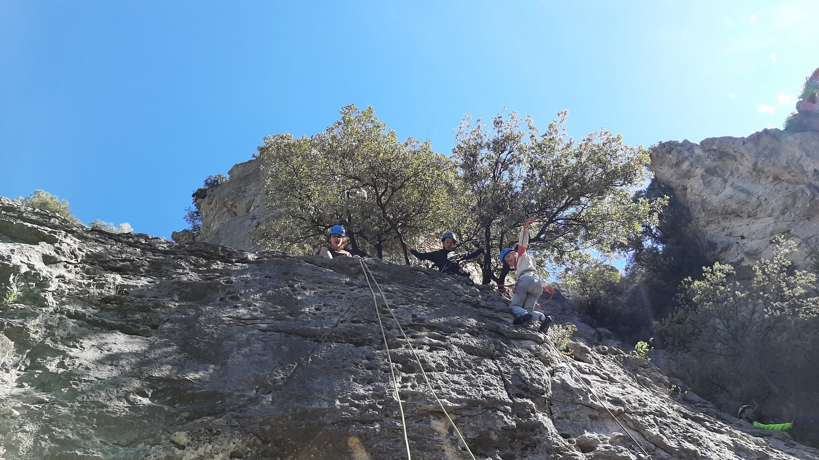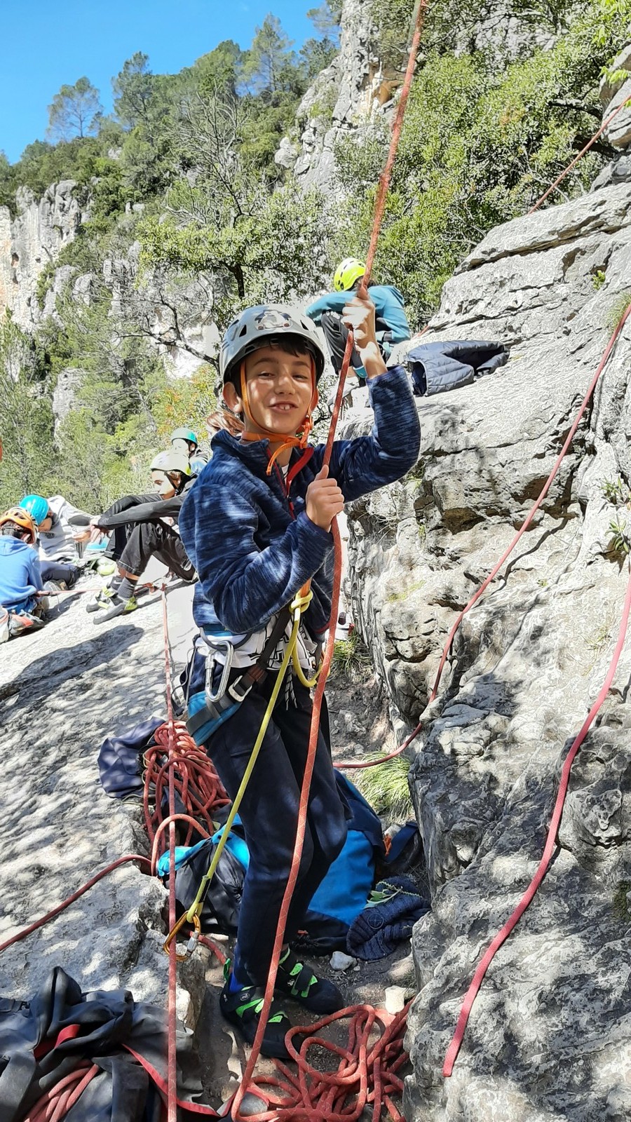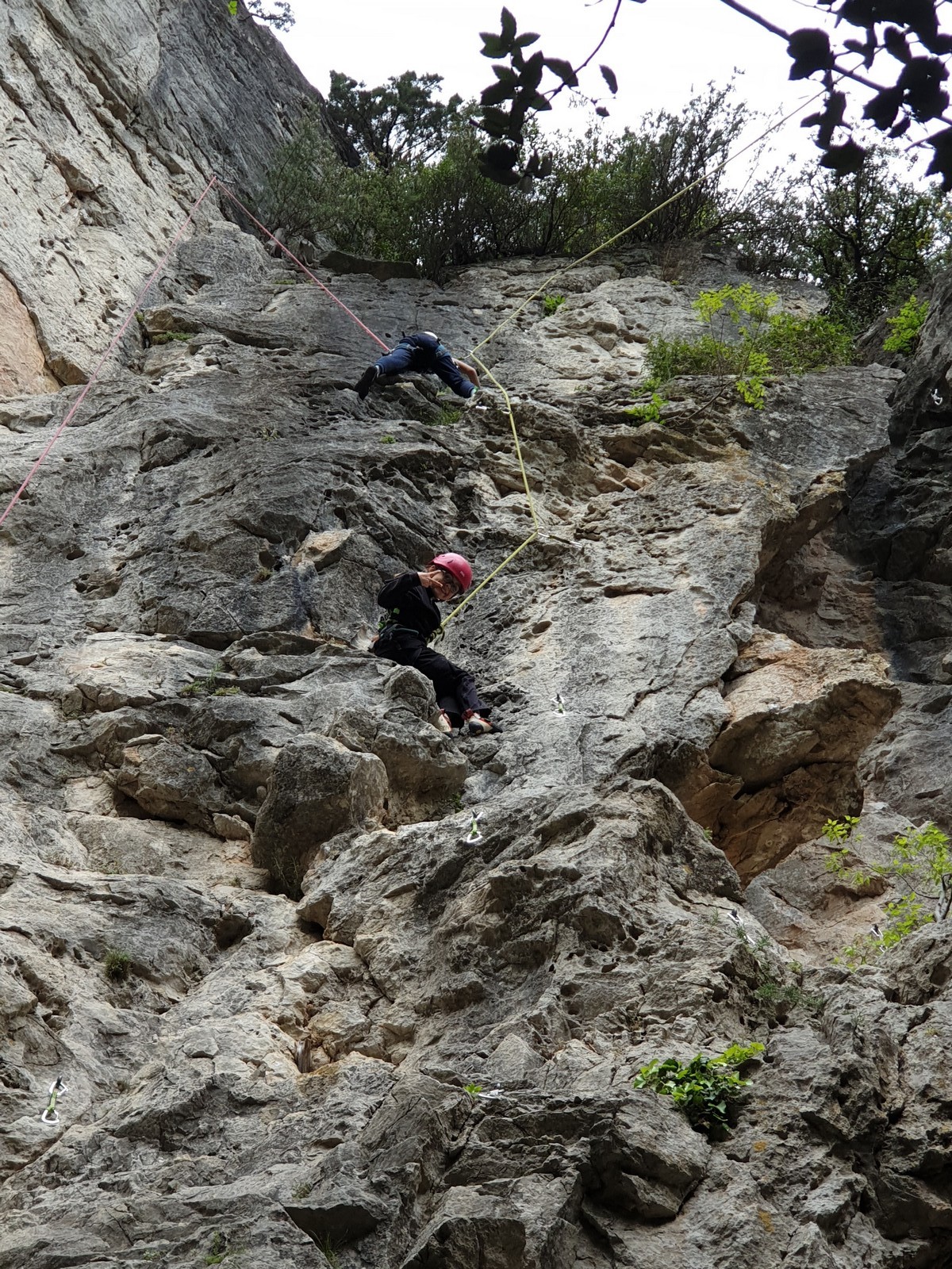 Aujourd’hui nous jetons notre dévolu sur les secteurs » Tintin », tout petit secteur idéal pour réviser l’escalade en tête dans des voies courtes et faciles et le secteur situé sur la vire juste au dessus proposant des voies d’un peu plus d’ampleur jusqu’à 7a. Le côté pratique étant qu’ici lorsque nous sommes à l’étage, sur la terrasse, nous avons quasiment les pieds au niveau des relais du secteur inférieur et c’est ainsi que les jeunes novices peuvent sereinement réviser ou même apprendre à faire la « manip » nécessaire lorsque l’on grimpe en tête. Aujourd’hui le soleil est présent mais le petit vent s’engouffrant dans le « vallon sourn » nous raffermit les chairs et nous interdit toute escalade en t-shirt. Les grimpeurs s’activent avec plus ou moins d’intensité et à 20 grimpeurs, la quasitotalité des voies sont prises. Mathis et Esteban vont grimper sur un bout de caillou juste à côté pour installer une moulinette dans un très long 6a, tandis que Léane s’essaie dans le superbe 7a du secteur « Caldoquie » à la difficulté concentrée dans les permiers mètres. Elle chute dans le passage difficile, et avec elle son humeur. Sylvain installe le superbe 6b+ juste à côté pour offrir aux plus motivés une voie de 35m abordable qui sera écumée toute la journée ! An fin de matinée, nous sommes rejoints par les parents de Rose et Lilas, Didier et Amandine, ainsi que Prune la soeur, qui dorment dans un camping car non loin du vallon. Avec eux débarquent Rebecca et Marion avec sa fille Maya, qu’on retrouvera tout au long du séjour.