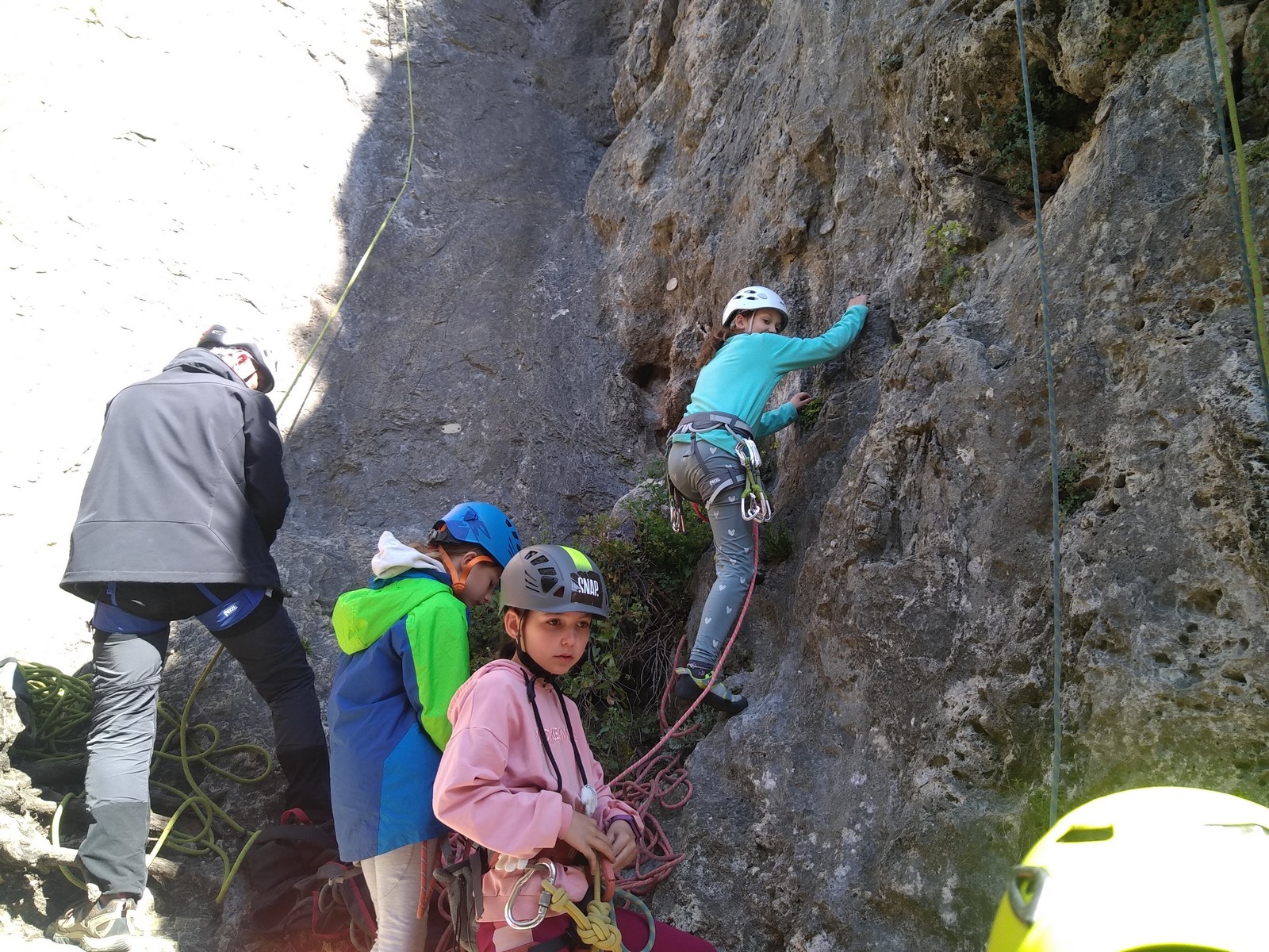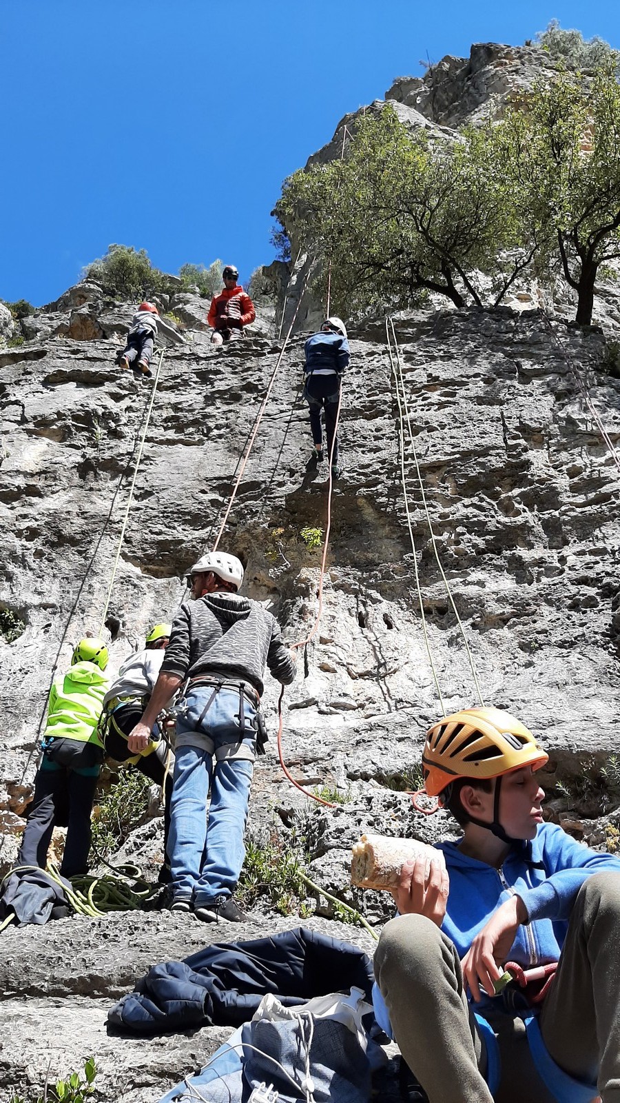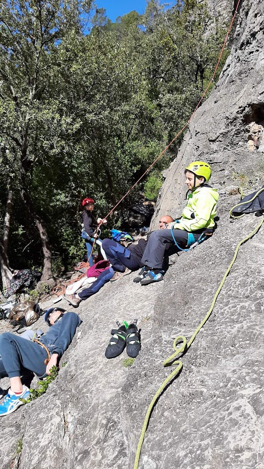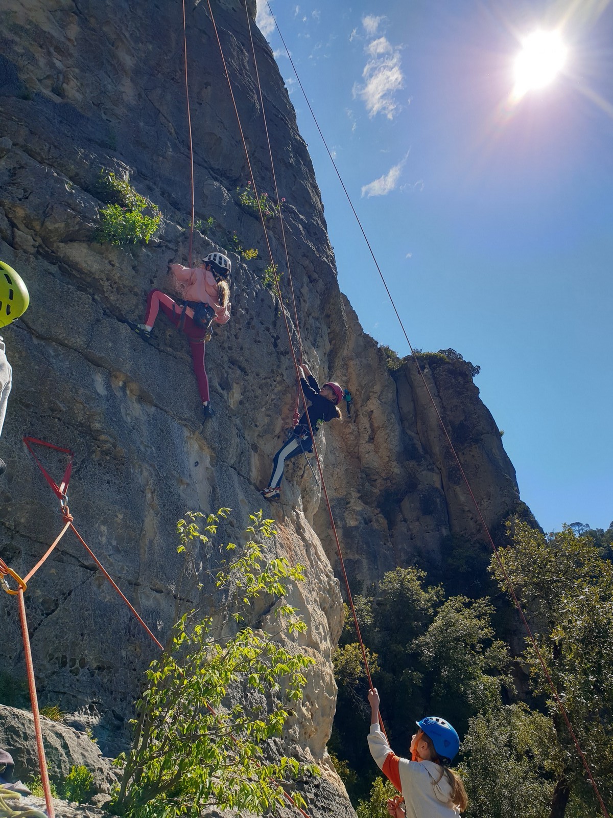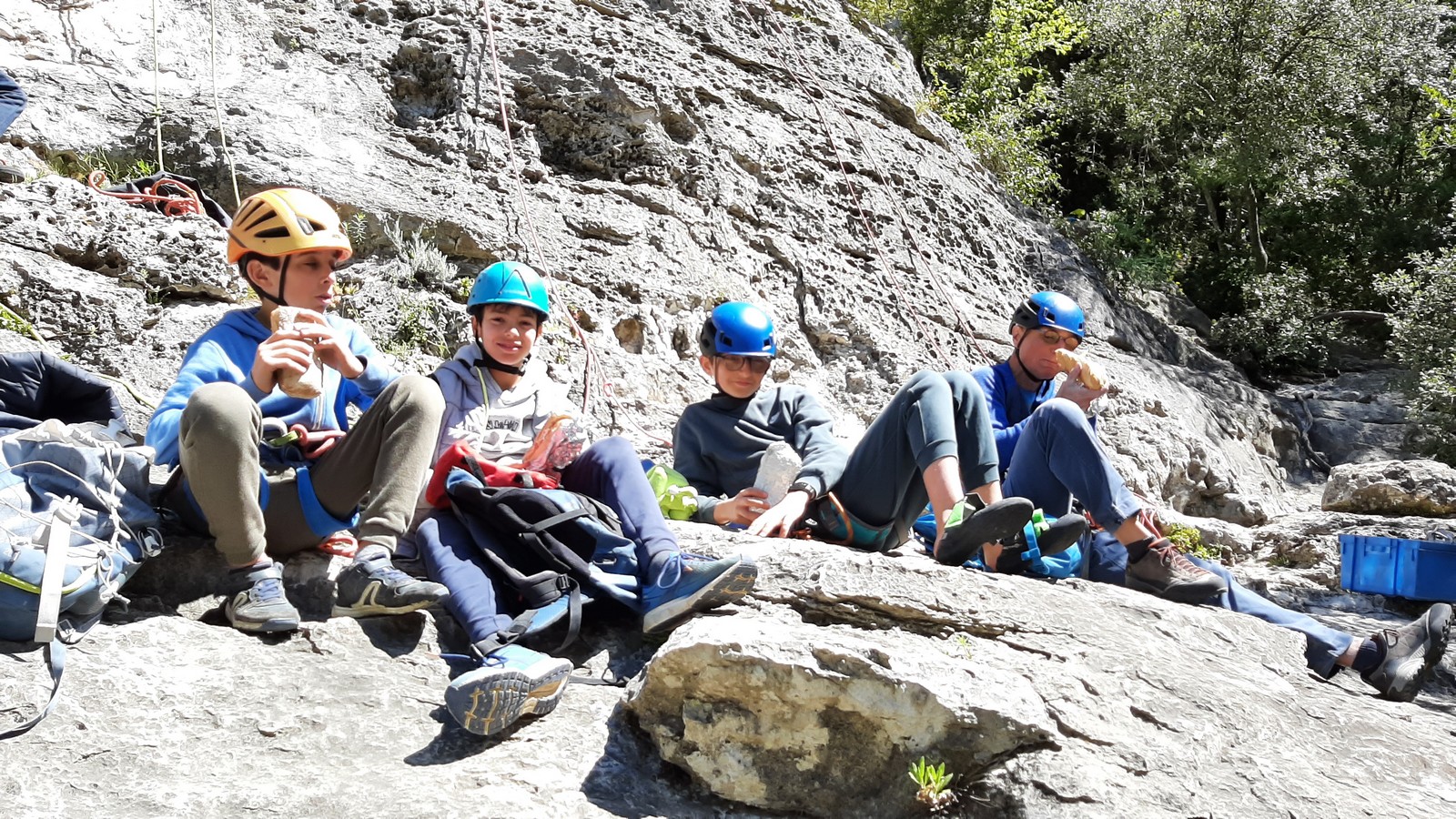 Aujourd’hui nous jetons notre dévolu sur les secteurs » Tintin », tout petit secteur idéal pour réviser l’escalade en tête dans des voies courtes et faciles et le secteur situé sur la vire juste au dessus proposant des voies d’un peu plus d’ampleur jusqu’à 7a. Le côté pratique étant qu’ici lorsque nous sommes à l’étage, sur la terrasse, nous avons quasiment les pieds au niveau des relais du secteur inférieur et c’est ainsi que les jeunes novices peuvent sereinement réviser ou même apprendre à faire la « manip » nécessaire lorsque l’on grimpe en tête. Aujourd’hui le soleil est présent mais le petit vent s’engouffrant dans le « vallon sourn » nous raffermit les chairs et nous interdit toute escalade en t-shirt. Les grimpeurs s’activent avec plus ou moins d’intensité et à 20 grimpeurs, la quasitotalité des voies sont prises. Mathis et Esteban vont grimper sur un bout de caillou juste à côté pour installer une moulinette dans un très long 6a, tandis que Léane s’essaie dans le superbe 7a du secteur « Caldoquie » à la difficulté concentrée dans les permiers mètres. Elle chute dans le passage difficile, et avec elle son humeur. Sylvain installe le superbe 6b+ juste à côté pour offrir aux plus motivés une voie de 35m abordable qui sera écumée toute la journée ! An fin de matinée, nous sommes rejoints par les parents de Rose et Lilas, Didier et Amandine, ainsi que Prune la soeur, qui dorment dans un camping car non loin du vallon. Avec eux débarquent Rebecca et Marion avec sa fille Maya, qu’on retrouvera tout au long du séjour.