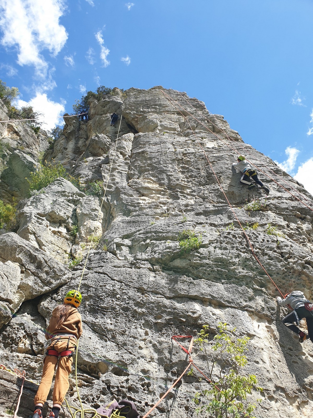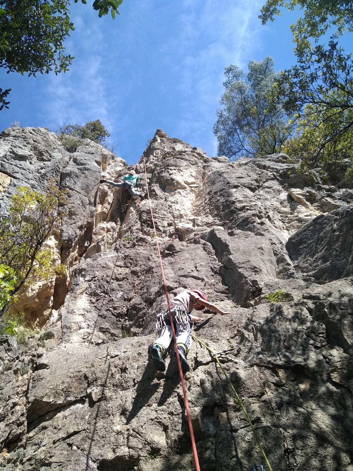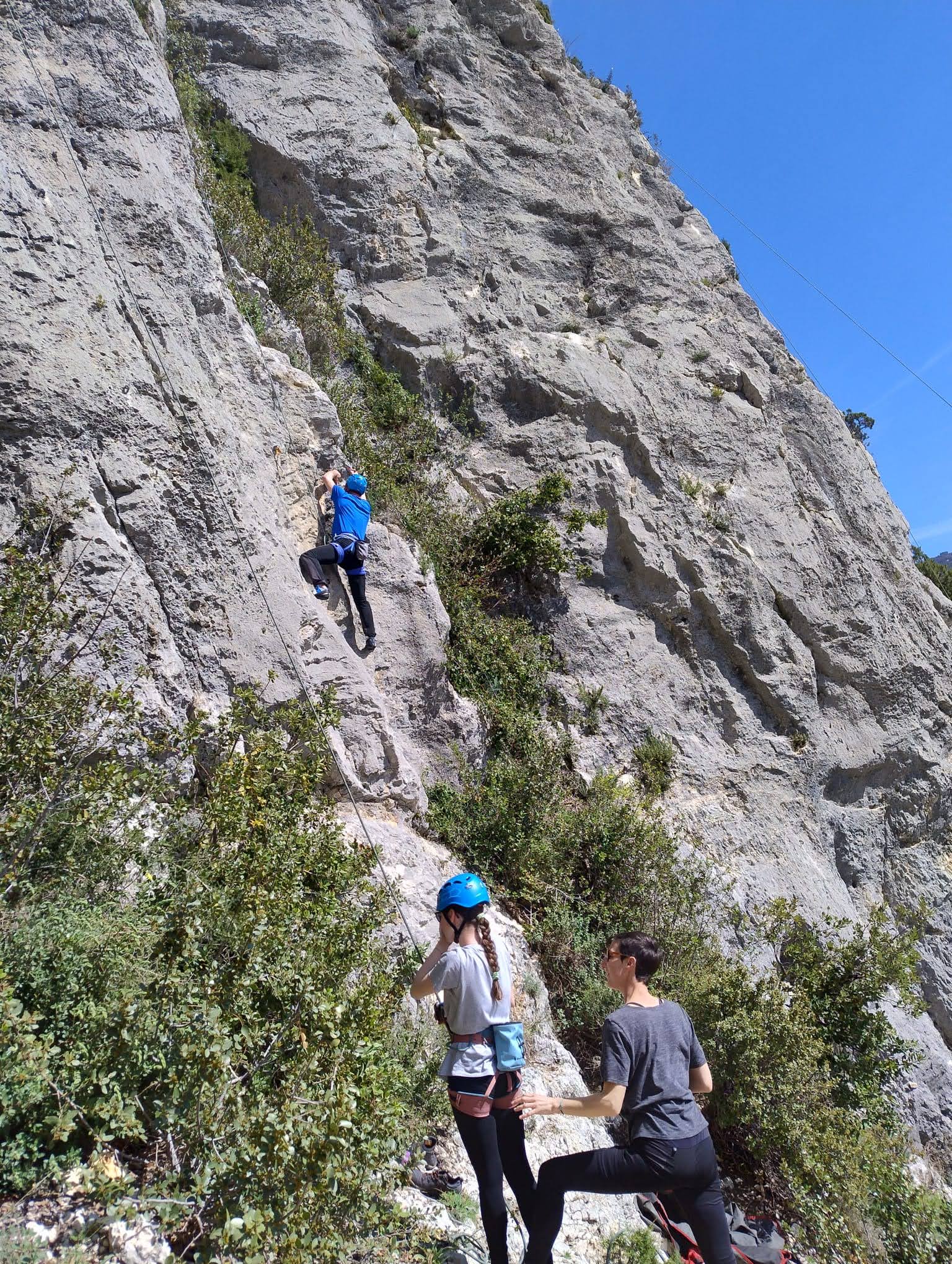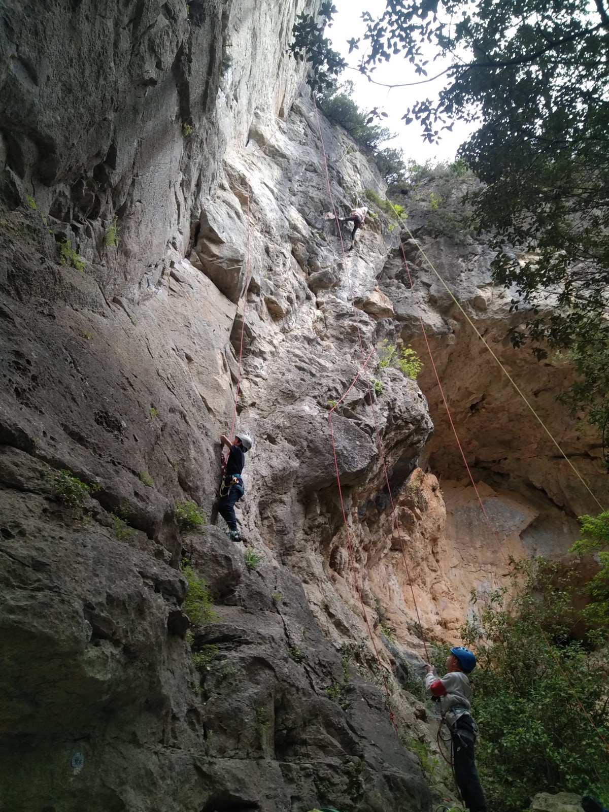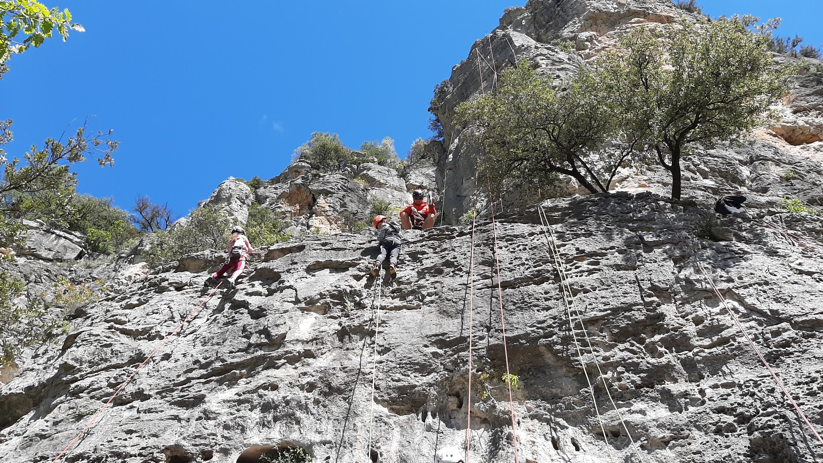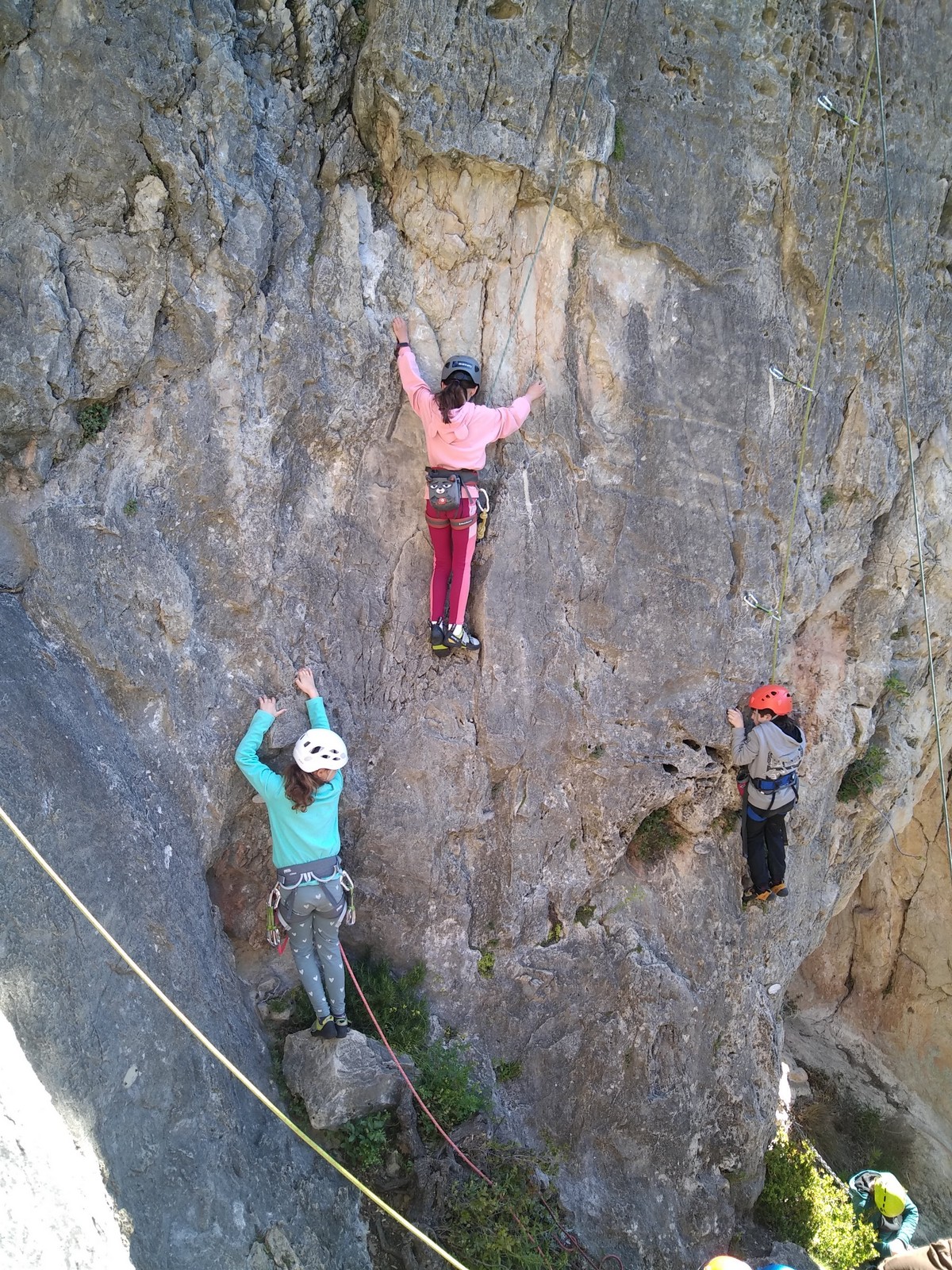 Aujourd’hui nous jetons notre dévolu sur les secteurs » Tintin », tout petit secteur idéal pour réviser l’escalade en tête dans des voies courtes et faciles et le secteur situé sur la vire juste au dessus proposant des voies d’un peu plus d’ampleur jusqu’à 7a. Le côté pratique étant qu’ici lorsque nous sommes à l’étage, sur la terrasse, nous avons quasiment les pieds au niveau des relais du secteur inférieur et c’est ainsi que les jeunes novices peuvent sereinement réviser ou même apprendre à faire la « manip » nécessaire lorsque l’on grimpe en tête. Aujourd’hui le soleil est présent mais le petit vent s’engouffrant dans le « vallon sourn » nous raffermit les chairs et nous interdit toute escalade en t-shirt. Les grimpeurs s’activent avec plus ou moins d’intensité et à 20 grimpeurs, la quasitotalité des voies sont prises. Mathis et Esteban vont grimper sur un bout de caillou juste à côté pour installer une moulinette dans un très long 6a, tandis que Léane s’essaie dans le superbe 7a du secteur « Caldoquie » à la difficulté concentrée dans les permiers mètres. Elle chute dans le passage difficile, et avec elle son humeur. Sylvain installe le superbe 6b+ juste à côté pour offrir aux plus motivés une voie de 35m abordable qui sera écumée toute la journée ! An fin de matinée, nous sommes rejoints par les parents de Rose et Lilas, Didier et Amandine, ainsi que Prune la soeur, qui dorment dans un camping car non loin du vallon. Avec eux débarquent Rebecca et Marion avec sa fille Maya, qu’on retrouvera tout au long du séjour.