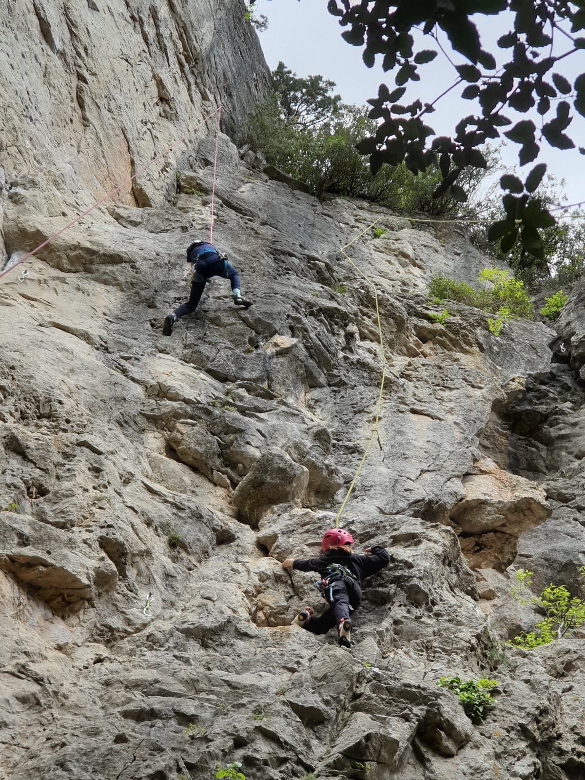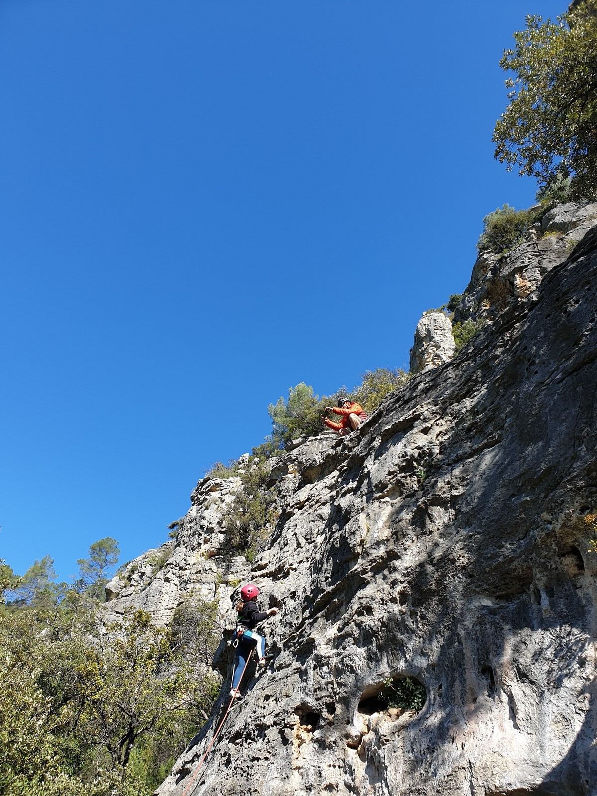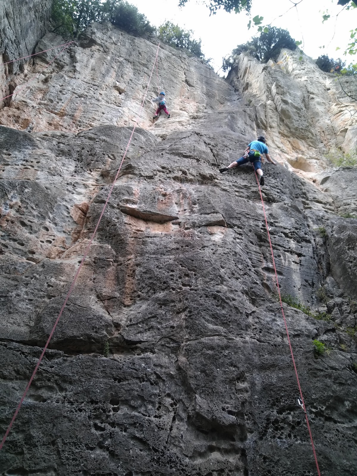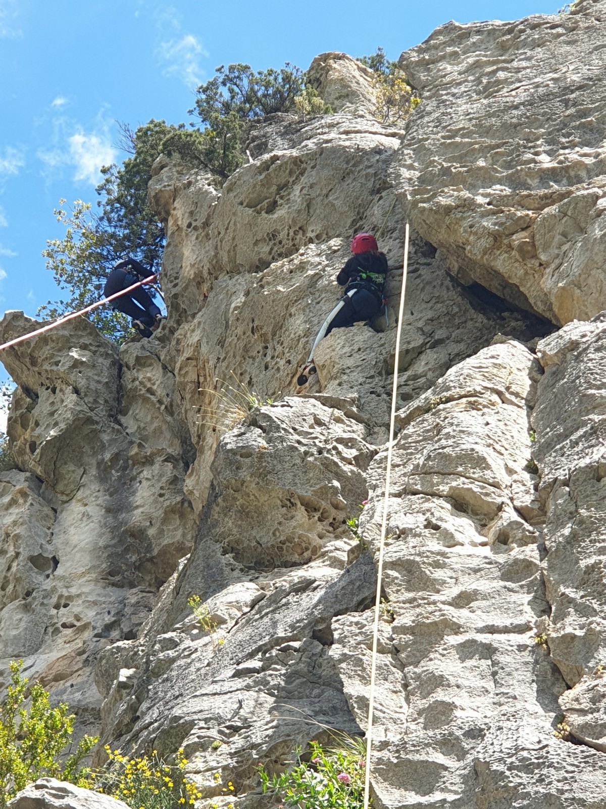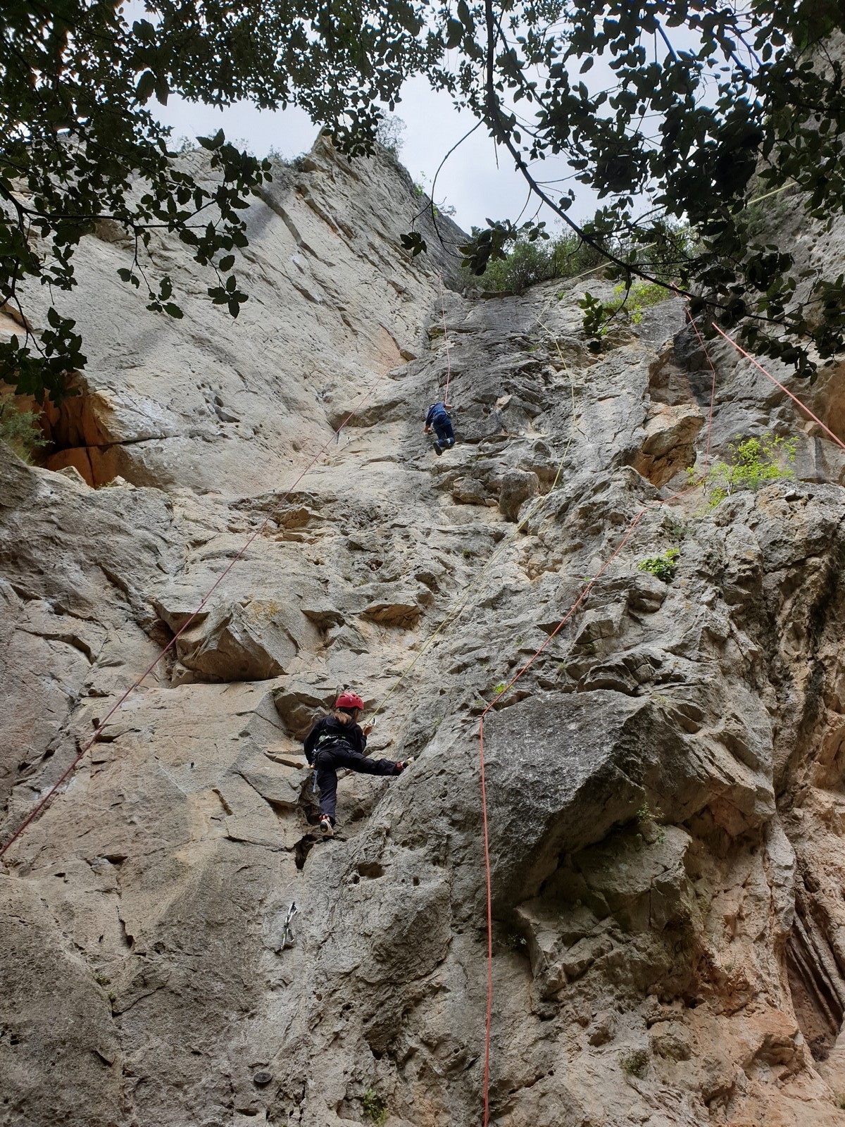Aujourd’hui nous jetons notre dévolu sur les secteurs » Tintin », tout petit secteur idéal pour réviser l’escalade en tête dans des voies courtes et faciles et le secteur situé sur la vire juste au dessus proposant des voies d’un peu plus d’ampleur jusqu’à 7a. Le côté pratique étant qu’ici lorsque nous sommes à l’étage, sur la terrasse, nous avons quasiment les pieds au niveau des relais du secteur inférieur et c’est ainsi que les jeunes novices peuvent sereinement réviser ou même apprendre à faire la « manip » nécessaire lorsque l’on grimpe en tête. Aujourd’hui le soleil est présent mais le petit vent s’engouffrant dans le « vallon sourn » nous raffermit les chairs et nous interdit toute escalade en t-shirt. Les grimpeurs s’activent avec plus ou moins d’intensité et à 20 grimpeurs, la quasitotalité des voies sont prises. Mathis et Esteban vont grimper sur un bout de caillou juste à côté pour installer une moulinette dans un très long 6a, tandis que Léane s’essaie dans le superbe 7a du secteur « Caldoquie » à la difficulté concentrée dans les permiers mètres. Elle chute dans le passage difficile, et avec elle son humeur. Sylvain installe le superbe 6b+ juste à côté pour offrir aux plus motivés une voie de 35m abordable qui sera écumée toute la journée ! An fin de matinée, nous sommes rejoints par les parents de Rose et Lilas, Didier et Amandine, ainsi que Prune la soeur, qui dorment dans un camping car non loin du vallon. Avec eux débarquent Rebecca et Marion avec sa fille Maya, qu’on retrouvera tout au long du séjour.