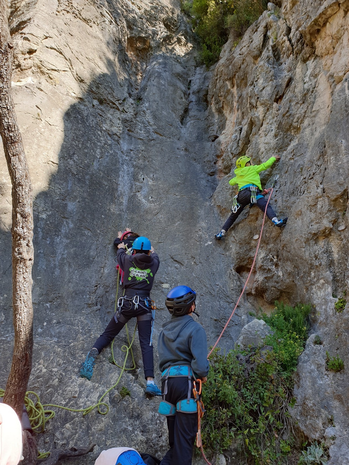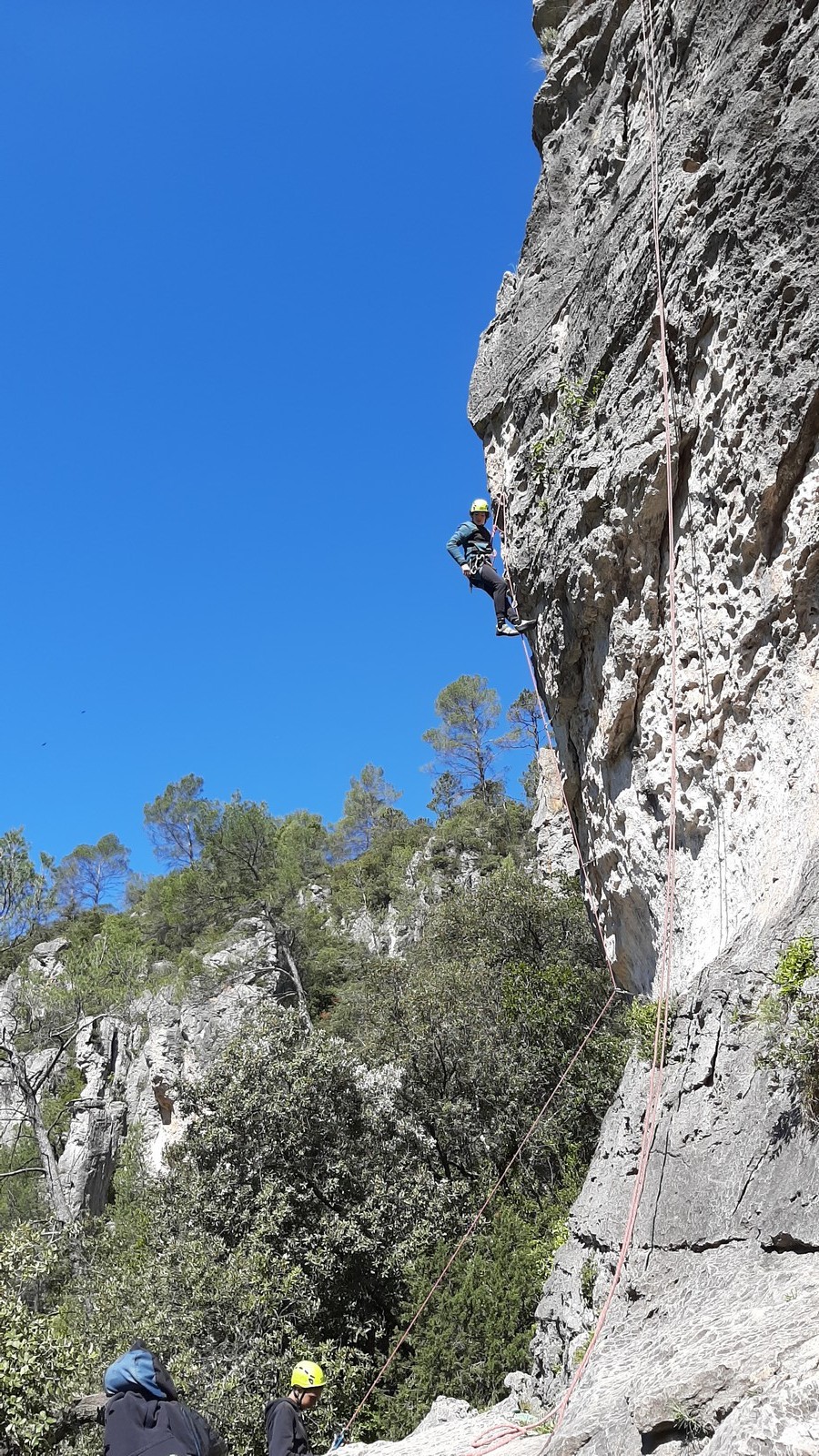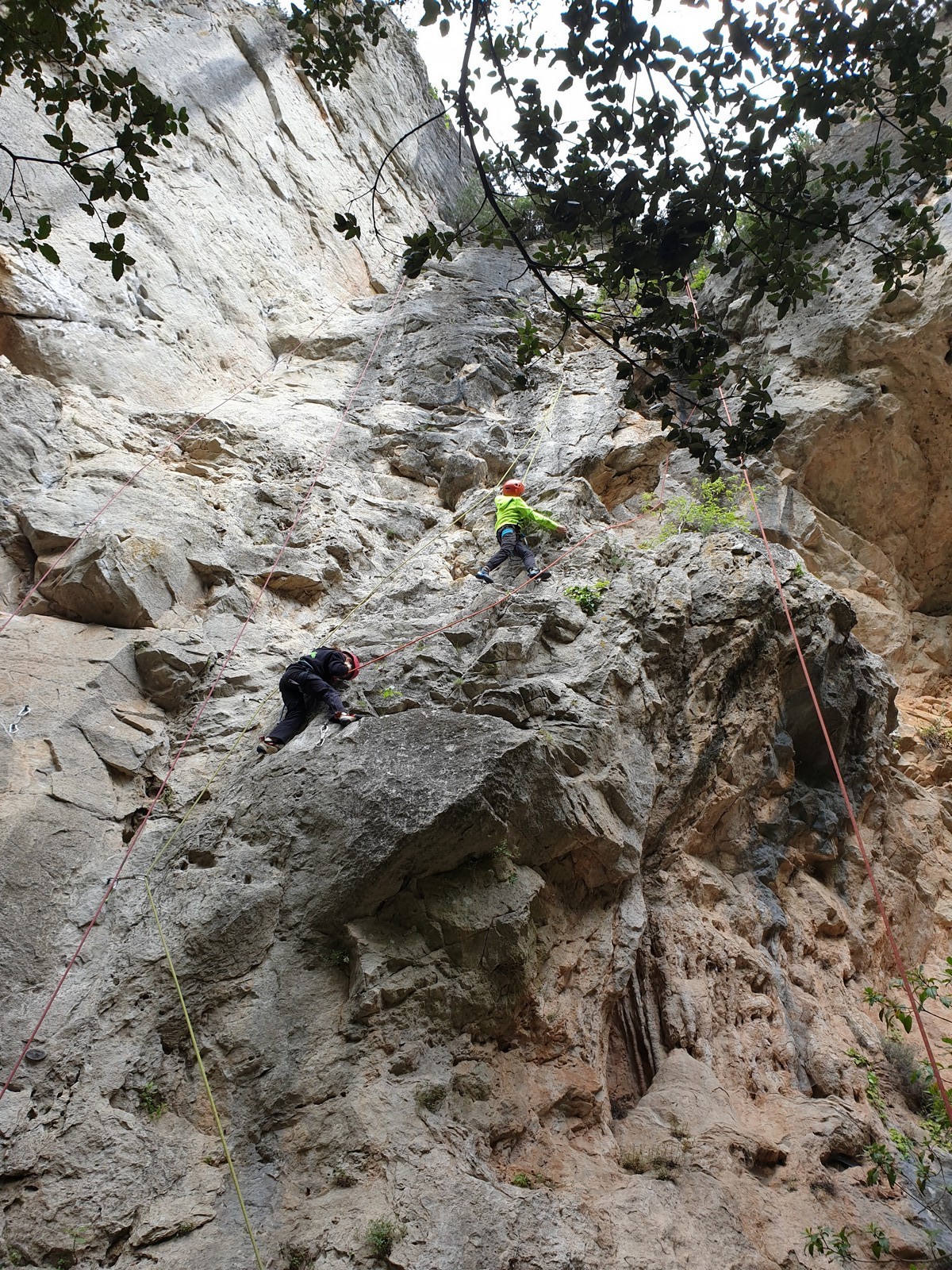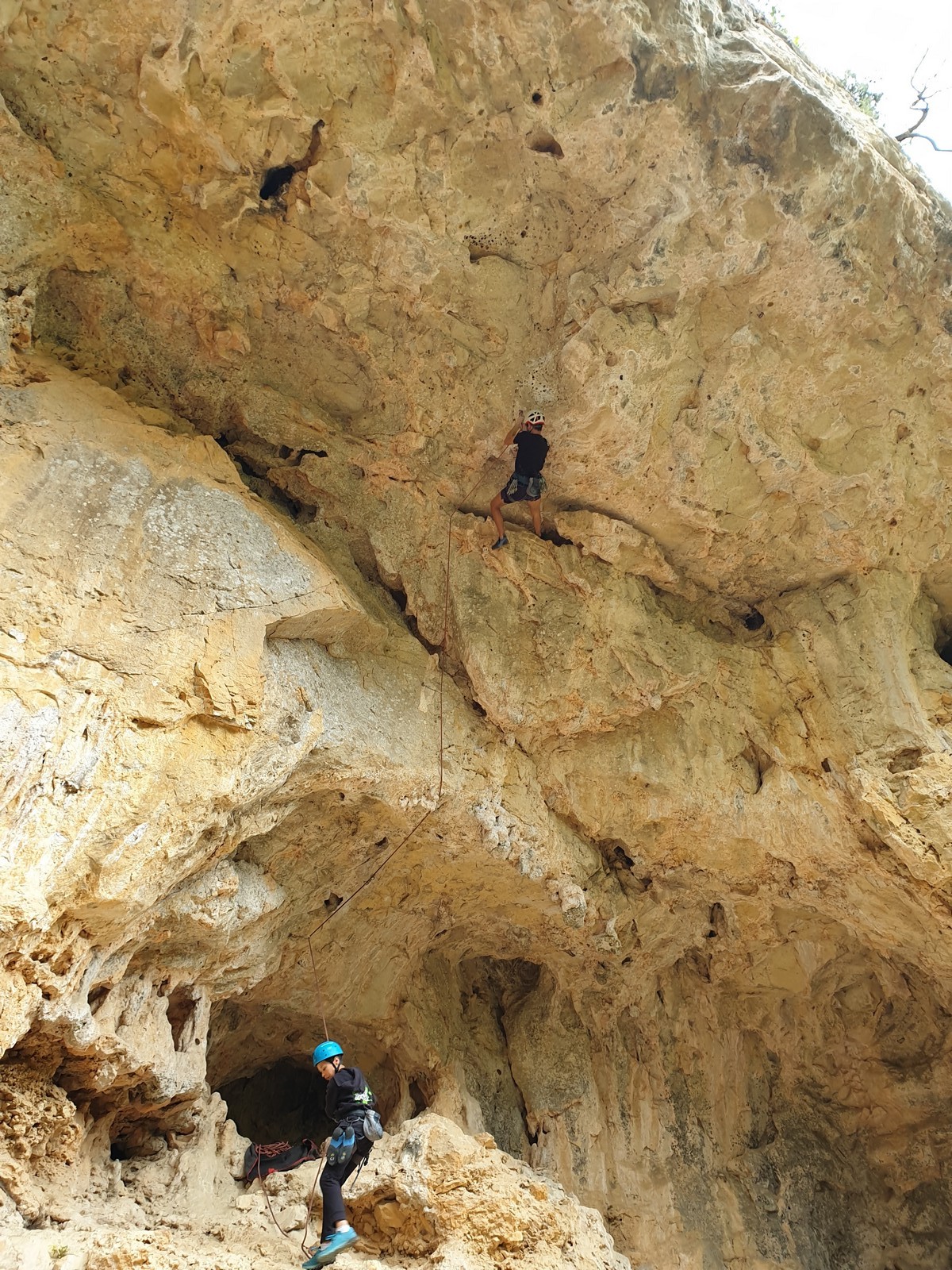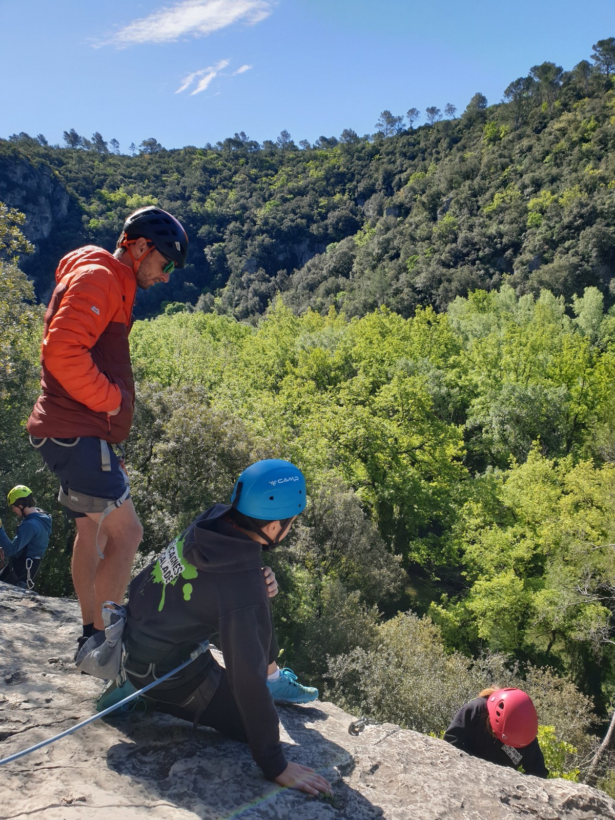 Aujourd’hui nous jetons notre dévolu sur les secteurs » Tintin », tout petit secteur idéal pour réviser l’escalade en tête dans des voies courtes et faciles et le secteur situé sur la vire juste au dessus proposant des voies d’un peu plus d’ampleur jusqu’à 7a. Le côté pratique étant qu’ici lorsque nous sommes à l’étage, sur la terrasse, nous avons quasiment les pieds au niveau des relais du secteur inférieur et c’est ainsi que les jeunes novices peuvent sereinement réviser ou même apprendre à faire la « manip » nécessaire lorsque l’on grimpe en tête. Aujourd’hui le soleil est présent mais le petit vent s’engouffrant dans le « vallon sourn » nous raffermit les chairs et nous interdit toute escalade en t-shirt. Les grimpeurs s’activent avec plus ou moins d’intensité et à 20 grimpeurs, la quasitotalité des voies sont prises. Mathis et Esteban vont grimper sur un bout de caillou juste à côté pour installer une moulinette dans un très long 6a, tandis que Léane s’essaie dans le superbe 7a du secteur « Caldoquie » à la difficulté concentrée dans les permiers mètres. Elle chute dans le passage difficile, et avec elle son humeur. Sylvain installe le superbe 6b+ juste à côté pour offrir aux plus motivés une voie de 35m abordable qui sera écumée toute la journée ! An fin de matinée, nous sommes rejoints par les parents de Rose et Lilas, Didier et Amandine, ainsi que Prune la soeur, qui dorment dans un camping car non loin du vallon. Avec eux débarquent Rebecca et Marion avec sa fille Maya, qu’on retrouvera tout au long du séjour.