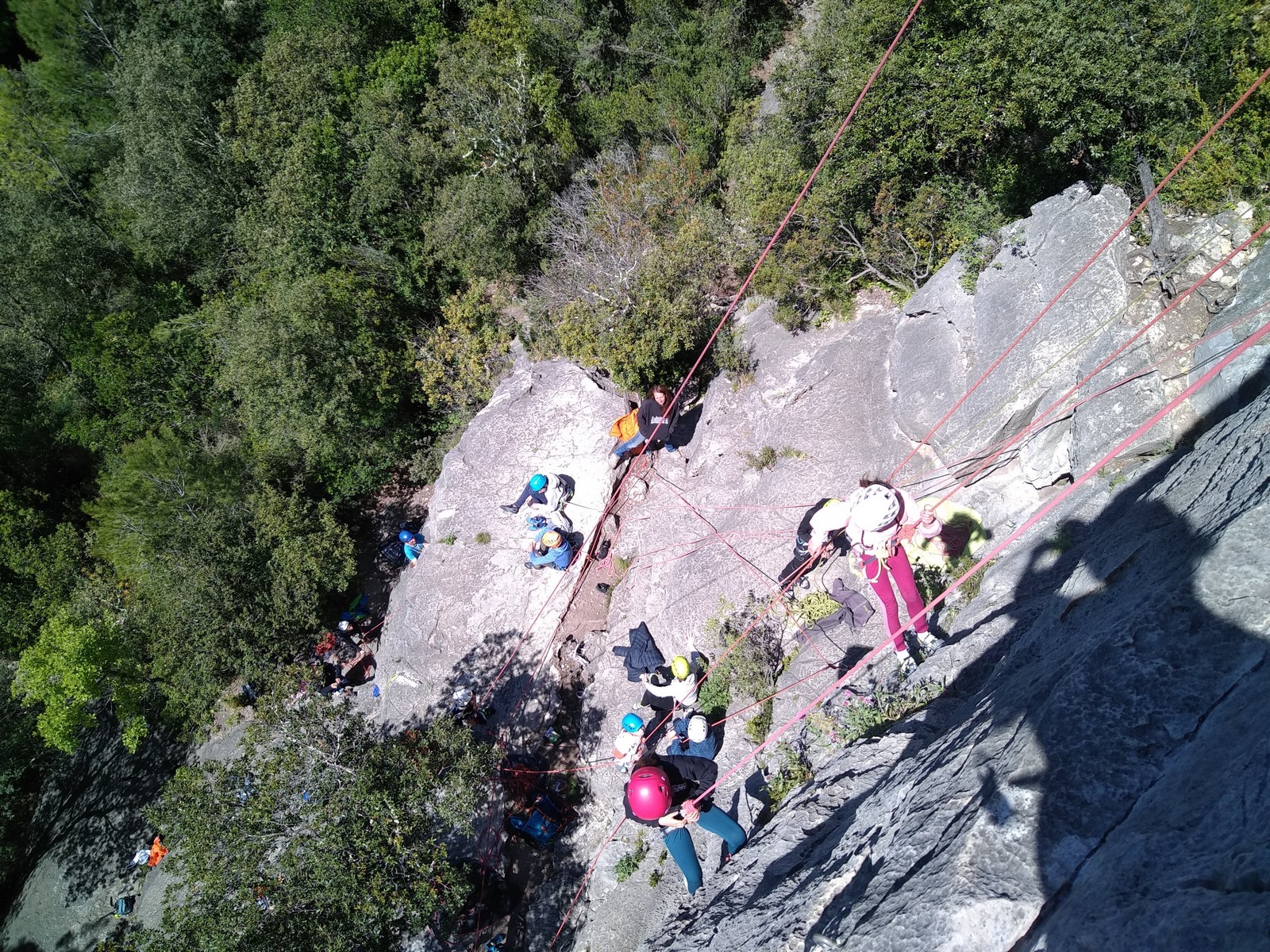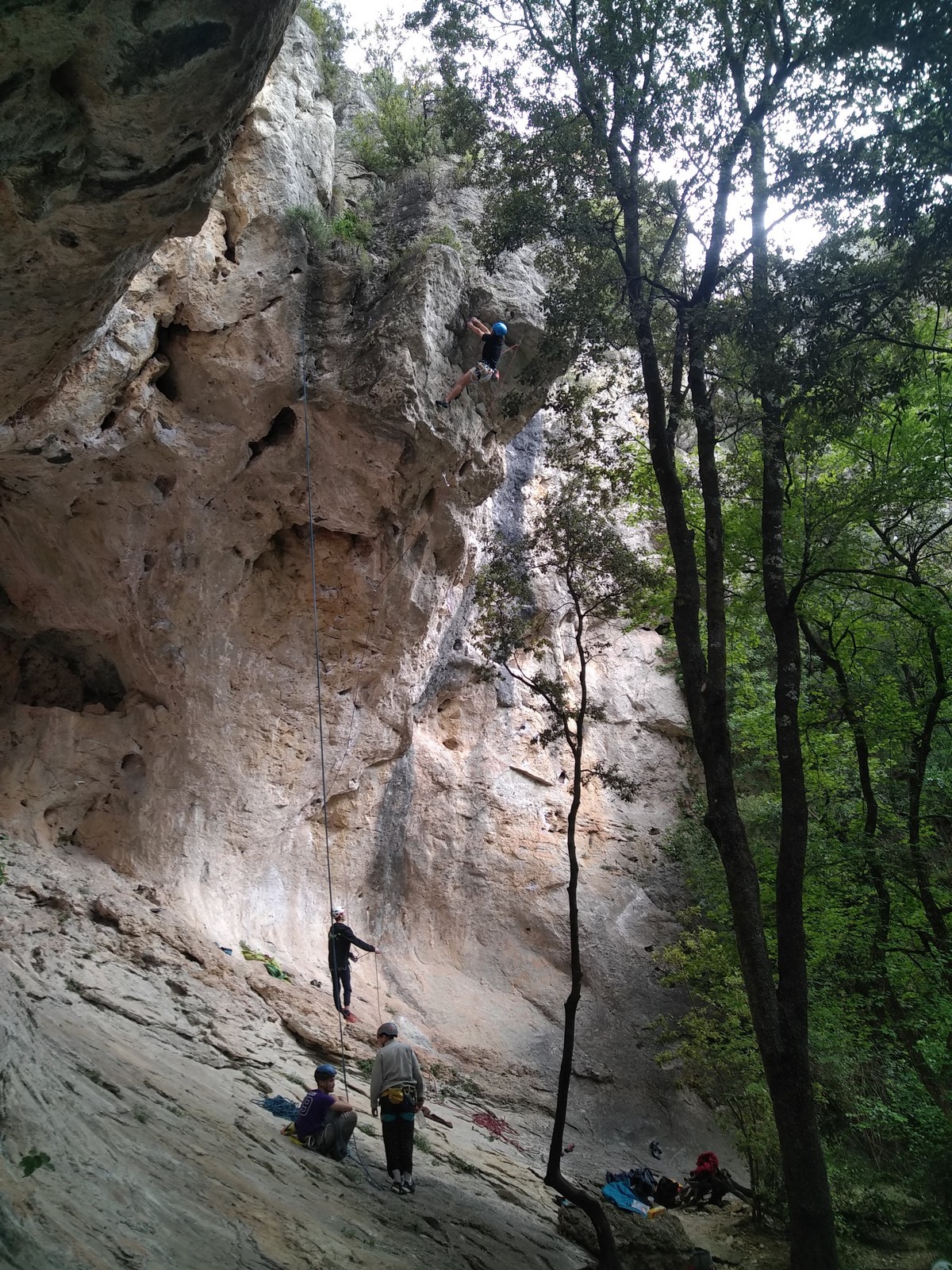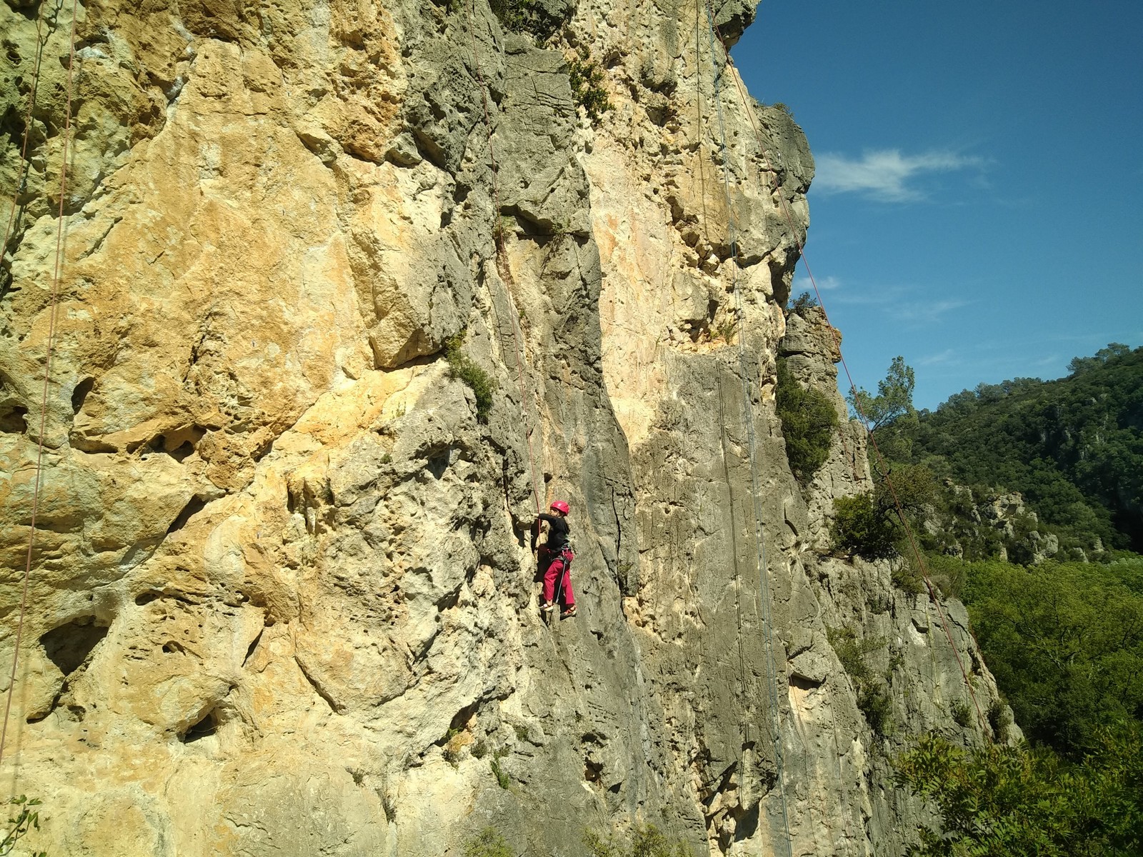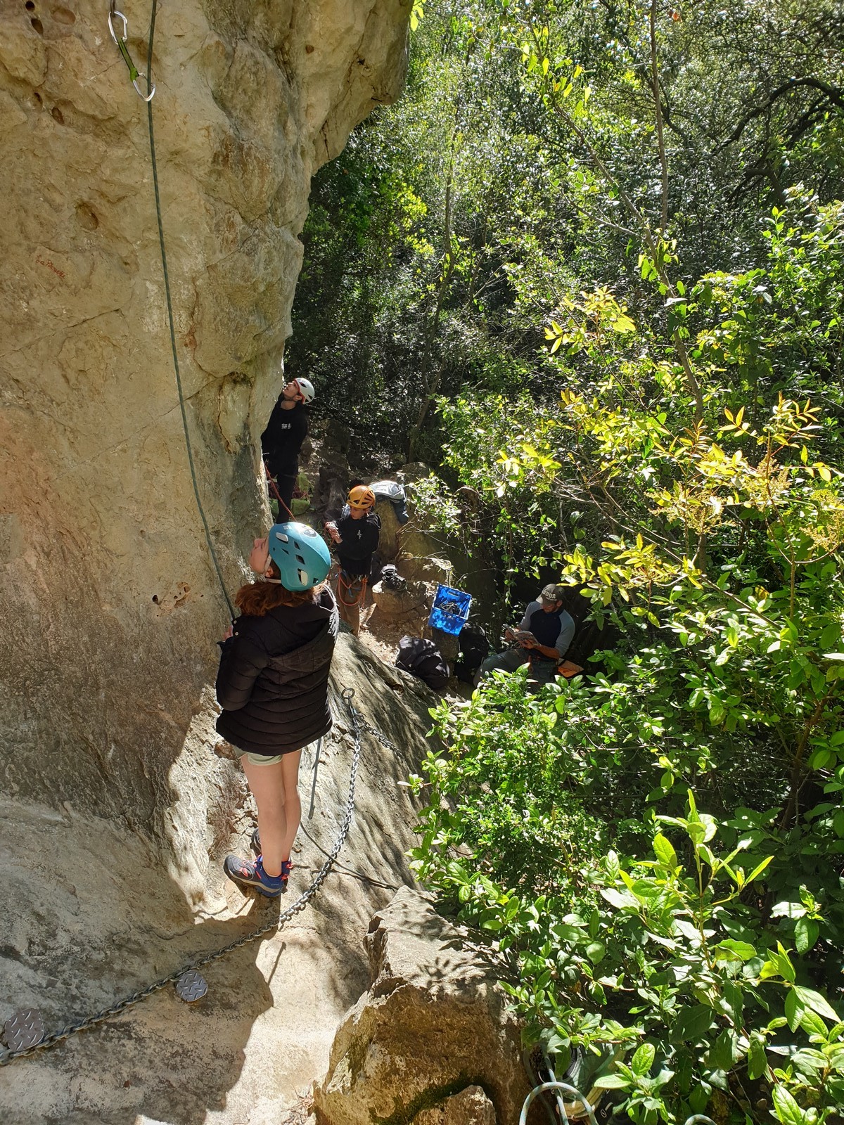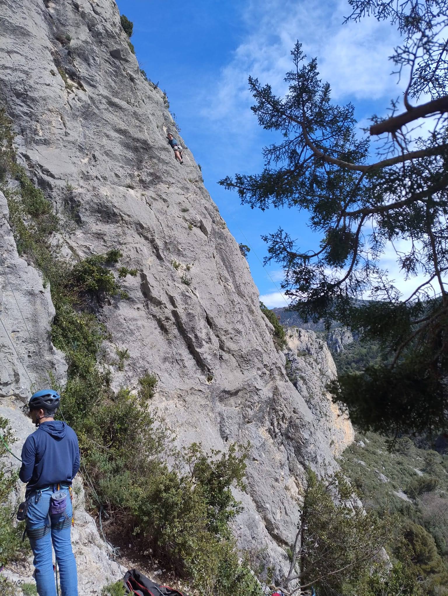 Aujourd’hui nous jetons notre dévolu sur les secteurs » Tintin », tout petit secteur idéal pour réviser l’escalade en tête dans des voies courtes et faciles et le secteur situé sur la vire juste au dessus proposant des voies d’un peu plus d’ampleur jusqu’à 7a. Le côté pratique étant qu’ici lorsque nous sommes à l’étage, sur la terrasse, nous avons quasiment les pieds au niveau des relais du secteur inférieur et c’est ainsi que les jeunes novices peuvent sereinement réviser ou même apprendre à faire la « manip » nécessaire lorsque l’on grimpe en tête. Aujourd’hui le soleil est présent mais le petit vent s’engouffrant dans le « vallon sourn » nous raffermit les chairs et nous interdit toute escalade en t-shirt. Les grimpeurs s’activent avec plus ou moins d’intensité et à 20 grimpeurs, la quasitotalité des voies sont prises. Mathis et Esteban vont grimper sur un bout de caillou juste à côté pour installer une moulinette dans un très long 6a, tandis que Léane s’essaie dans le superbe 7a du secteur « Caldoquie » à la difficulté concentrée dans les permiers mètres. Elle chute dans le passage difficile, et avec elle son humeur. Sylvain installe le superbe 6b+ juste à côté pour offrir aux plus motivés une voie de 35m abordable qui sera écumée toute la journée ! An fin de matinée, nous sommes rejoints par les parents de Rose et Lilas, Didier et Amandine, ainsi que Prune la soeur, qui dorment dans un camping car non loin du vallon. Avec eux débarquent Rebecca et Marion avec sa fille Maya, qu’on retrouvera tout au long du séjour.